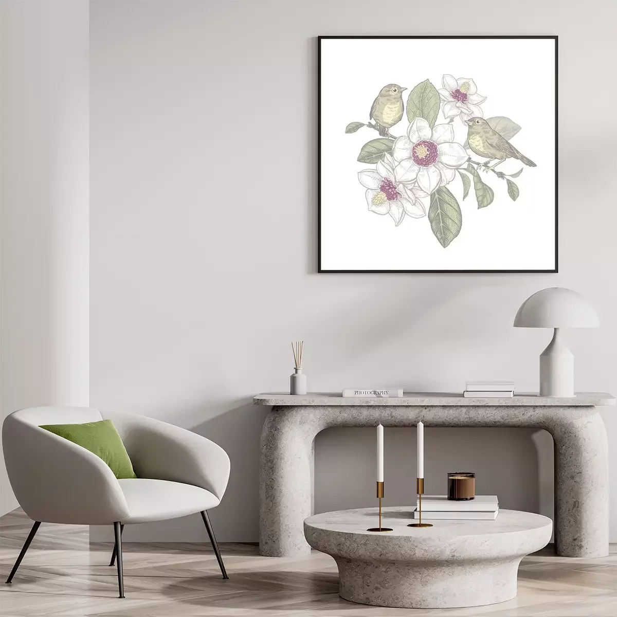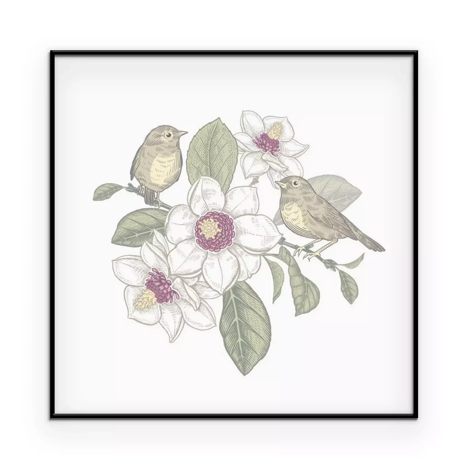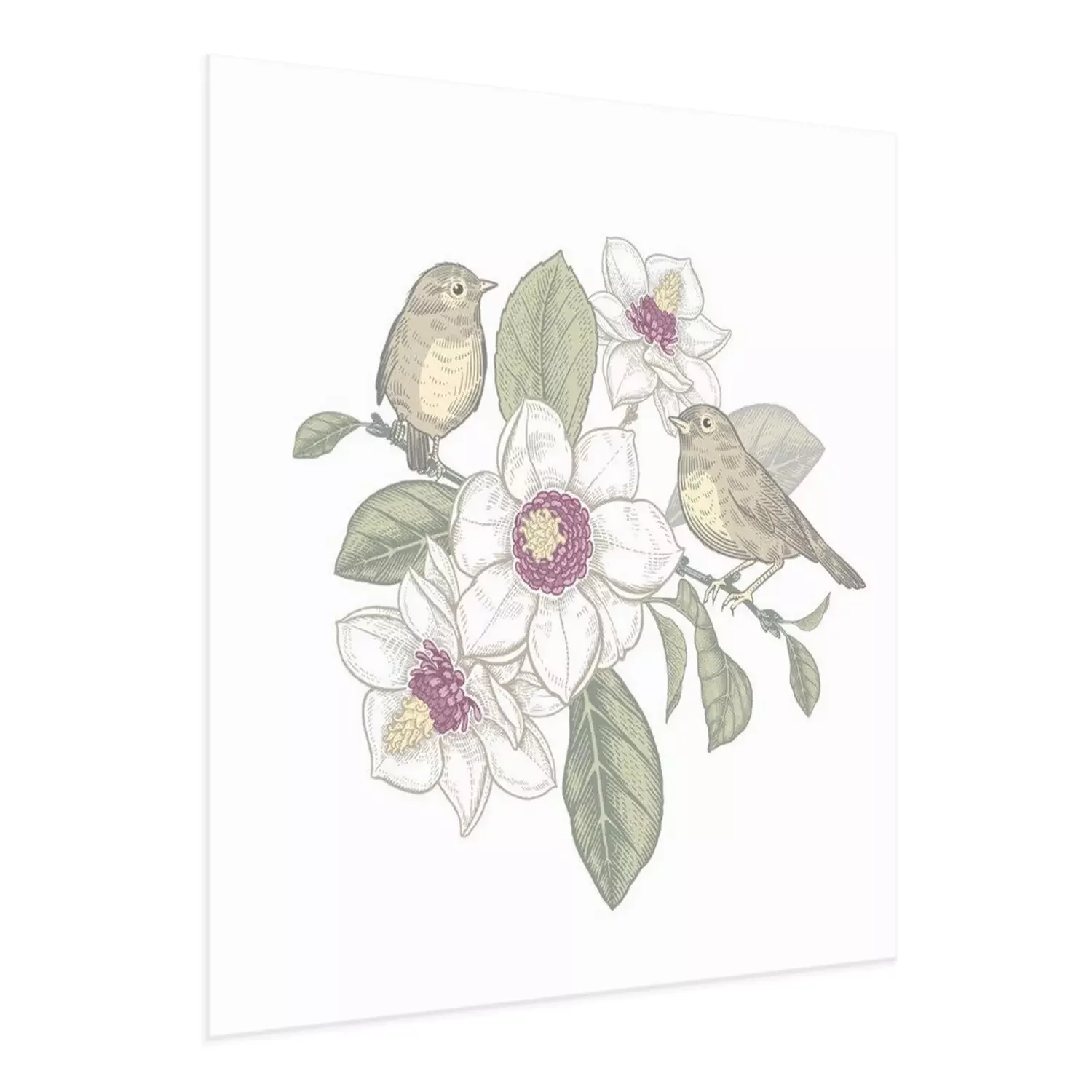 Poster: Magnoliatak en vogels in pastelkleuren
