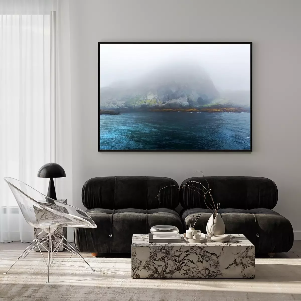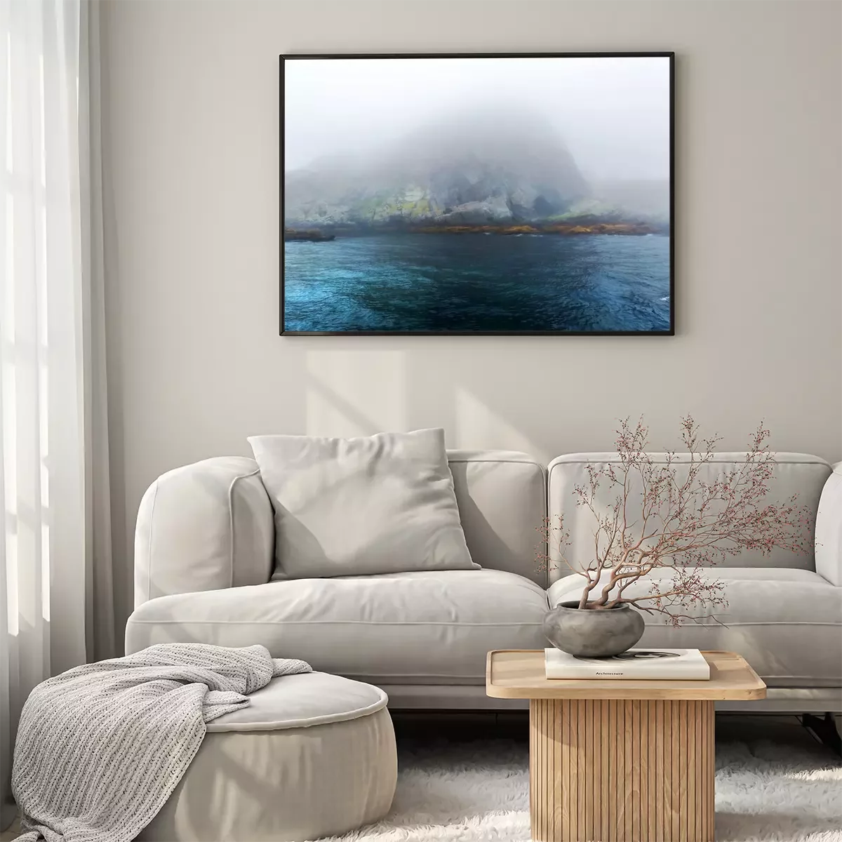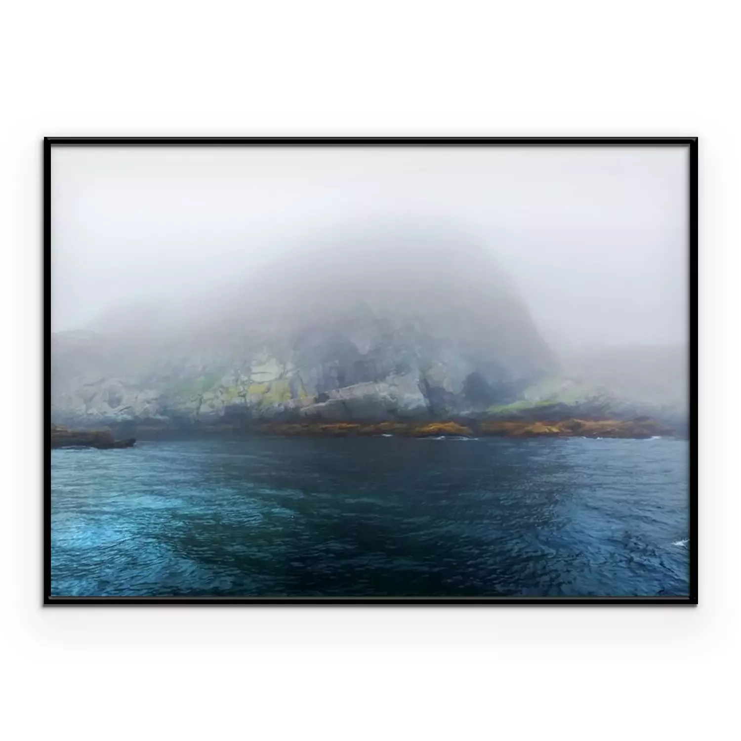 Poster: Majestic zee en rotsen in zware mist