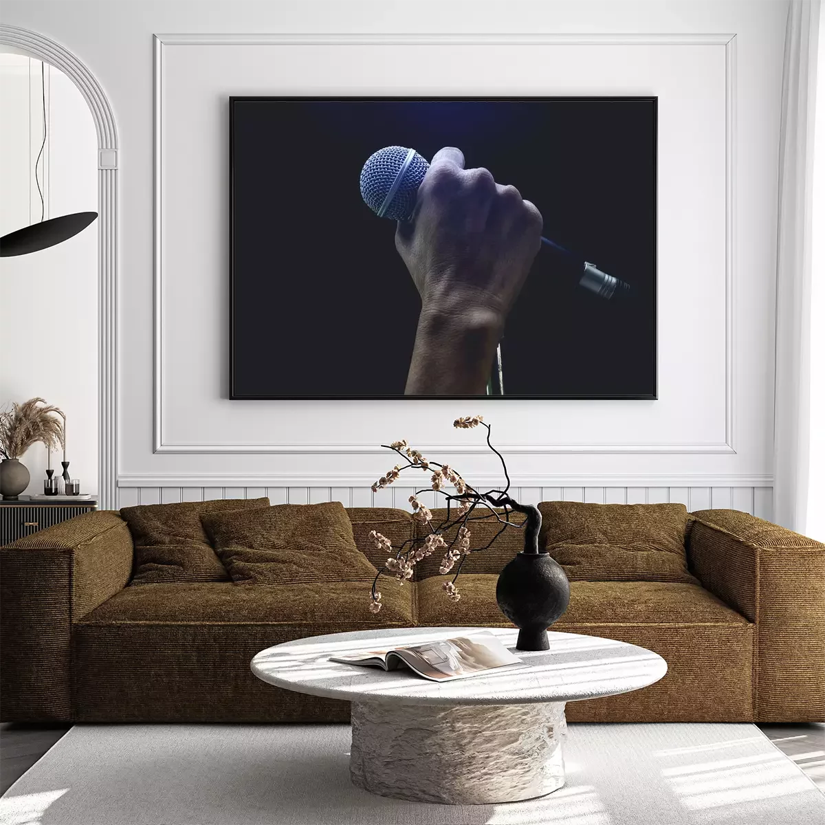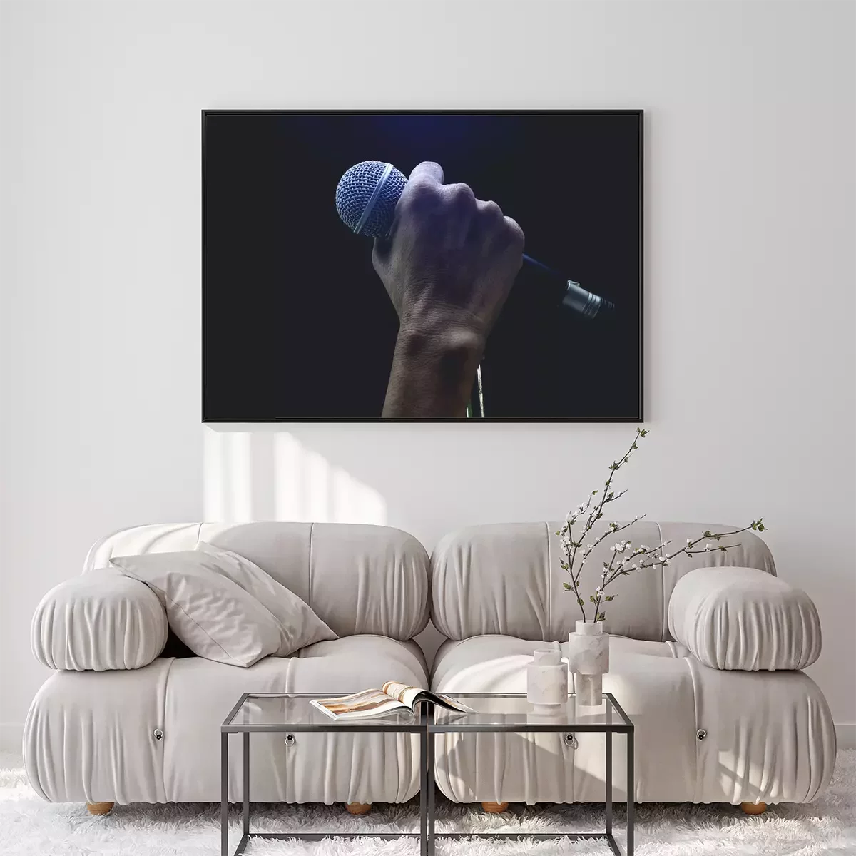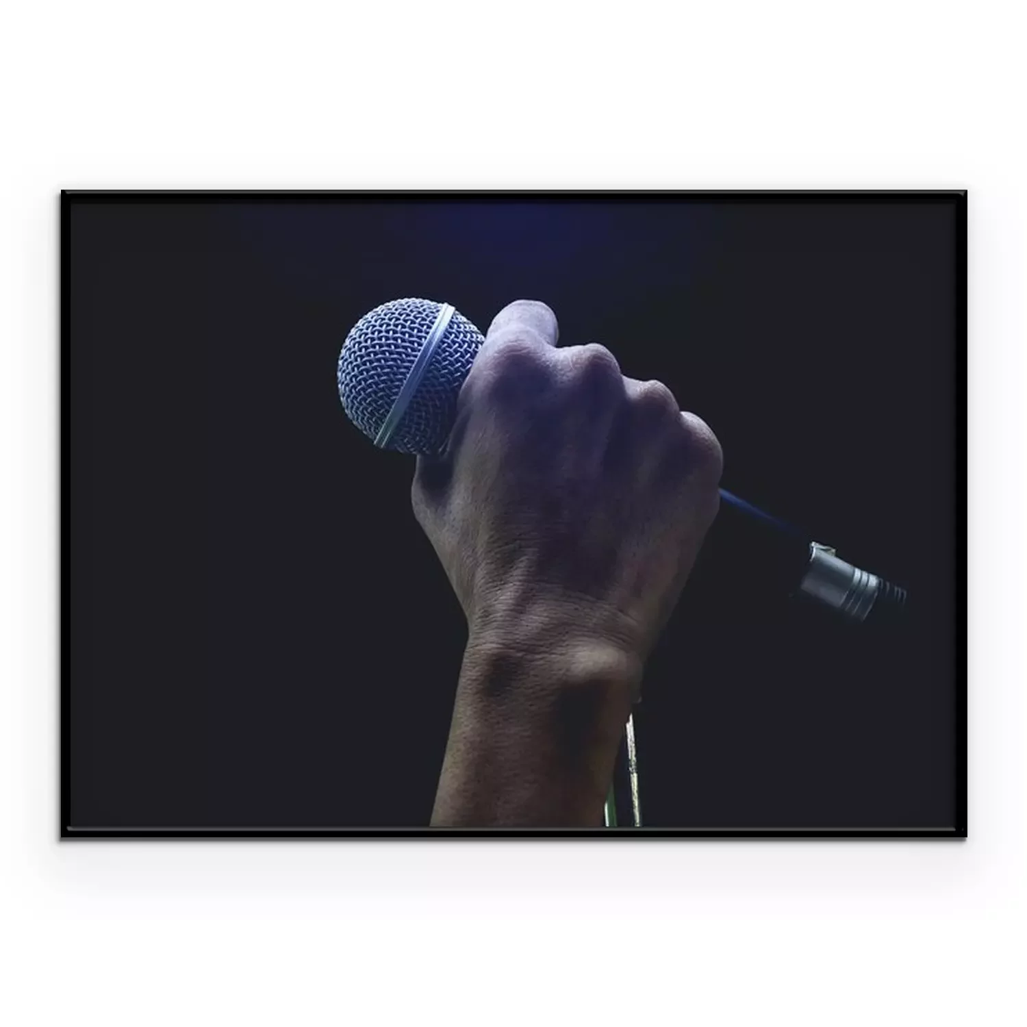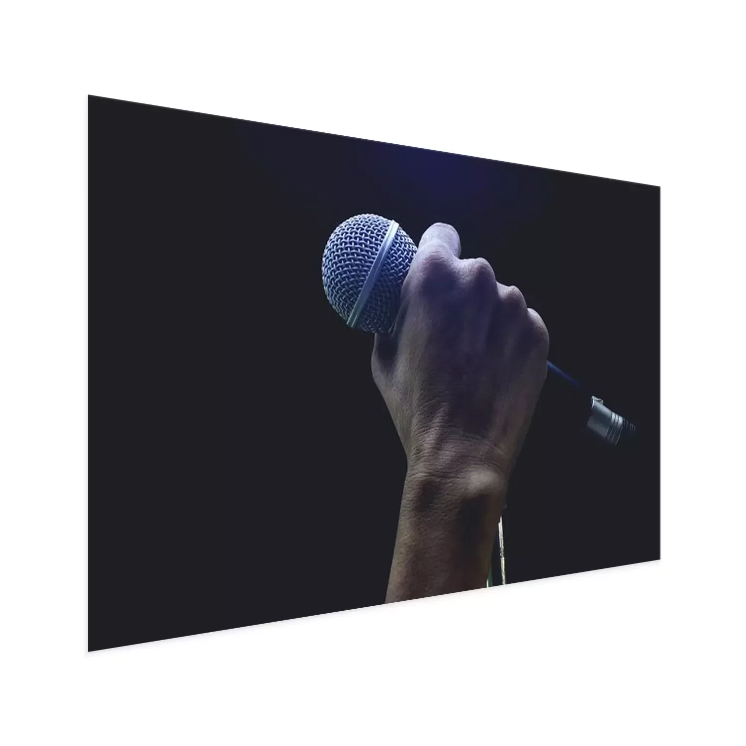 Poster: Man handen die microfoon op stand houden.