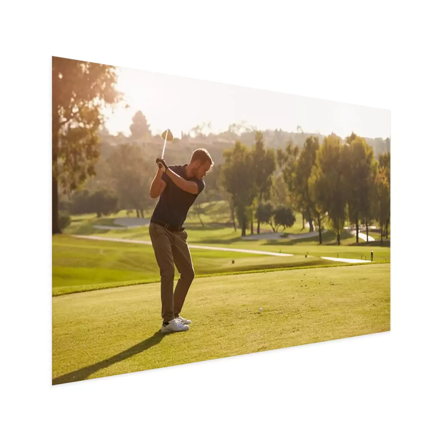Poster: Mannelijke golfer voering tee shot Aan de Golfbaan