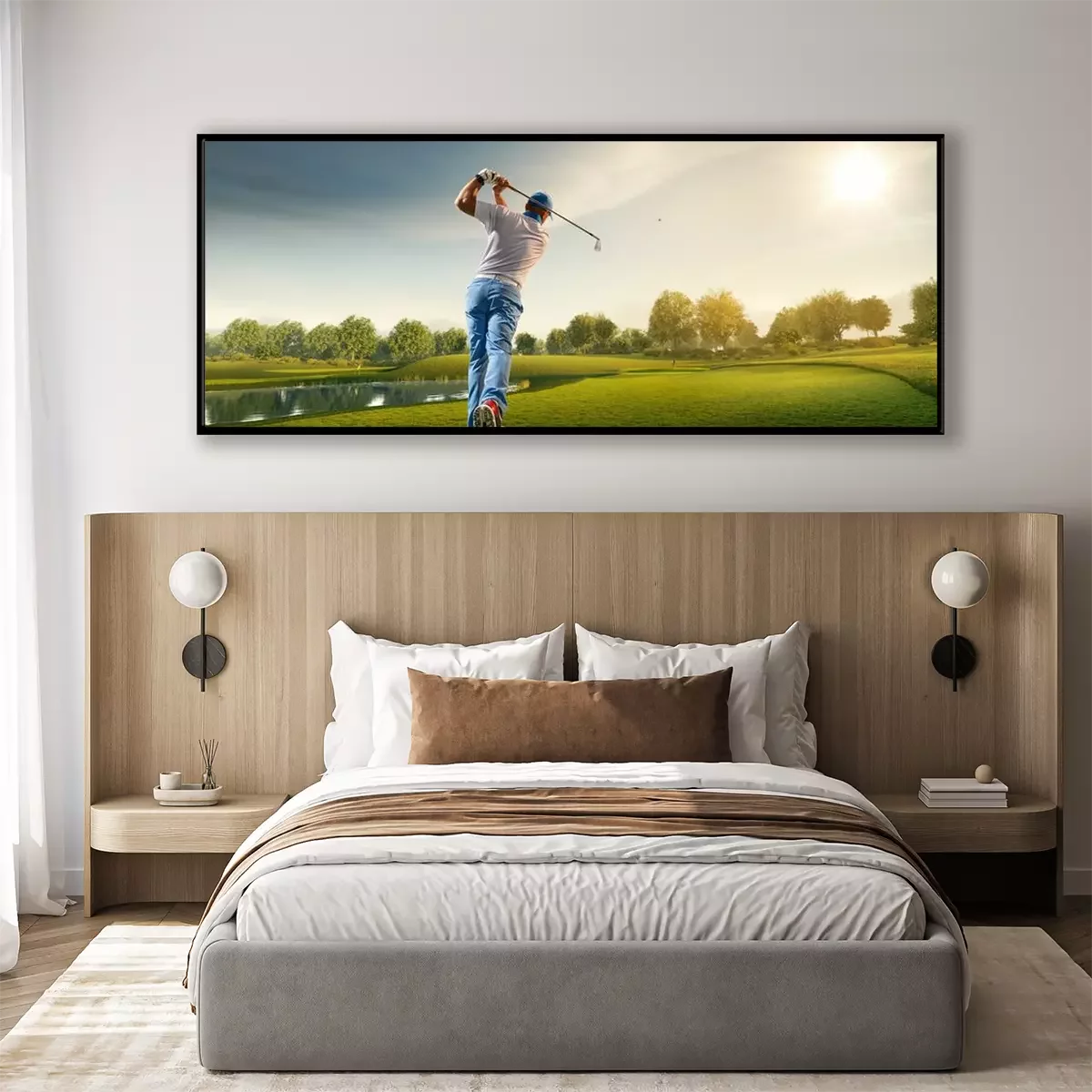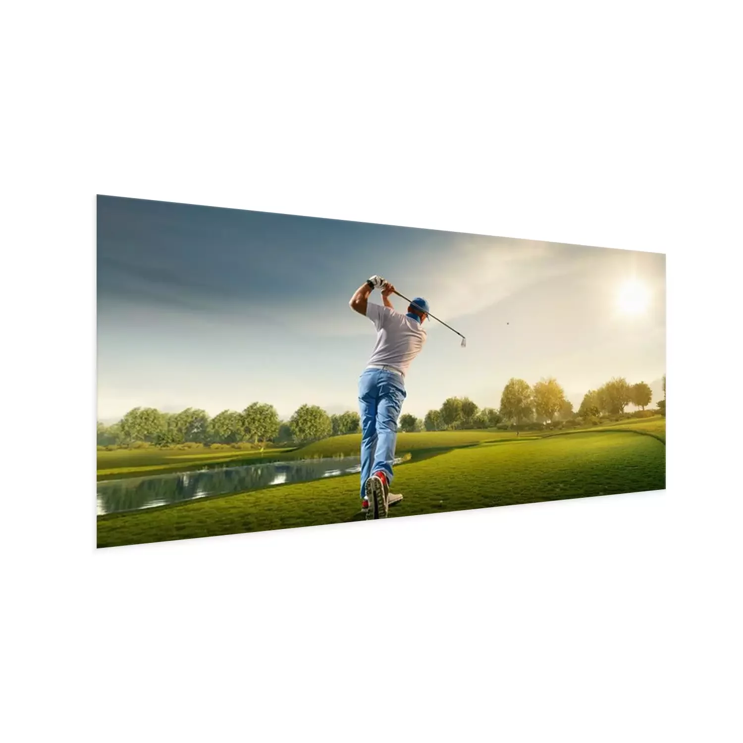 Poster: Mannelijke golfspeler op professionele golfbaan. Golfspeler met golfclub die een schot neemt