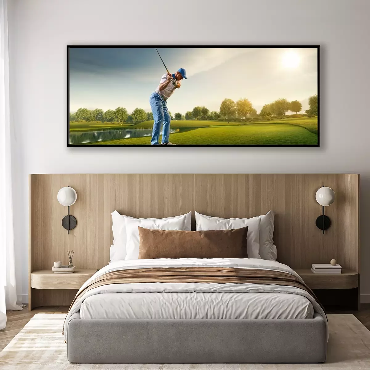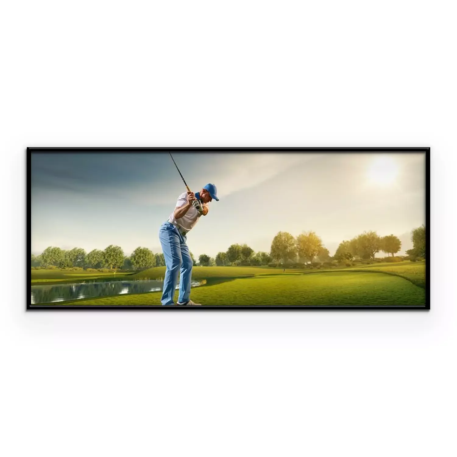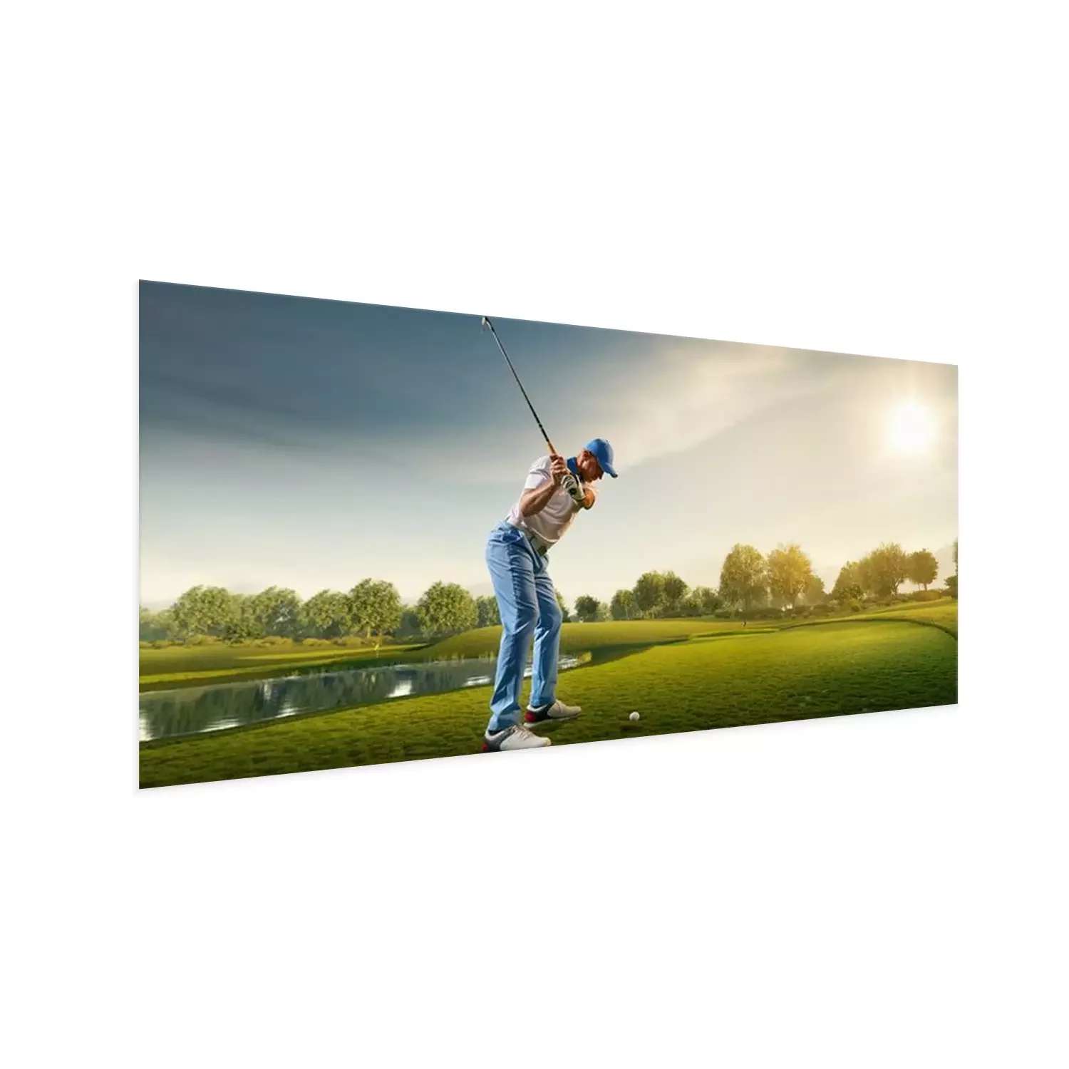 Poster: Mannelijke golfspeler op professionele golfbaan. Golfspeler met golfclub die een schot neemt