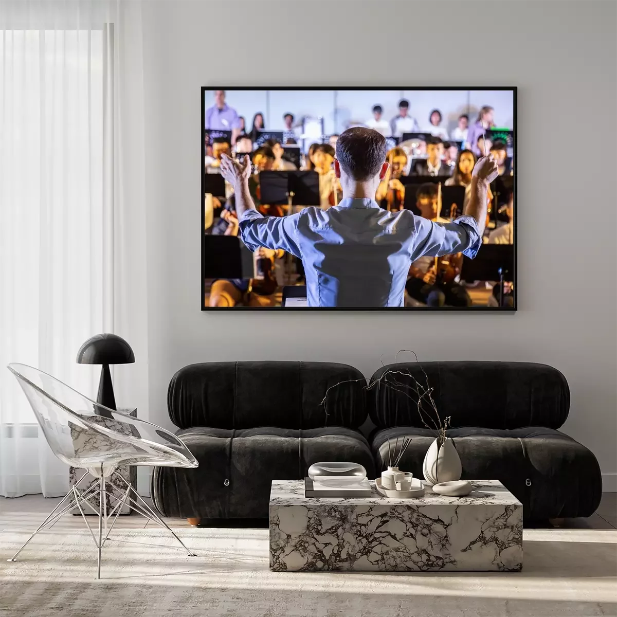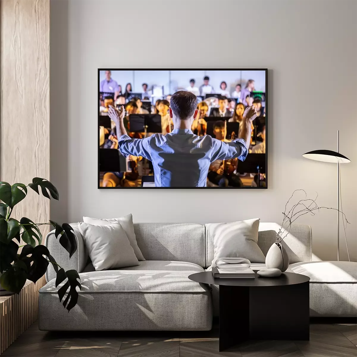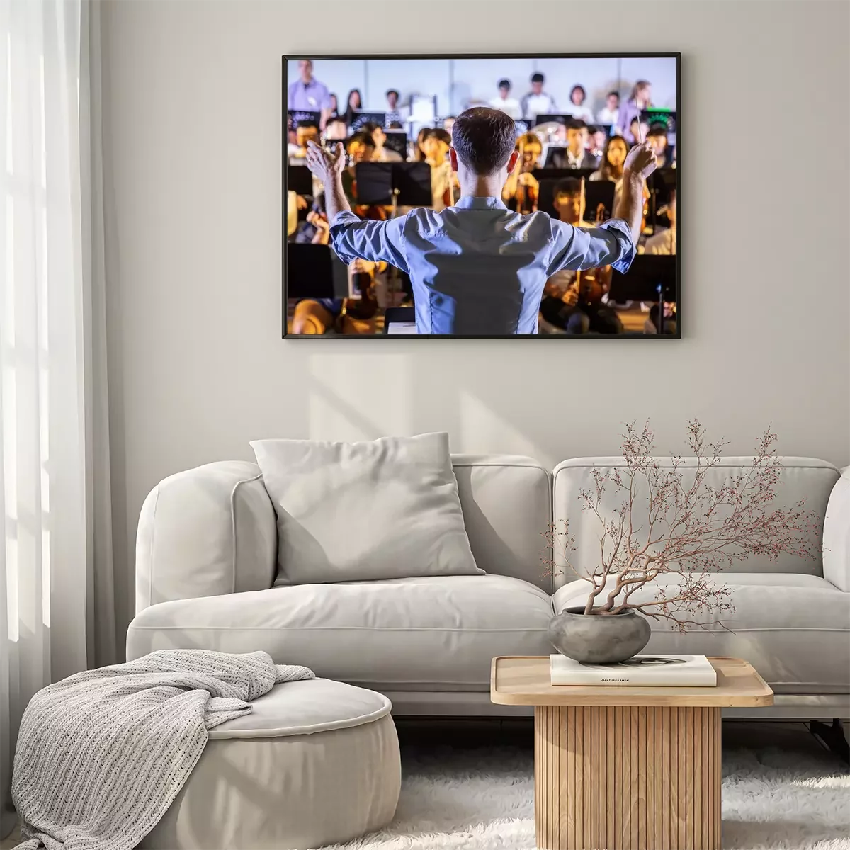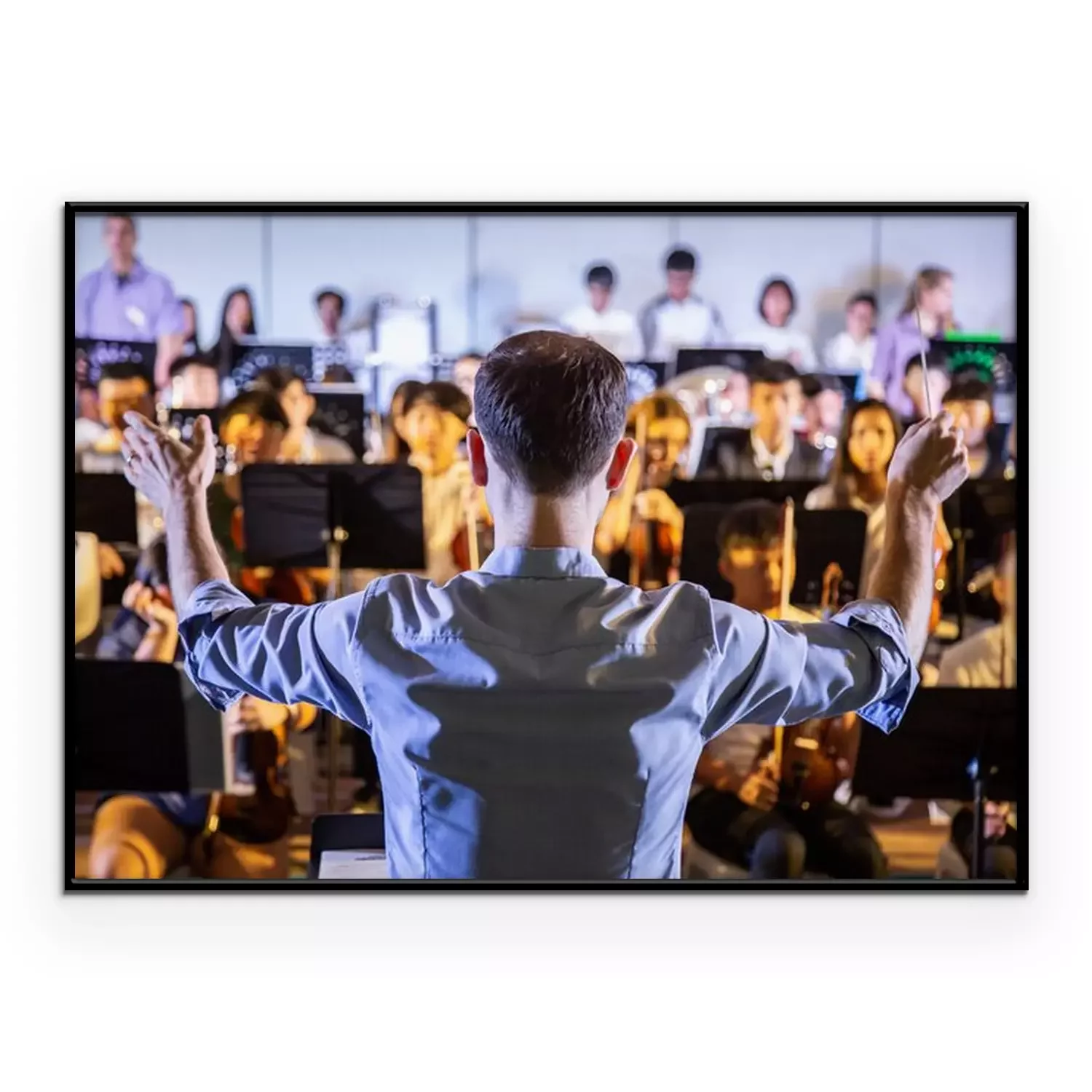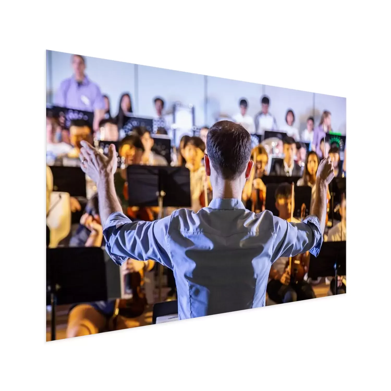 Poster: Mannelijke schooldirigent geleidt zijn studentenband om muziek te spelen in een schoolconcert