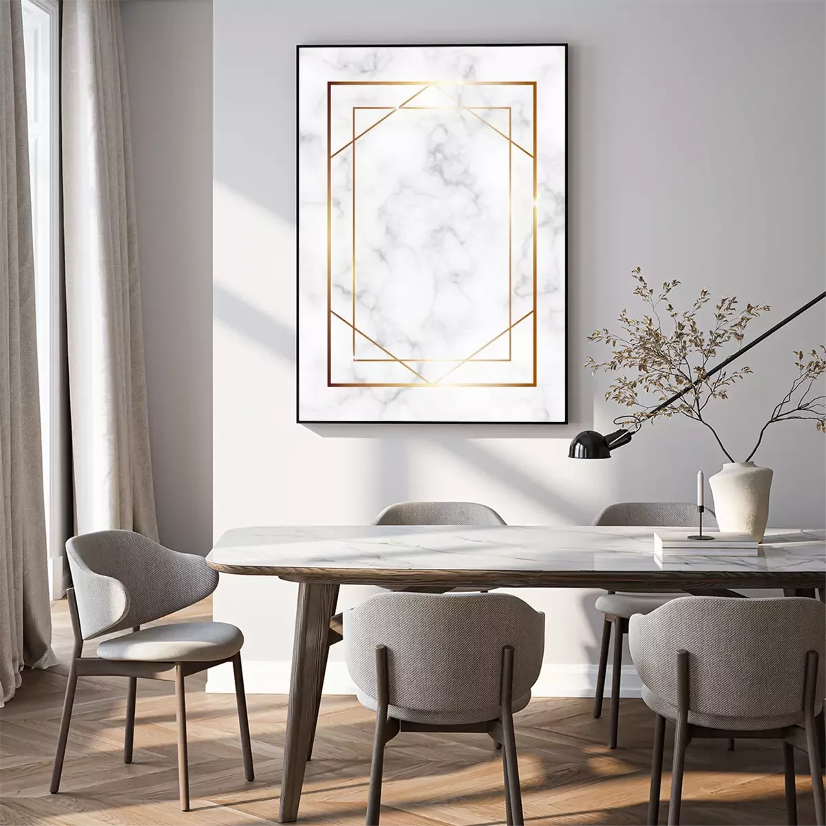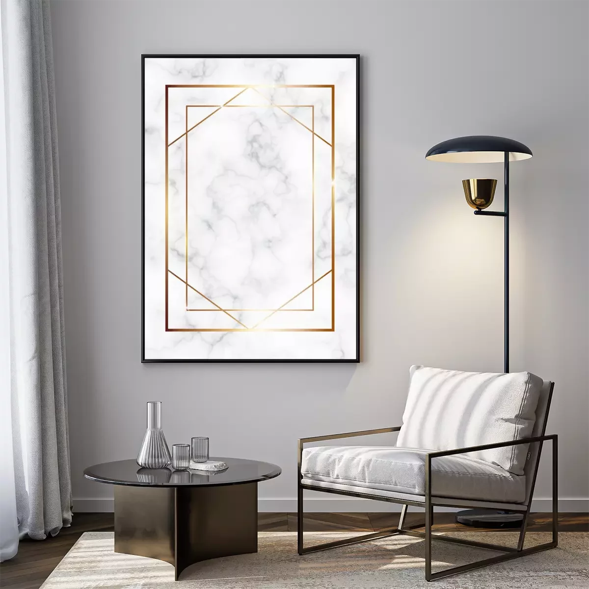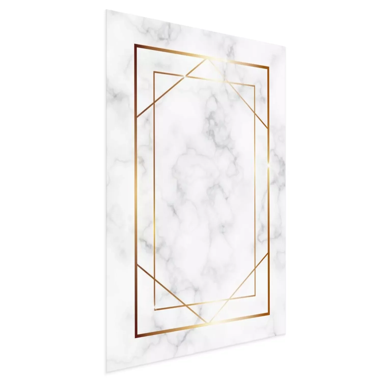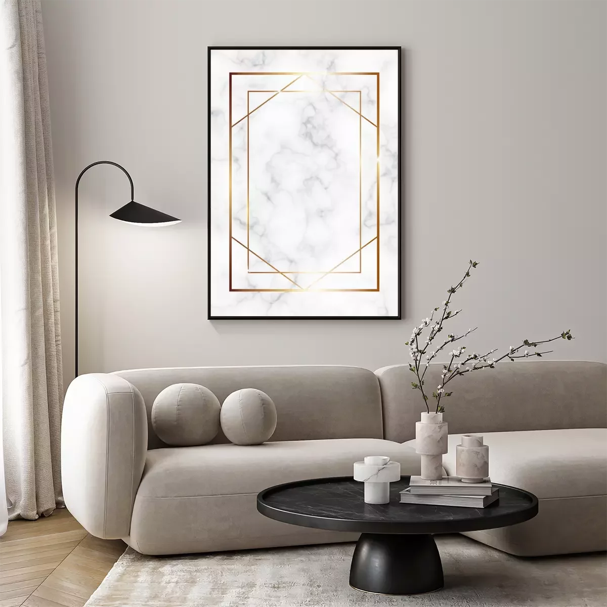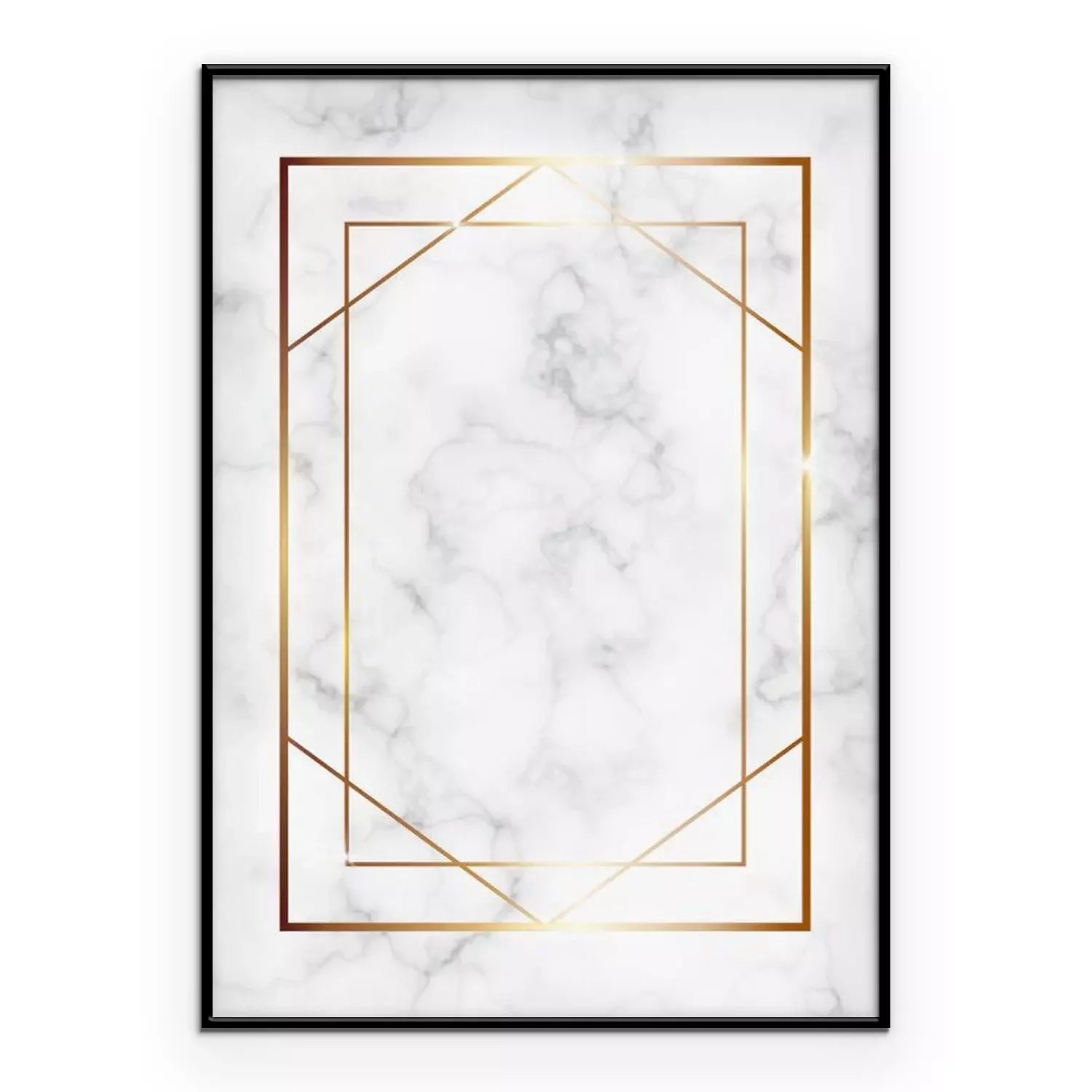 Poster Marble background with gold geometric frame. Luxury template for wedding invitation cards with white marble texture and golden geometric pattern.