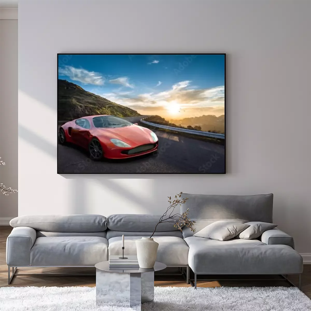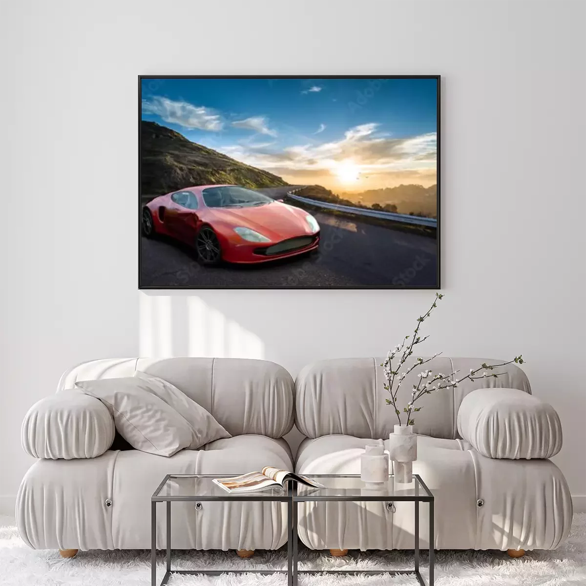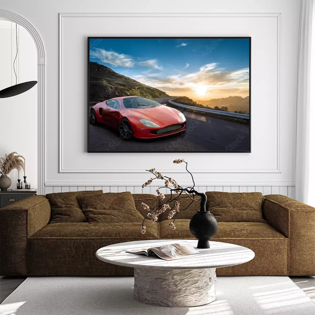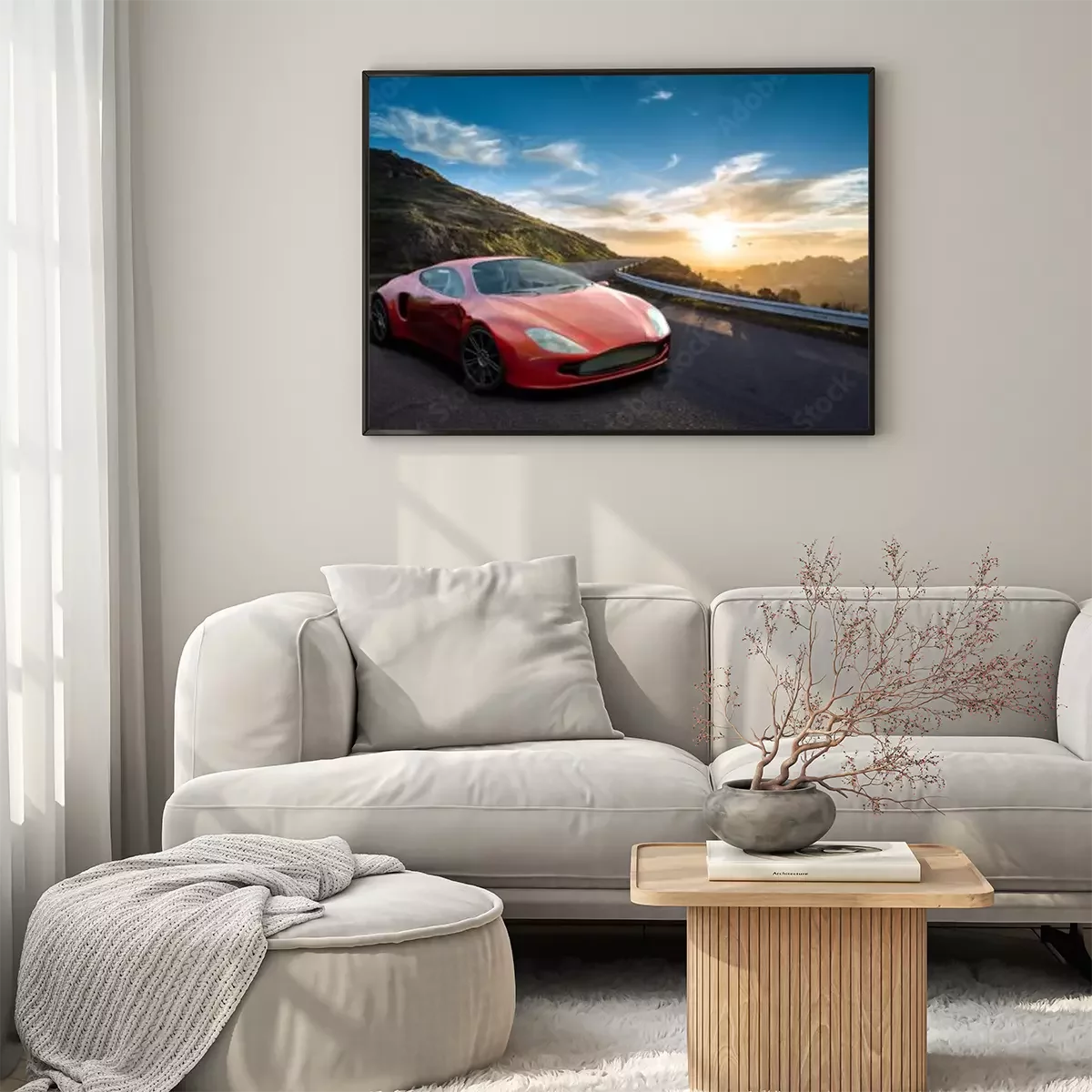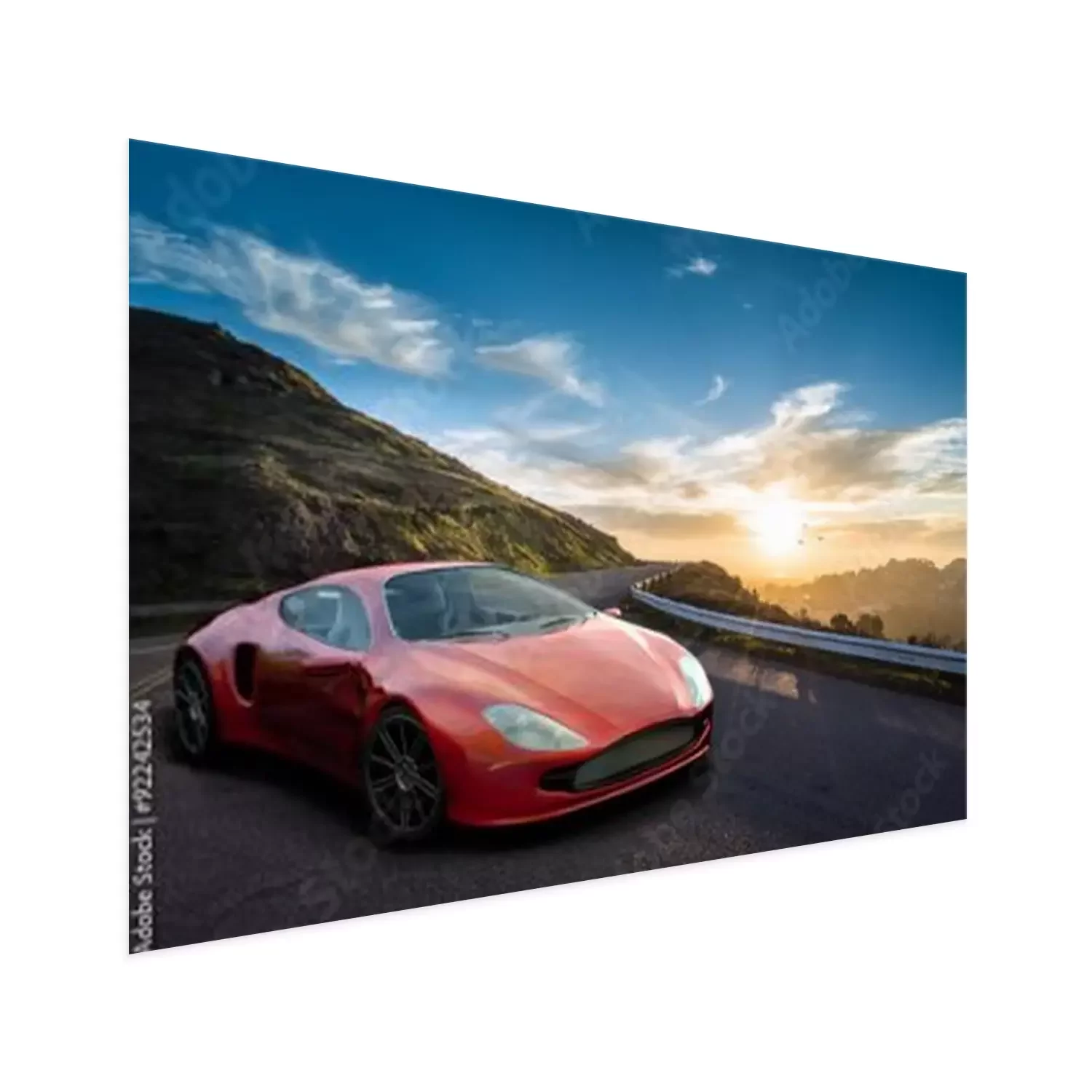 Poster Markenfreier concept Sportwagen vor Sonnenuntergang in den Bergen