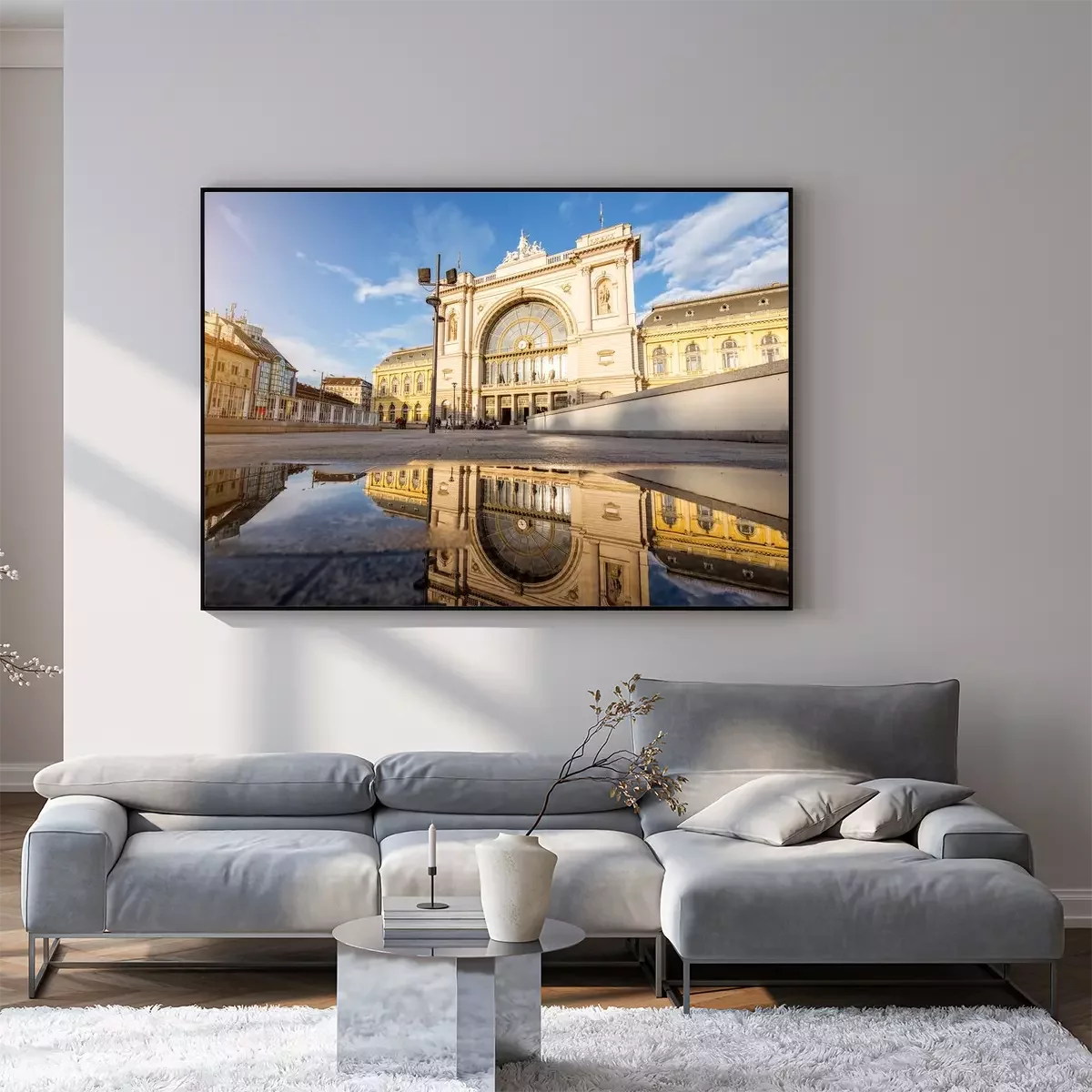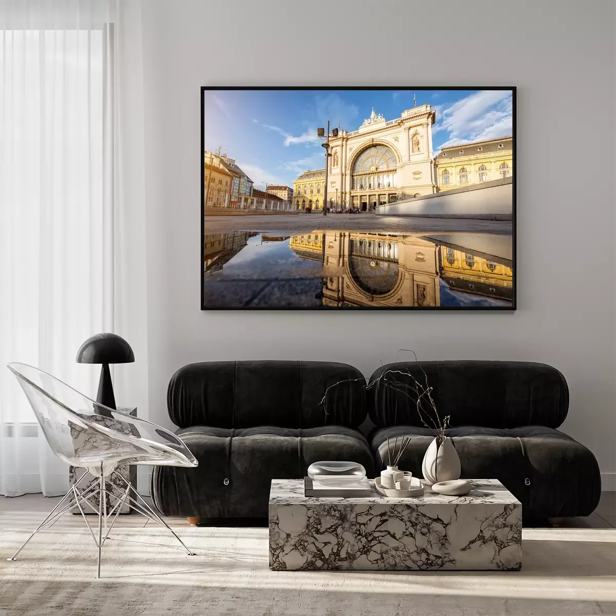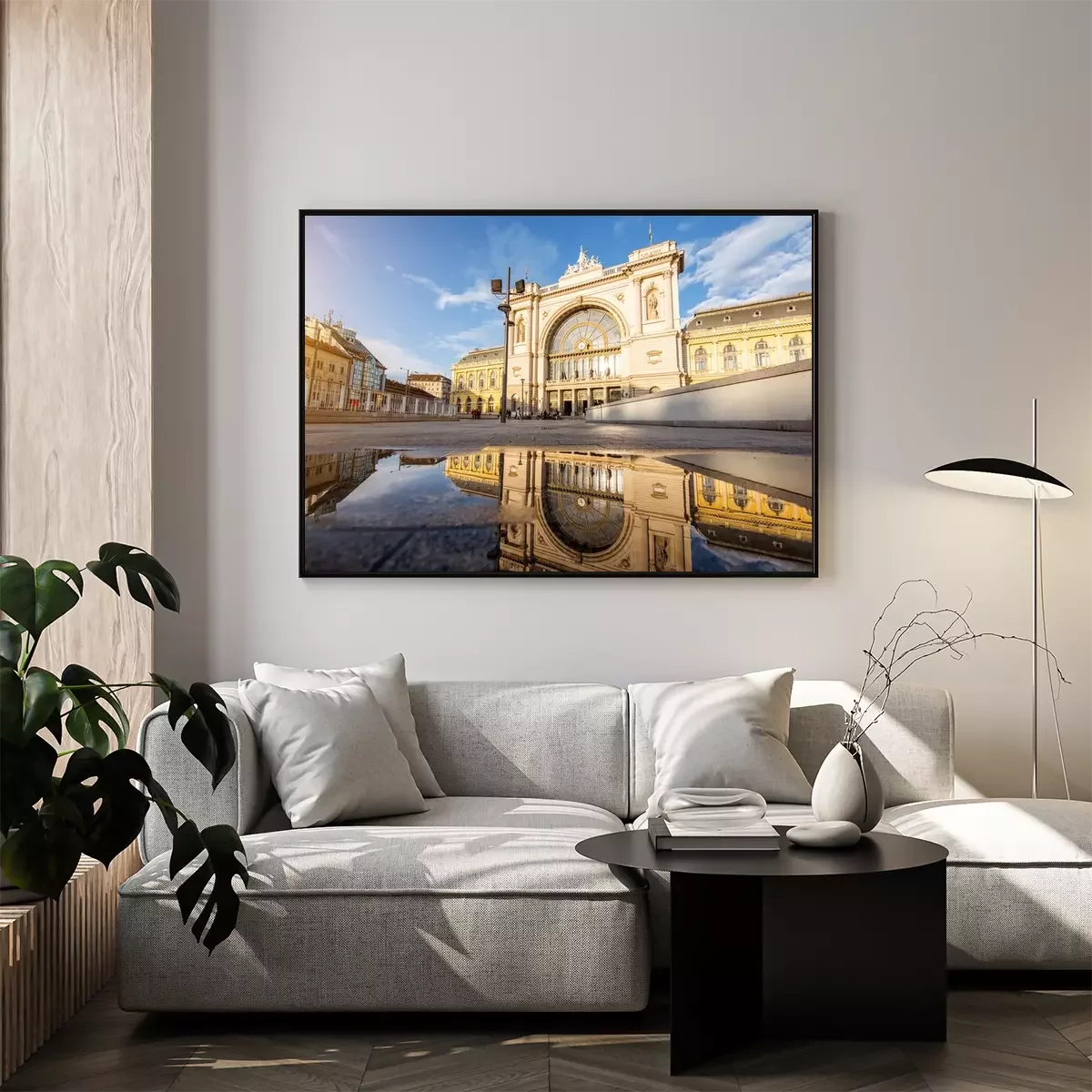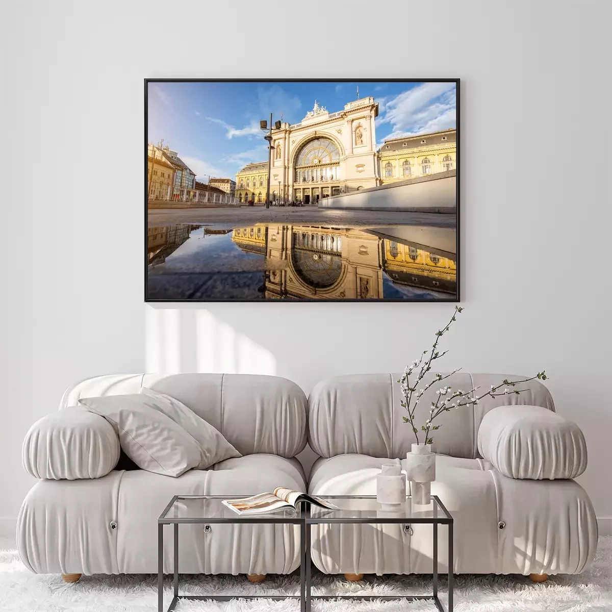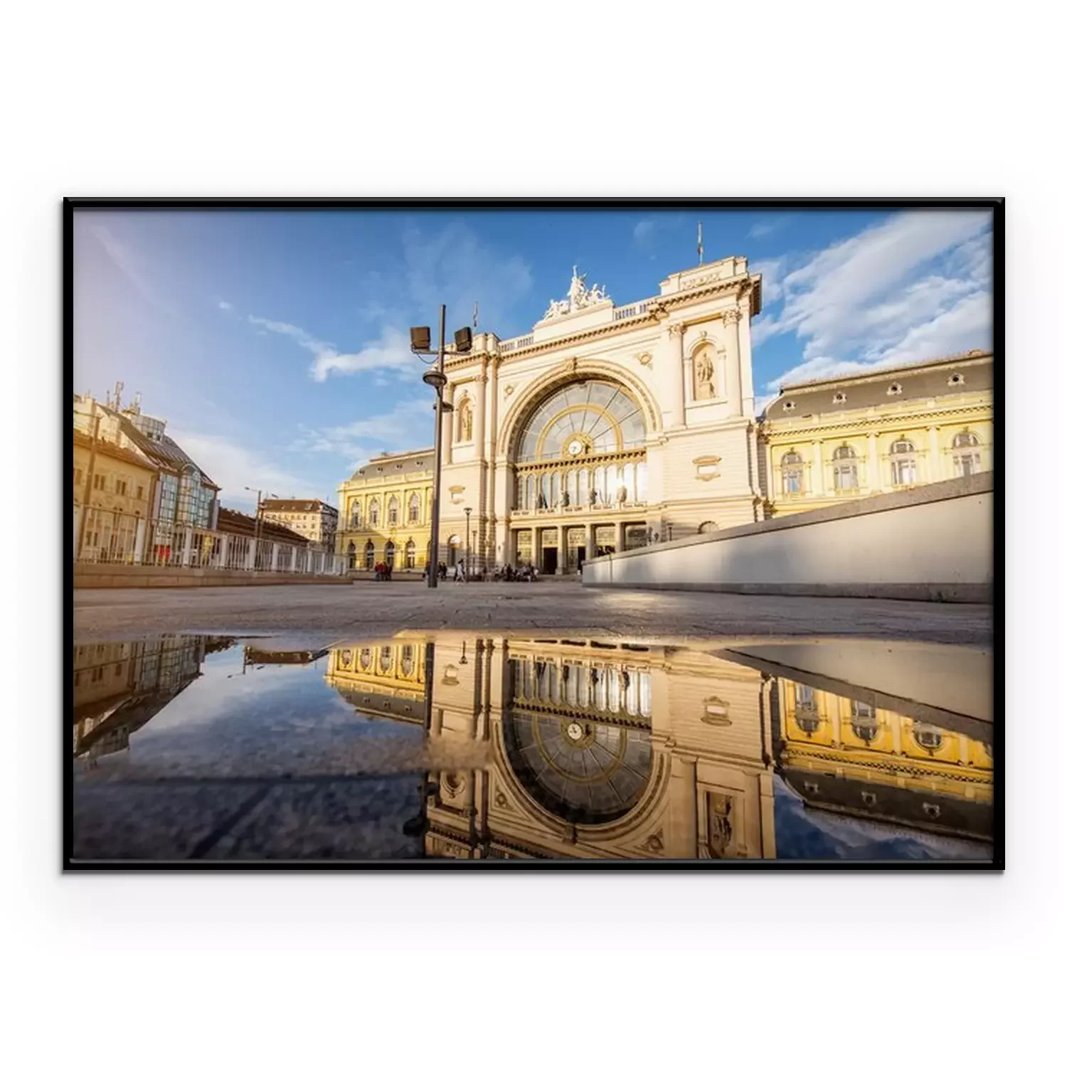 Poster: Mening met reflecdtion op het oostelijke station tijdens de zonsondergang in de stad van Boedapest, Hongarije