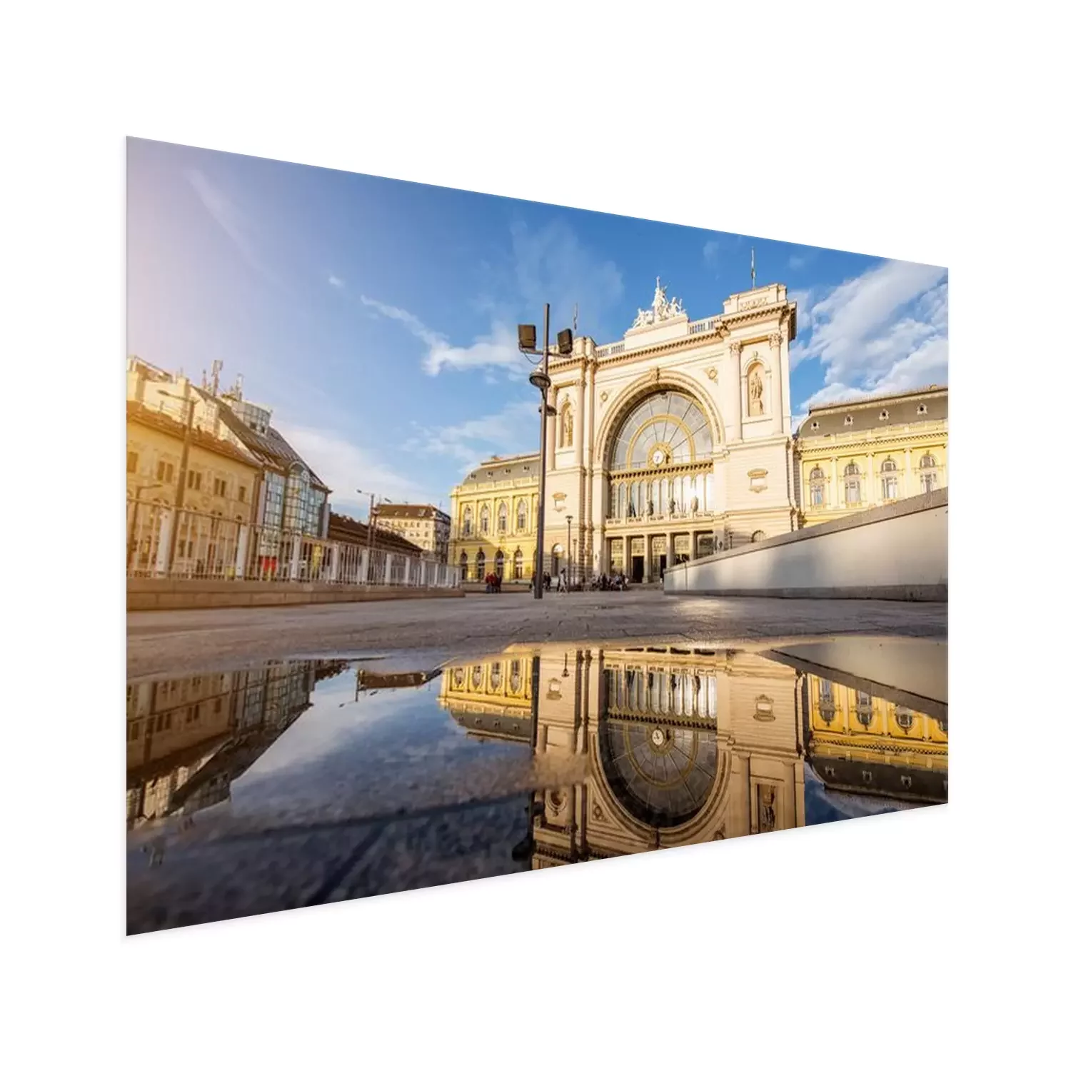Poster Mening met reflecdtion op het oostelijke station tijdens de zonsondergang in de stad van Boedapest, Hongarije