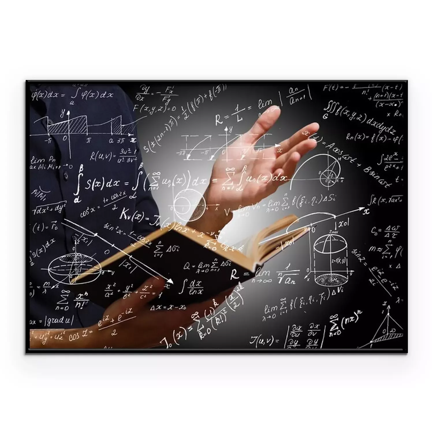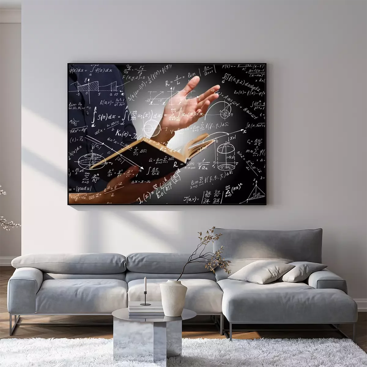 Poster: Mens die een boek op een achtergrond met wetenschapsformules leest