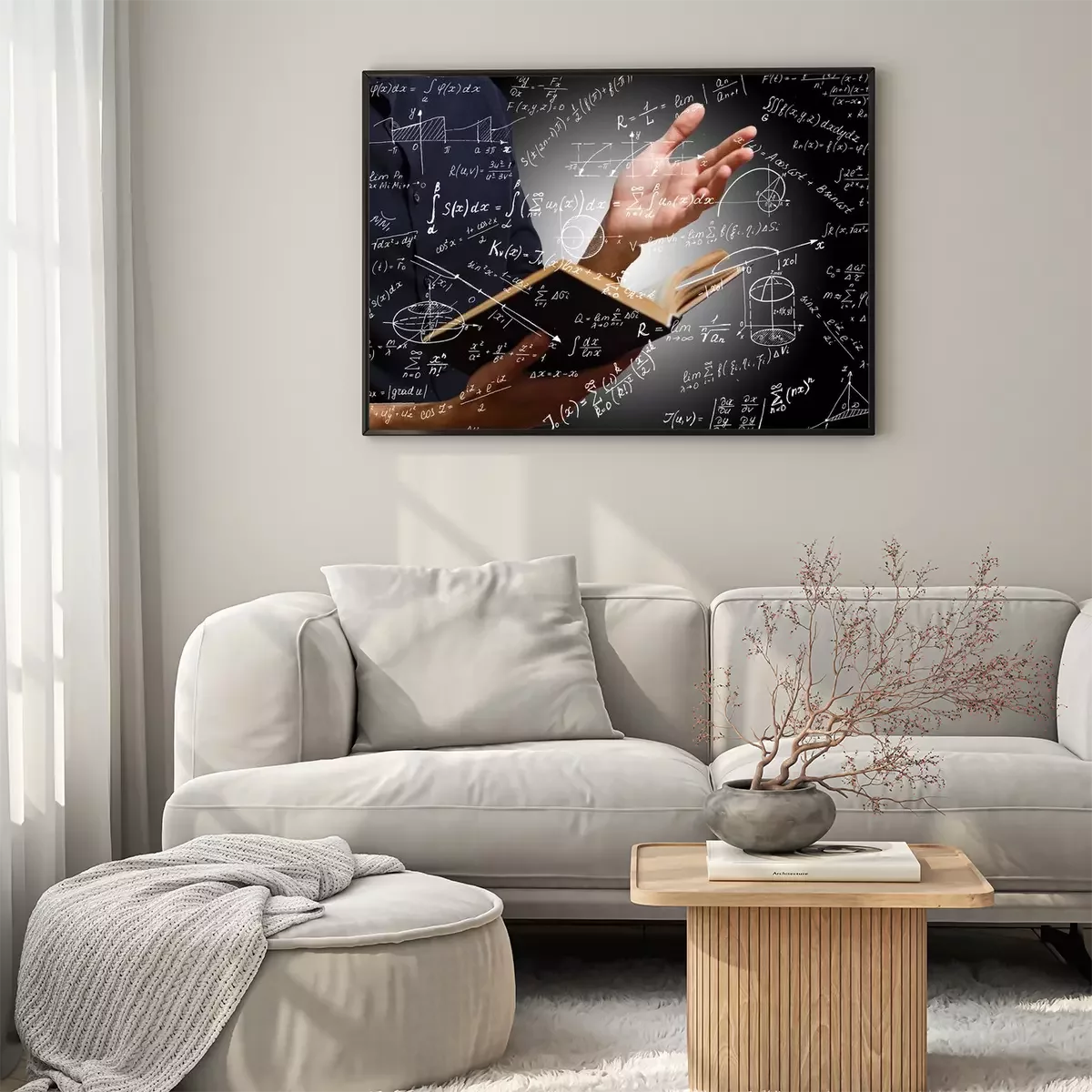 Poster Mens die een boek op een achtergrond met wetenschapsformules leest