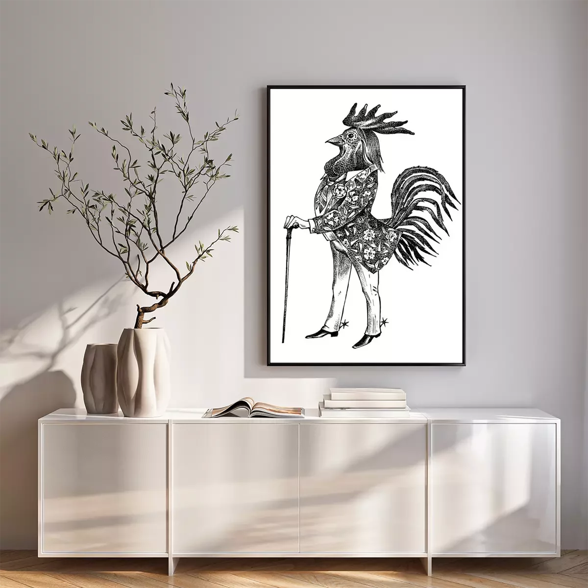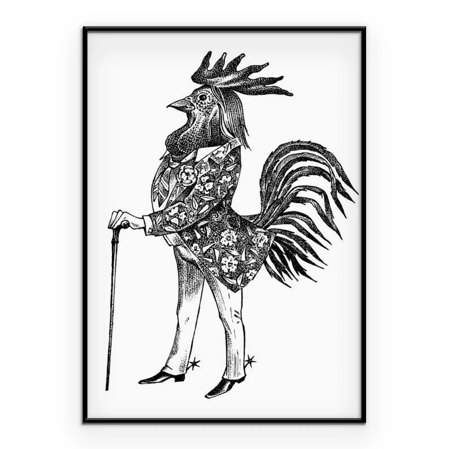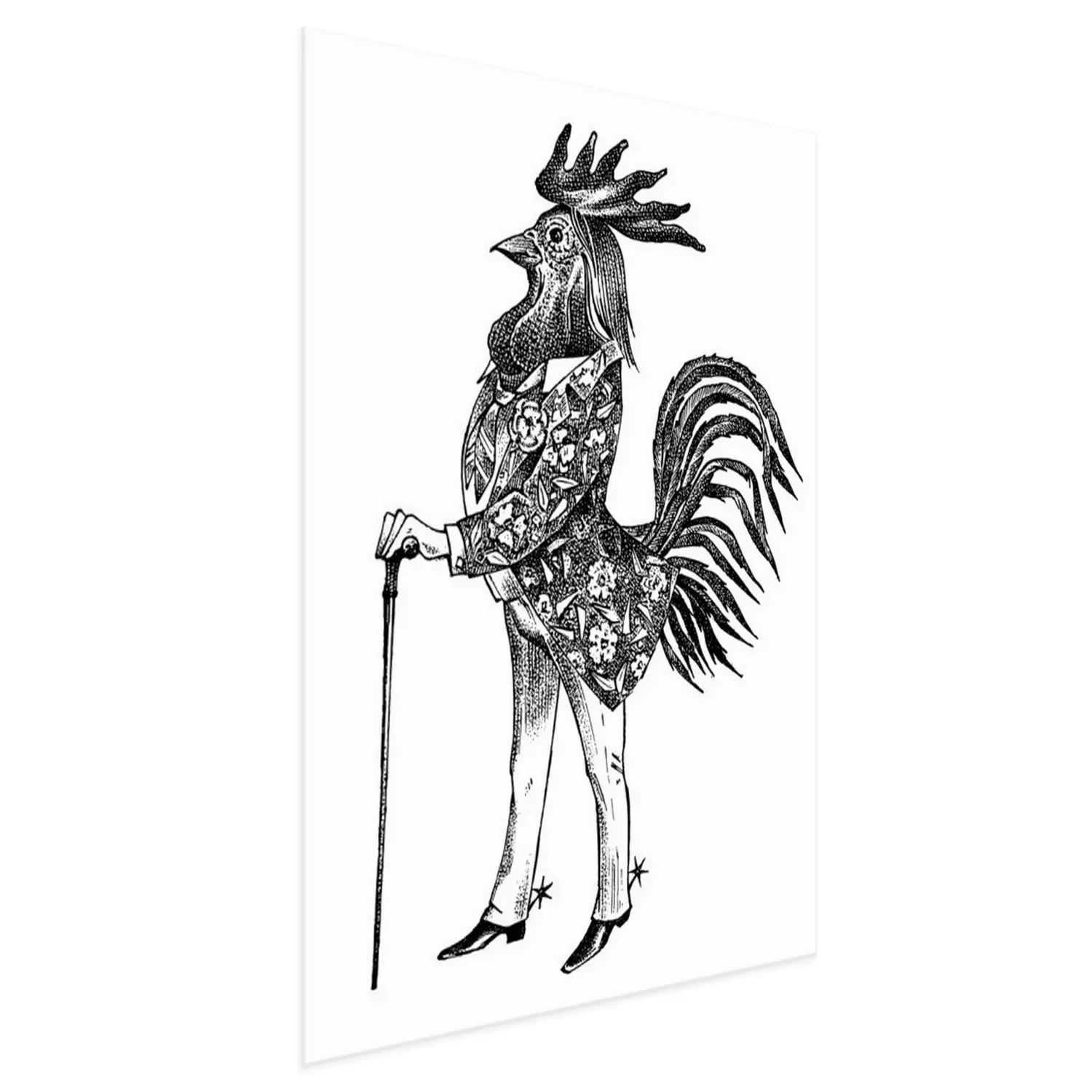 Poster: Menselijke figuur met haan hoofd tekening
