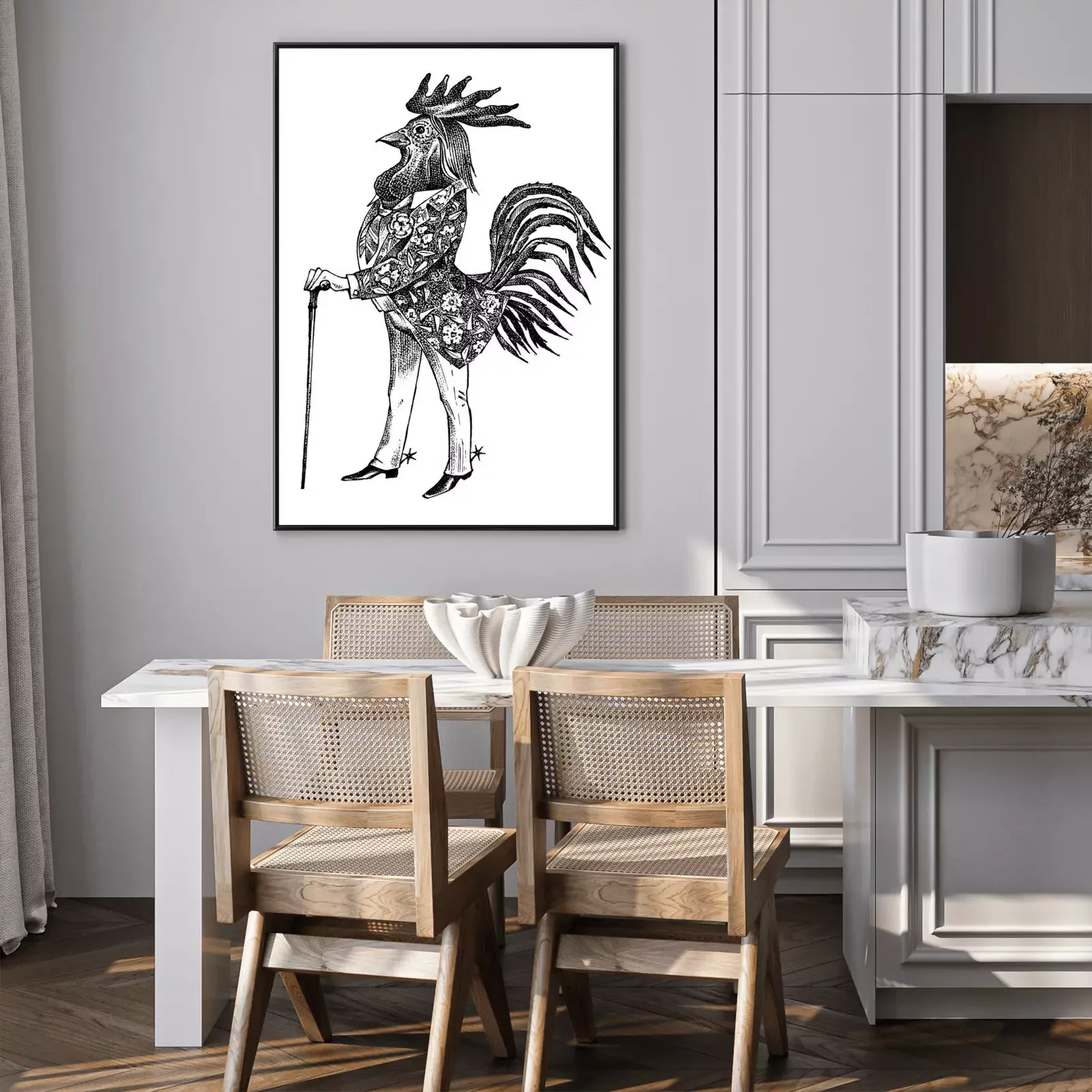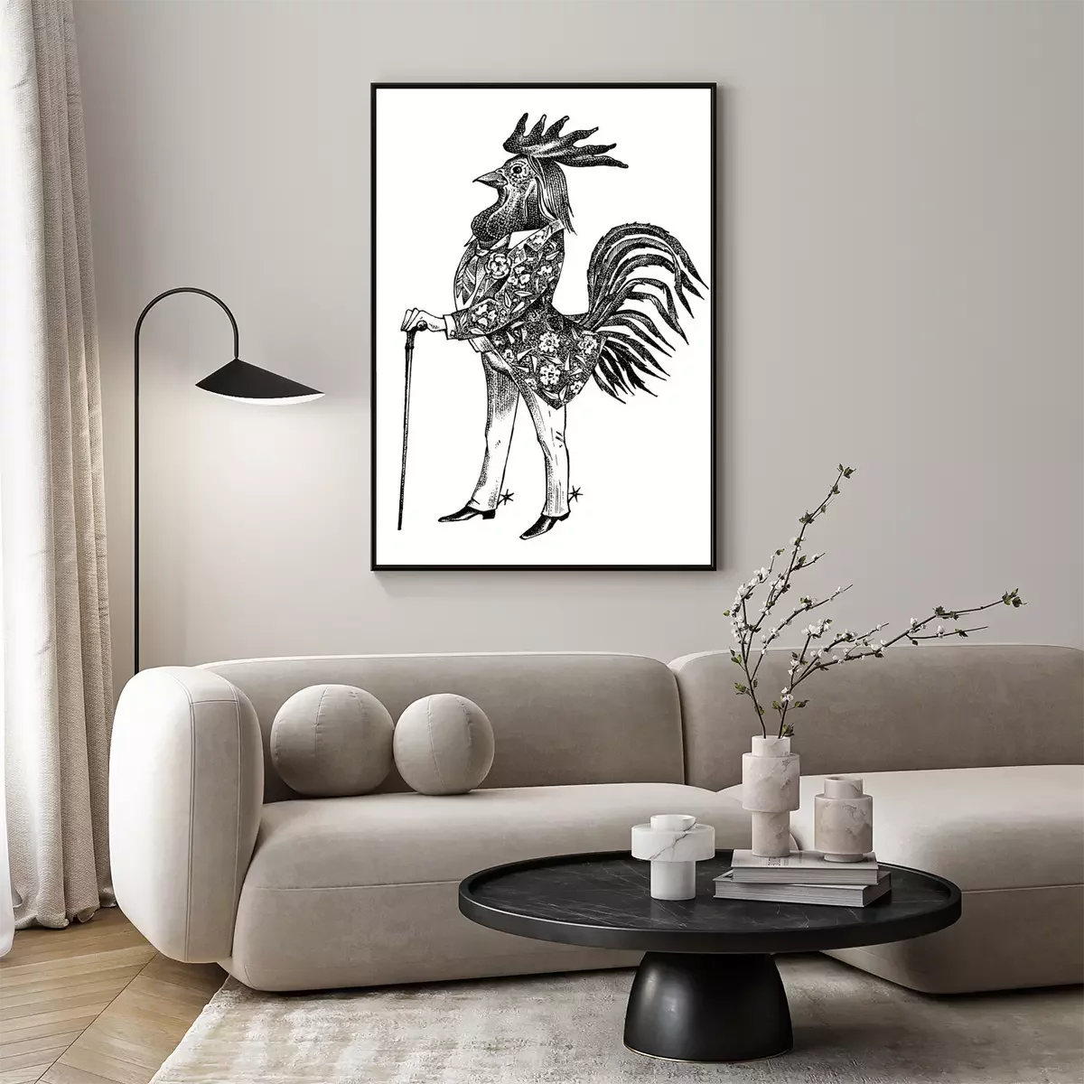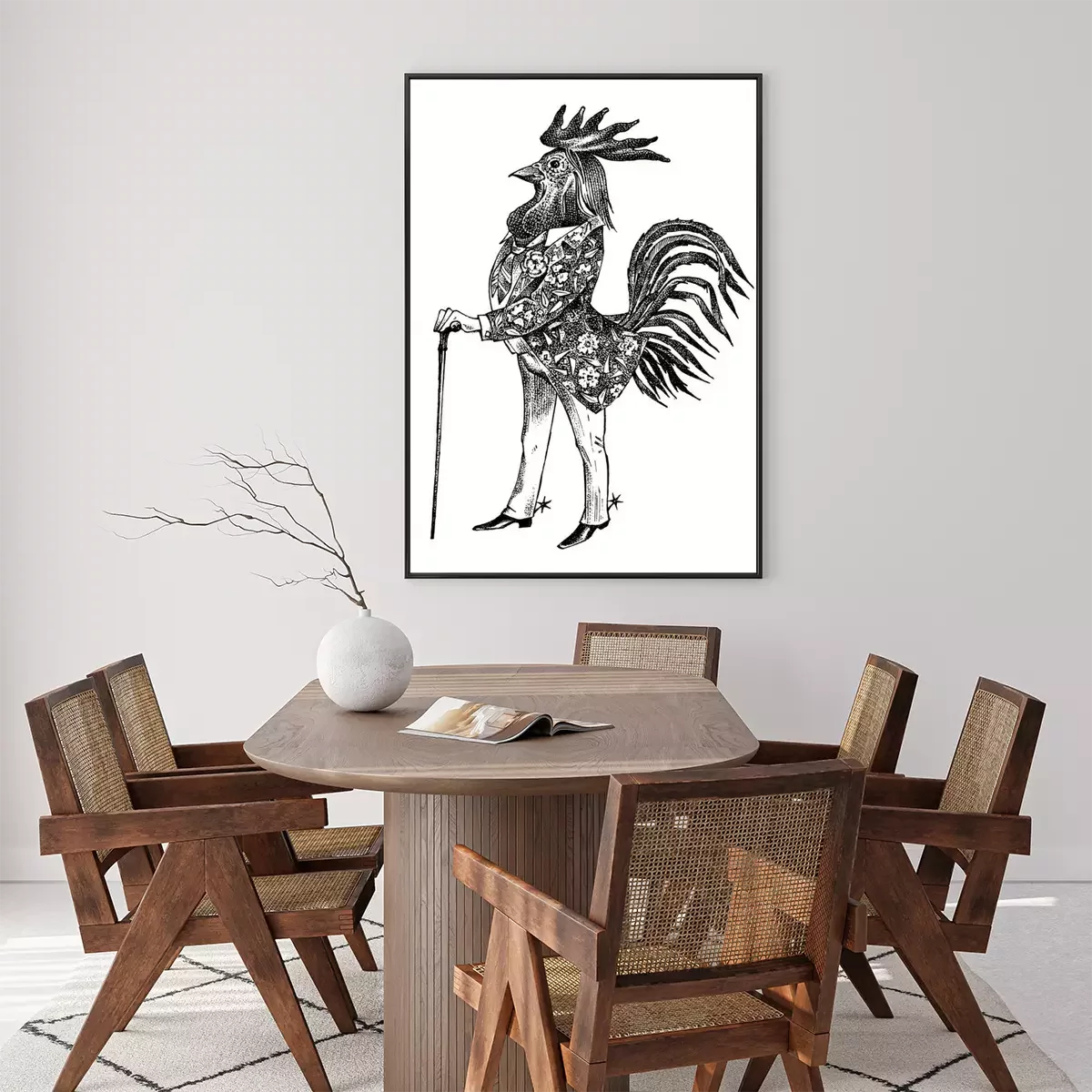 Poster: Menselijke figuur met haan hoofd tekening