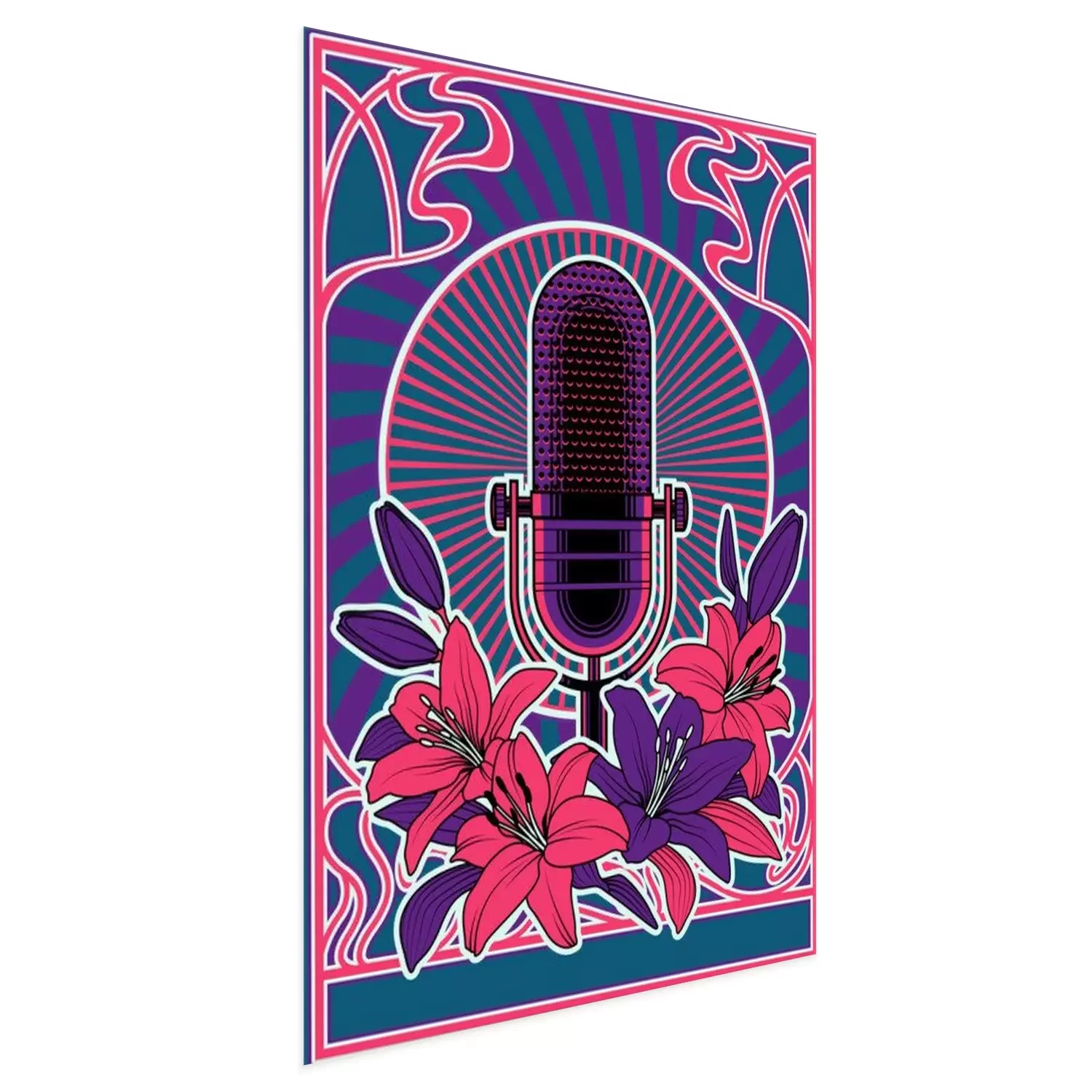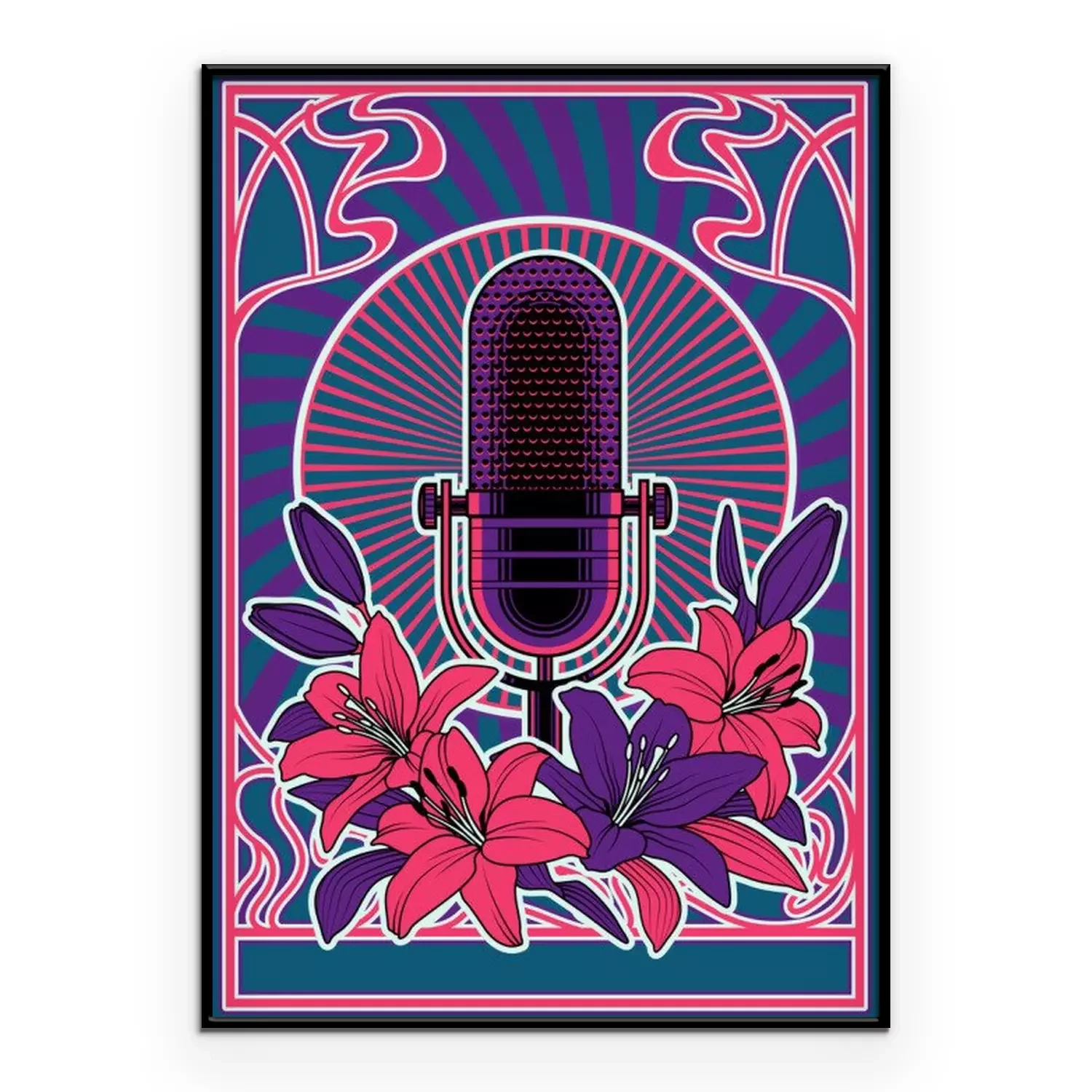 Poster: Microphone and Lilies Psychedelic Art Poster, Art Nouveau Frame, 1960s Colors