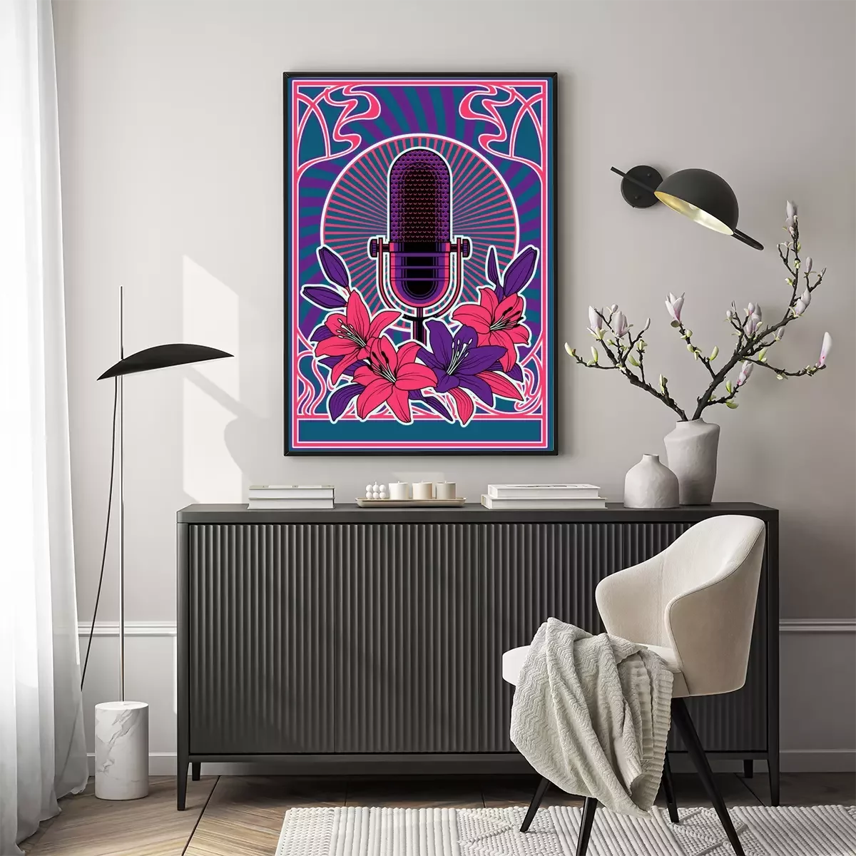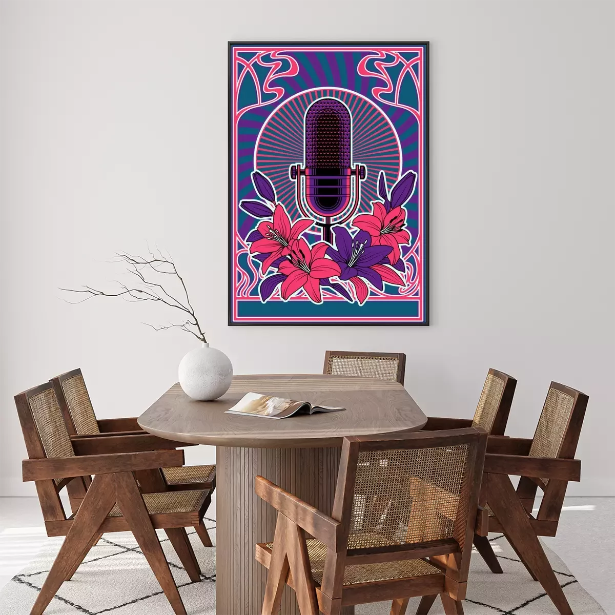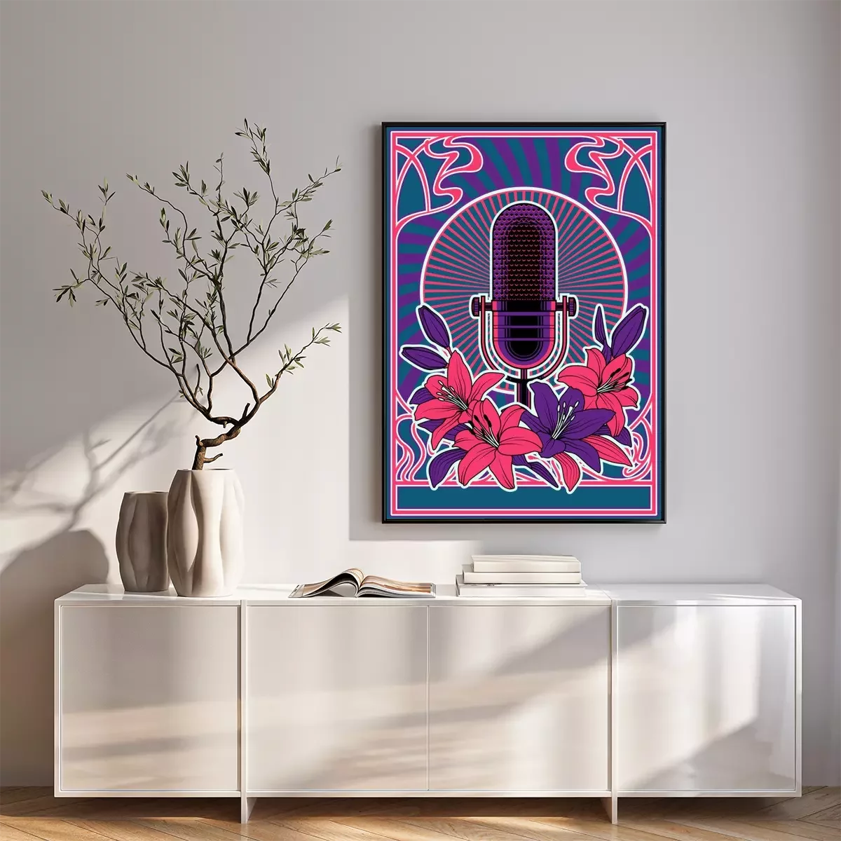 Poster Microphone and Lilies Psychedelic Art Poster, Art Nouveau Frame, 1960s Colors