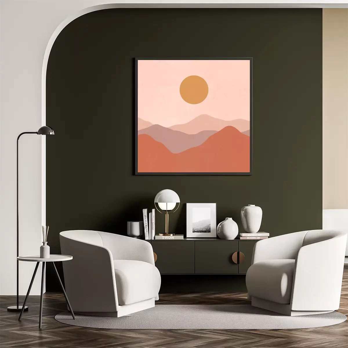 Poster: Minimalist landscape mountain sun texture mid-century modern illustration