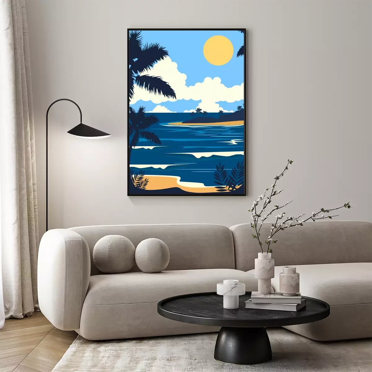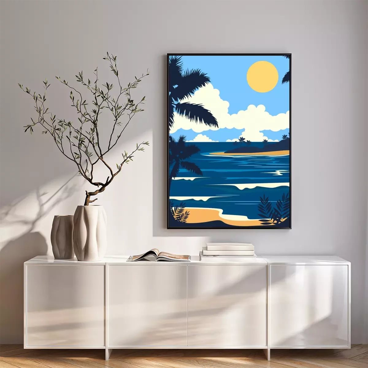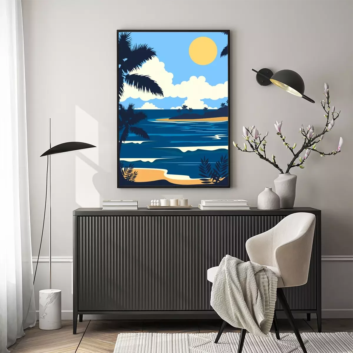 Poster: Minimalistische illustratie van een palmboom aan de kust