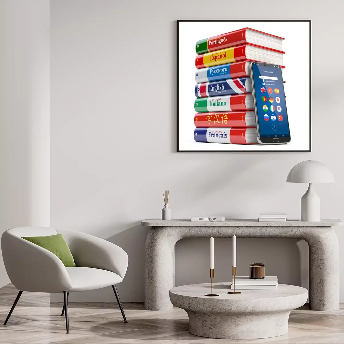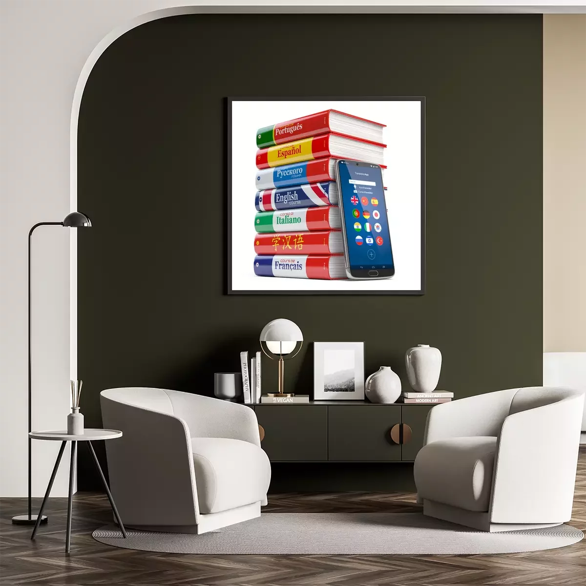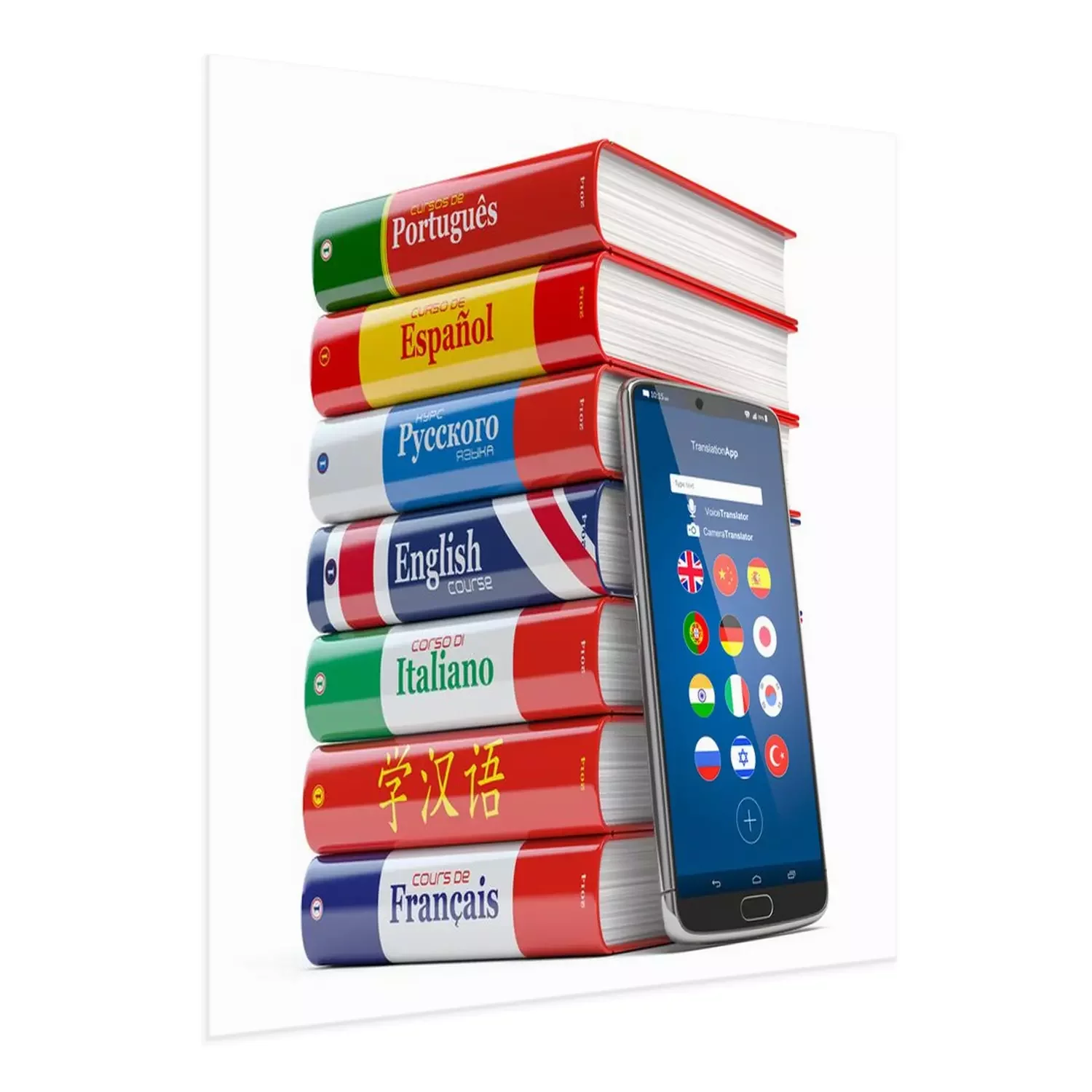 Poster: Mobile dictionary, translator and e-learning.concept . Learning languages online. Smartphone and books with language courses.