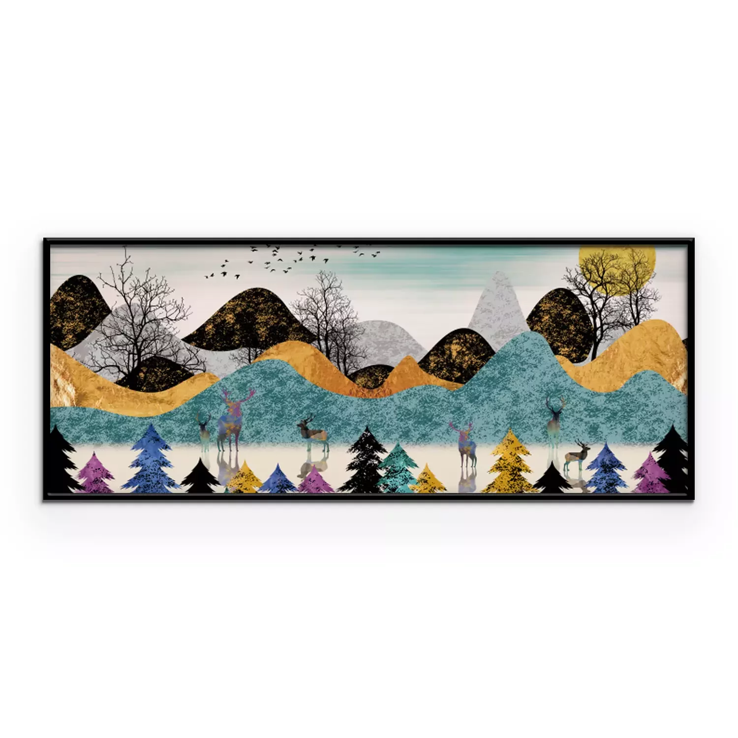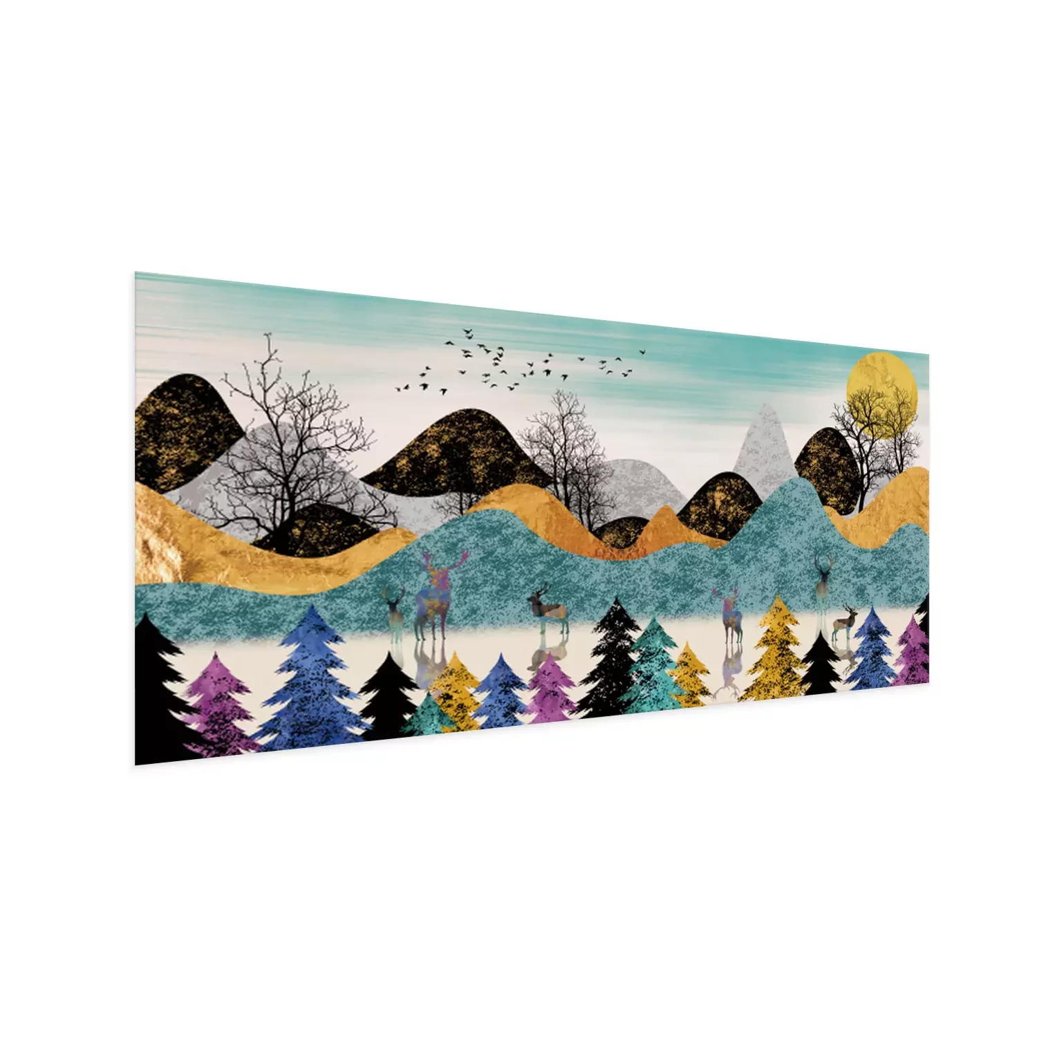 3d modern art mural wallpaper with dark blue Jungle , forest background . golden deer, christmas tree , mountains , clouds with white birds . Suitable for use as a frame on walls .