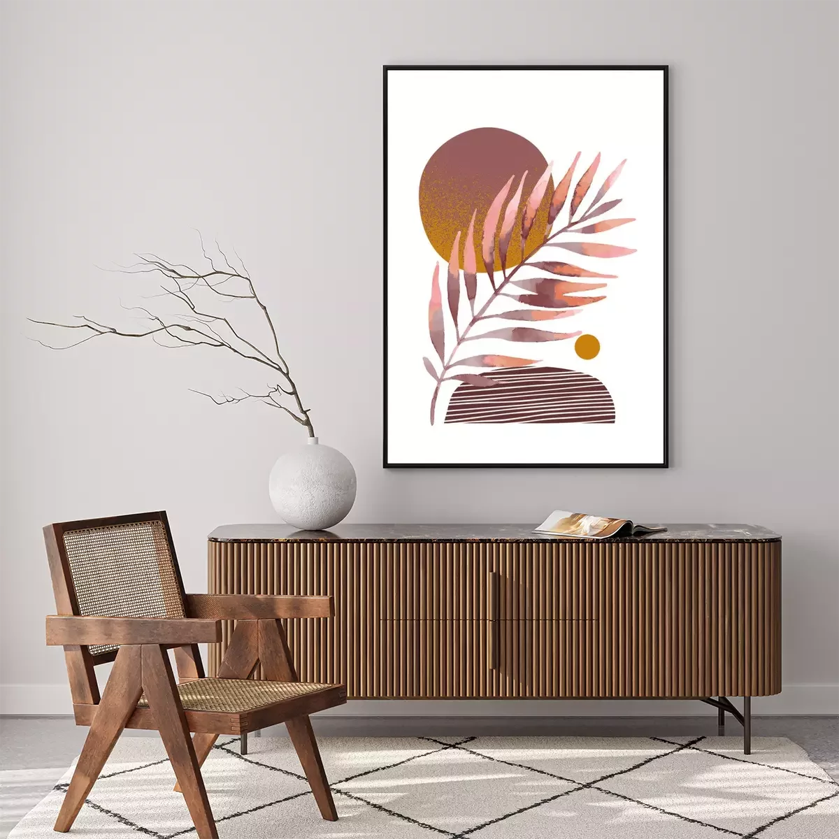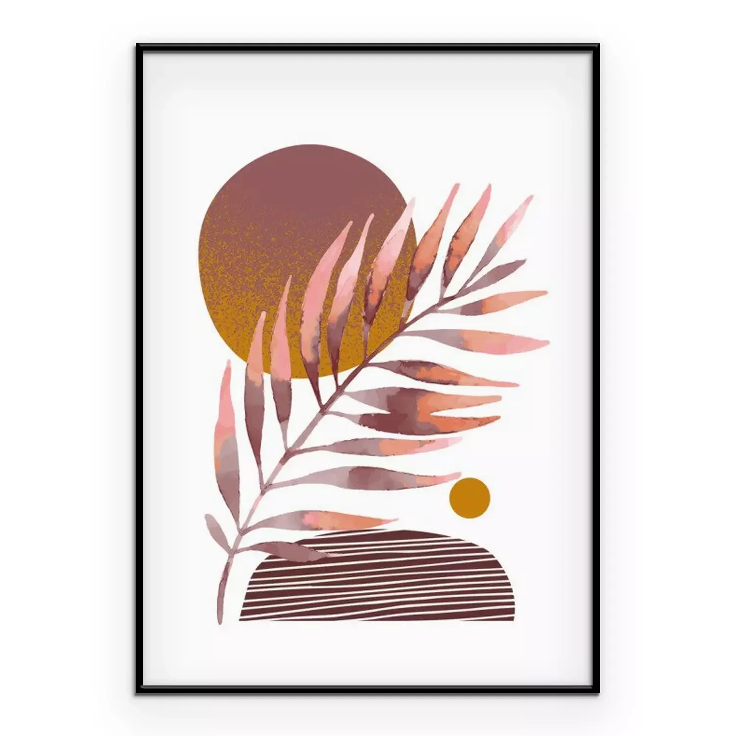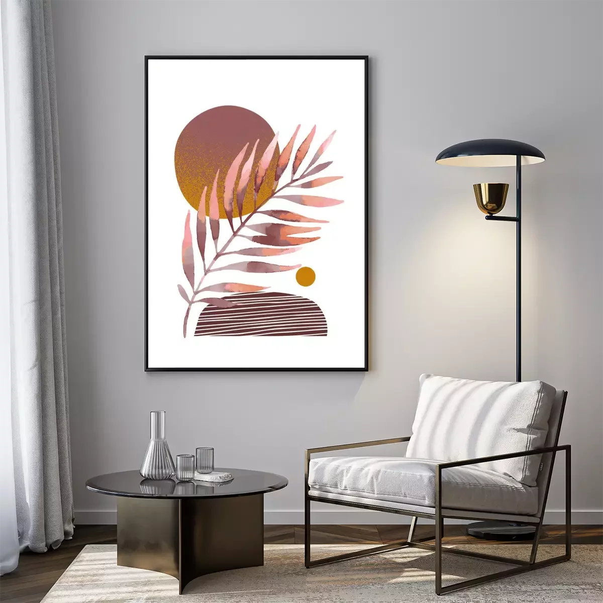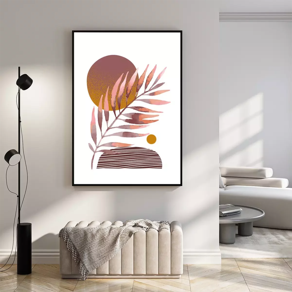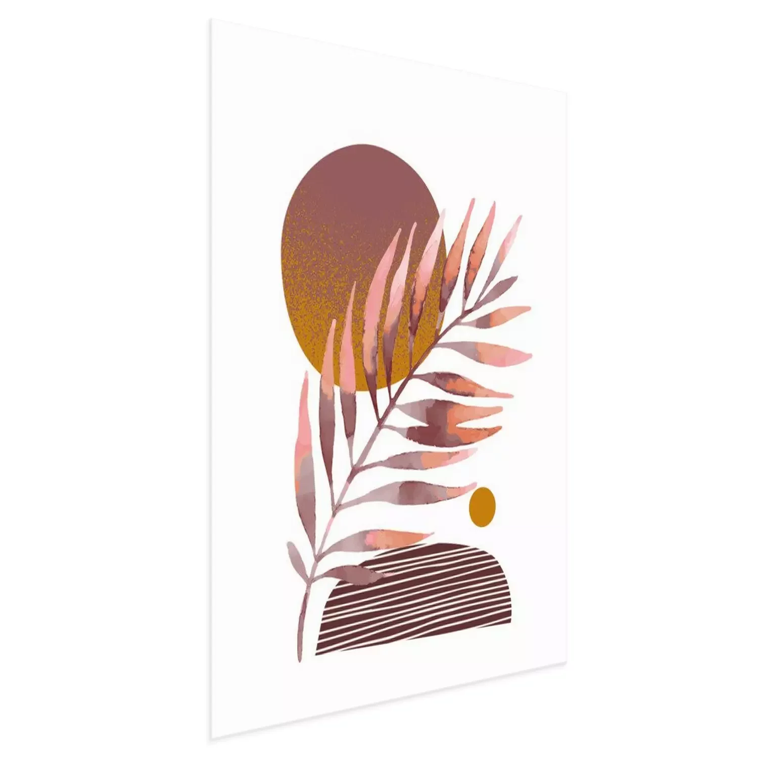 Abstract poster design: minimal shapes, glossy golden tropical leaf.