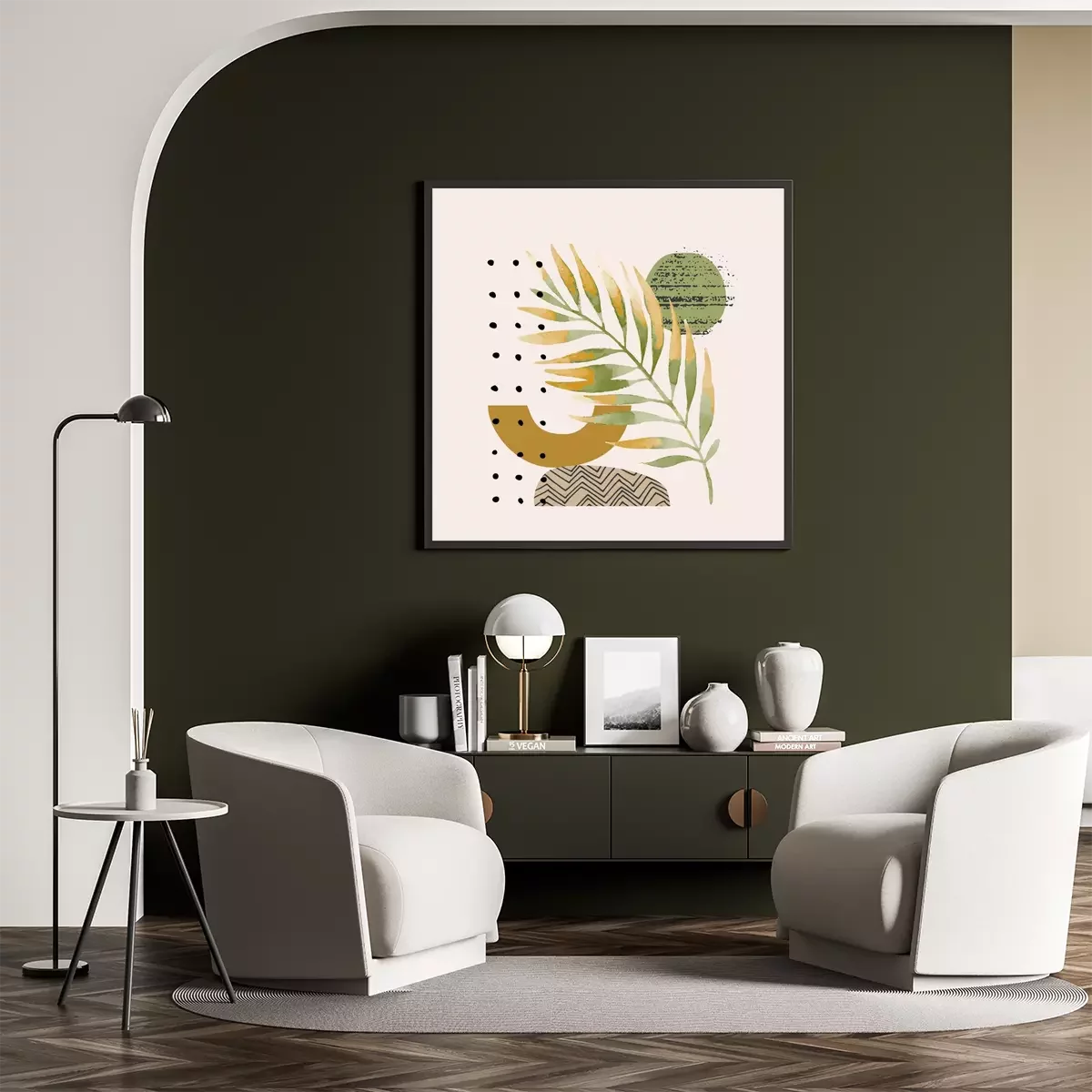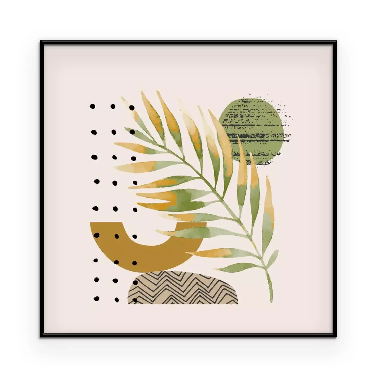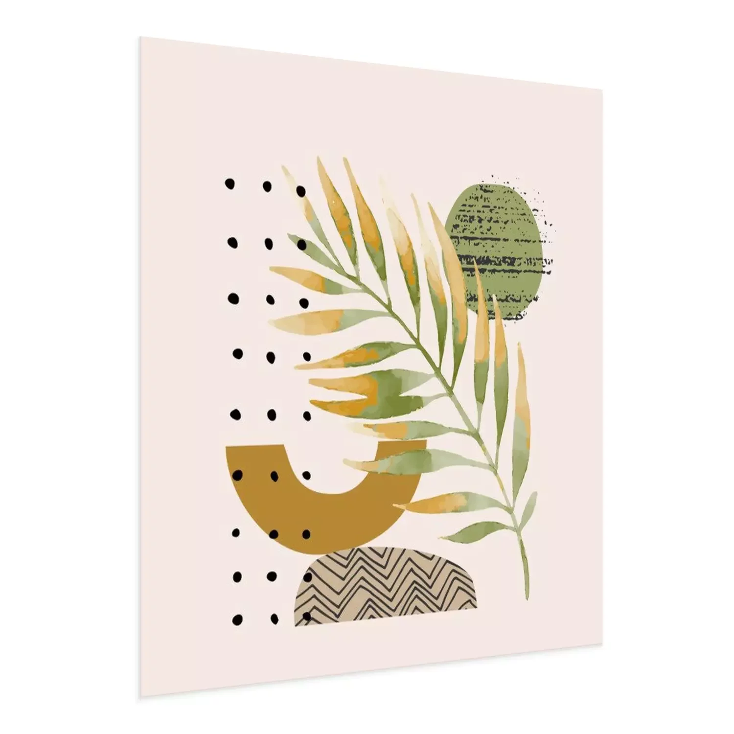 Abstract poster design: minimal shapes, glossy golden tropical leaf.