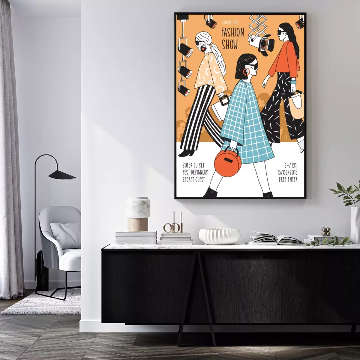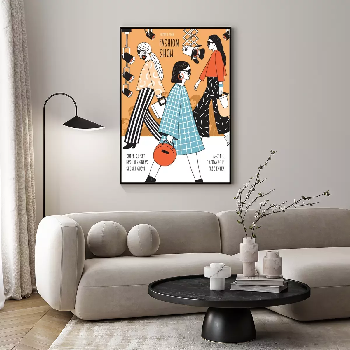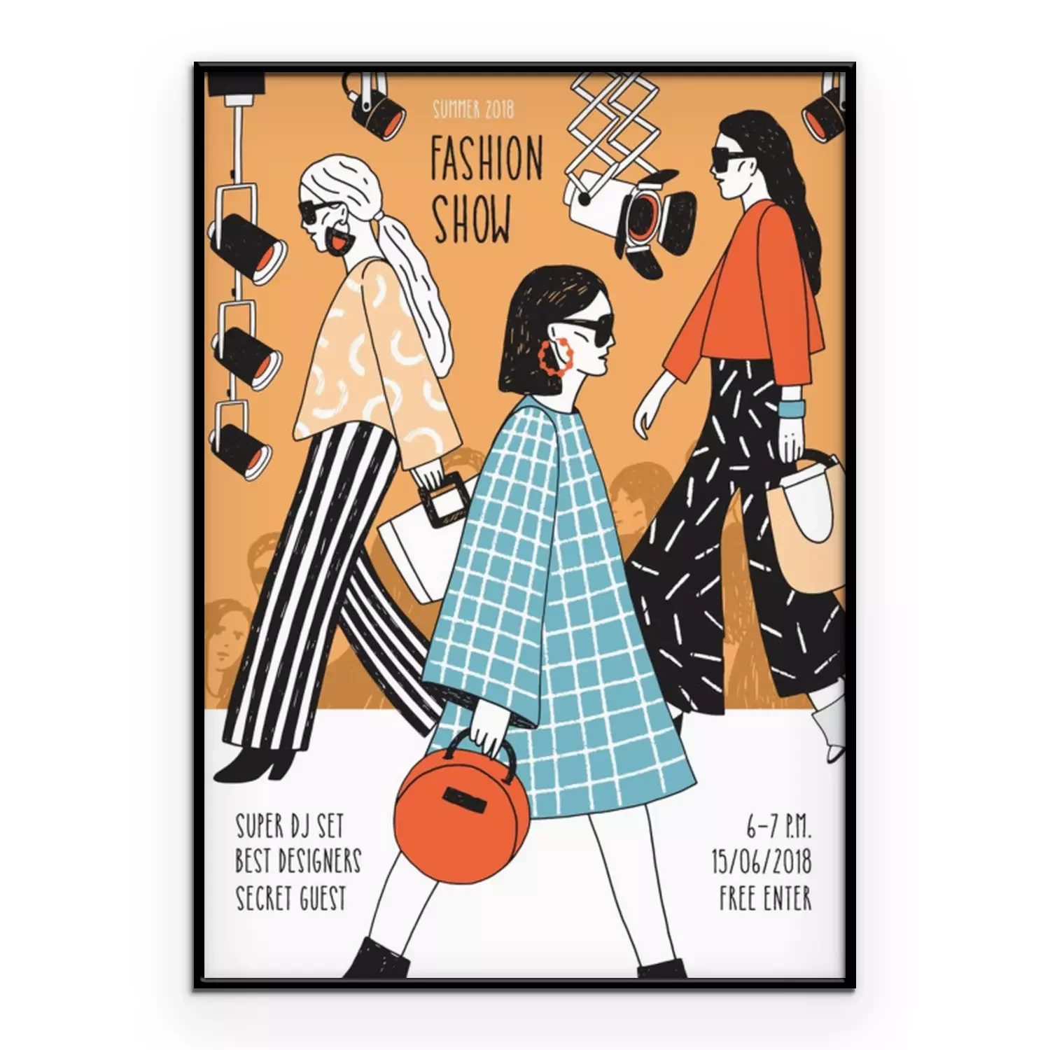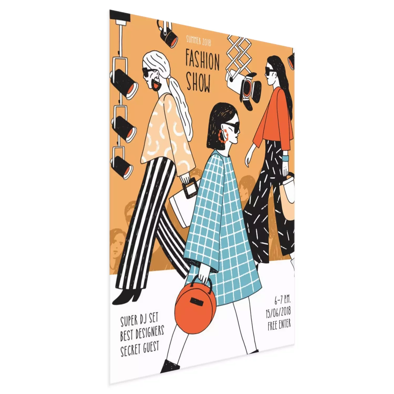 Poster: Moderne flyer of poster sjabloon voor modeshow met topmodellen trendy haute couture kleding dragen en demonstreren op de landingsbaan. Kleurrijke hand getrokken vectorillustratie voor gebeurtenisaanko