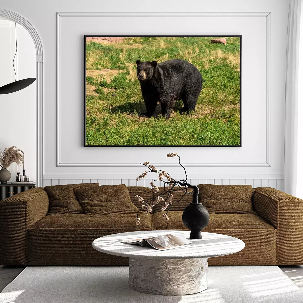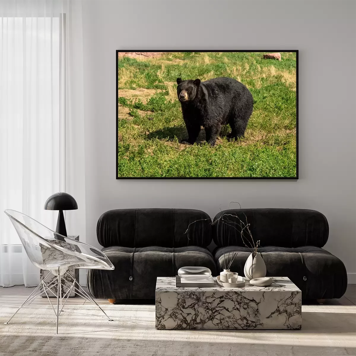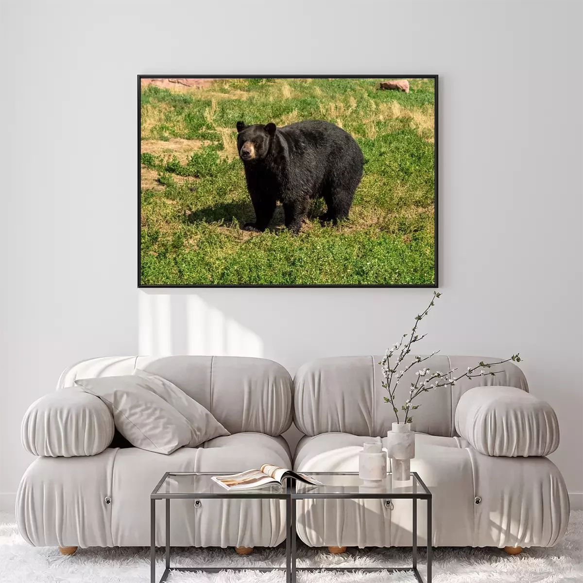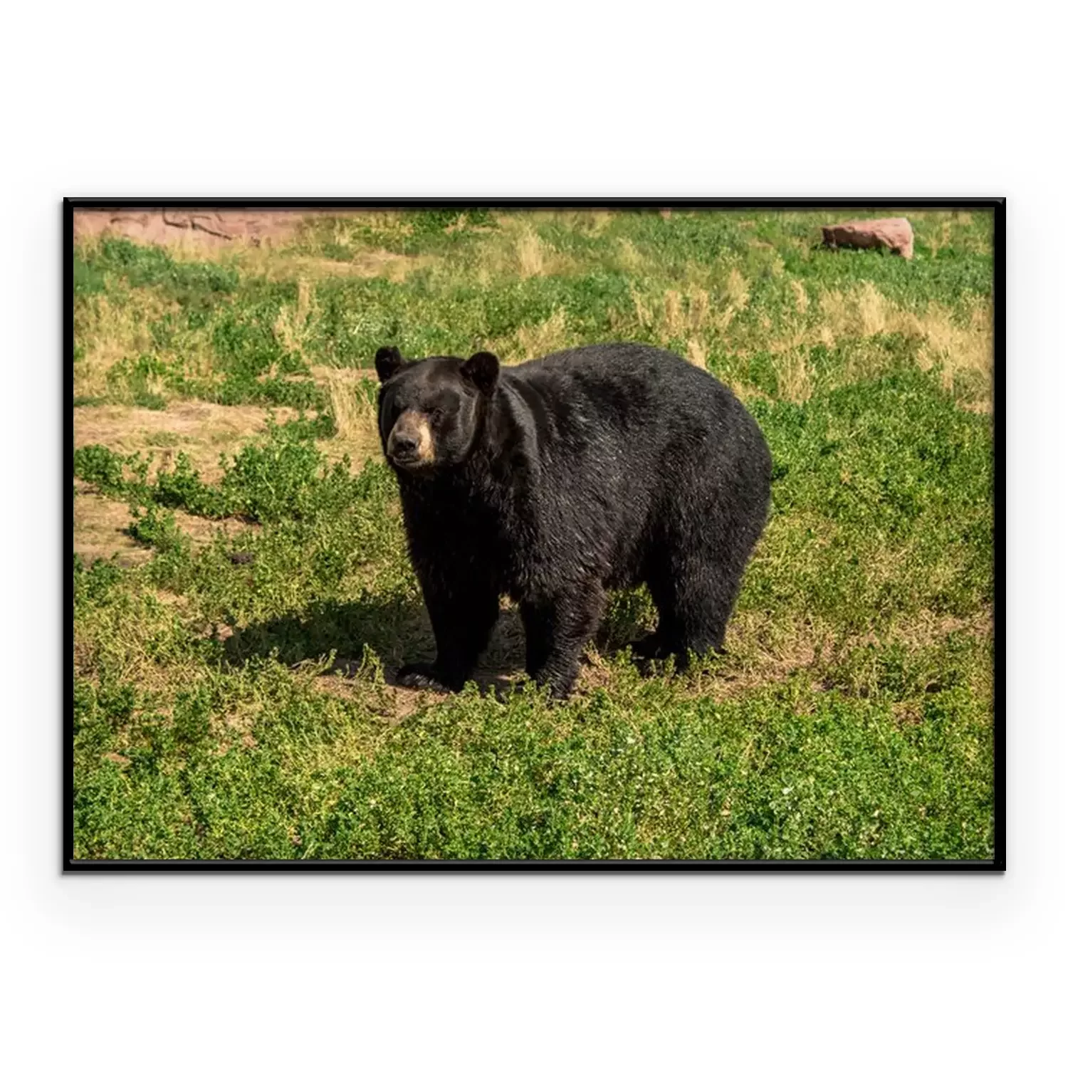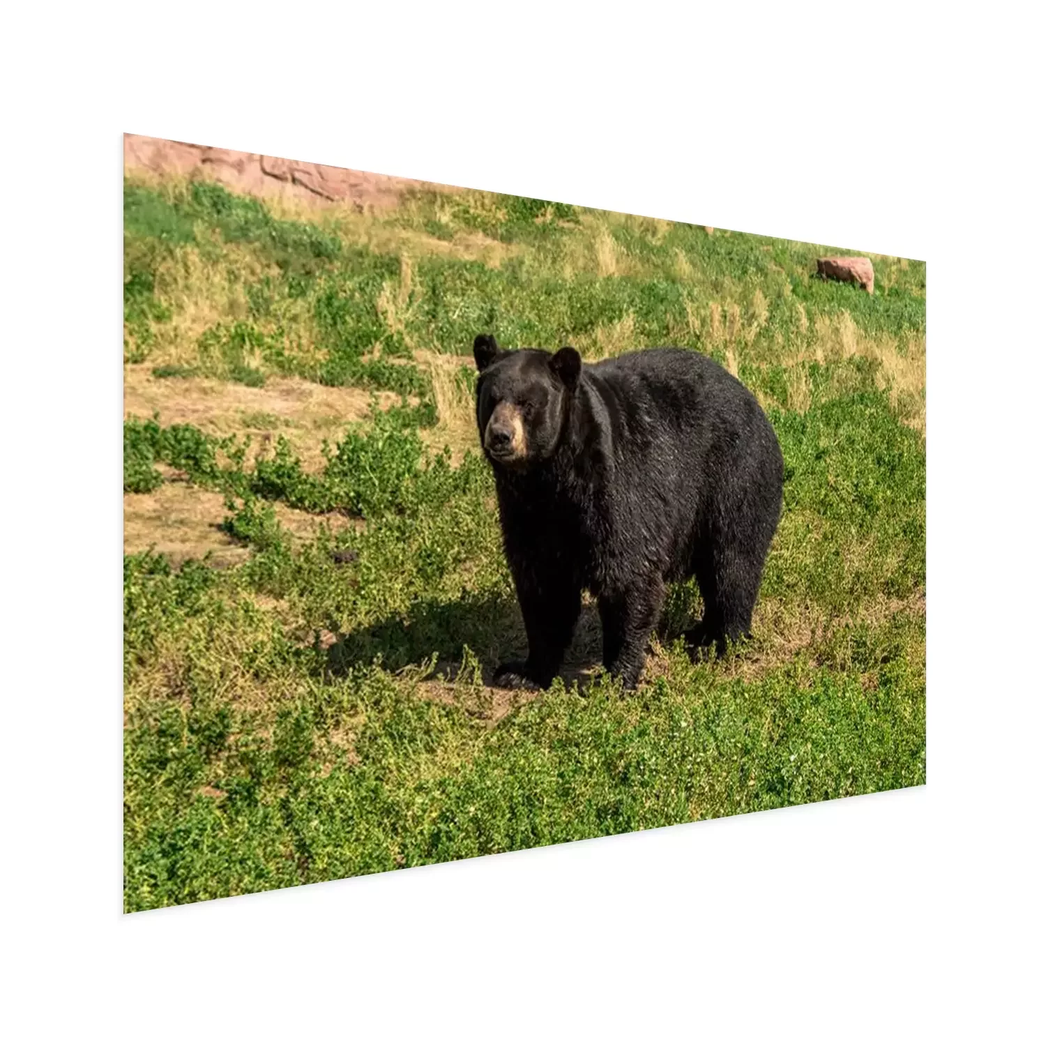 Poster: Mollige zwarte beer die rond op het gebied loopt