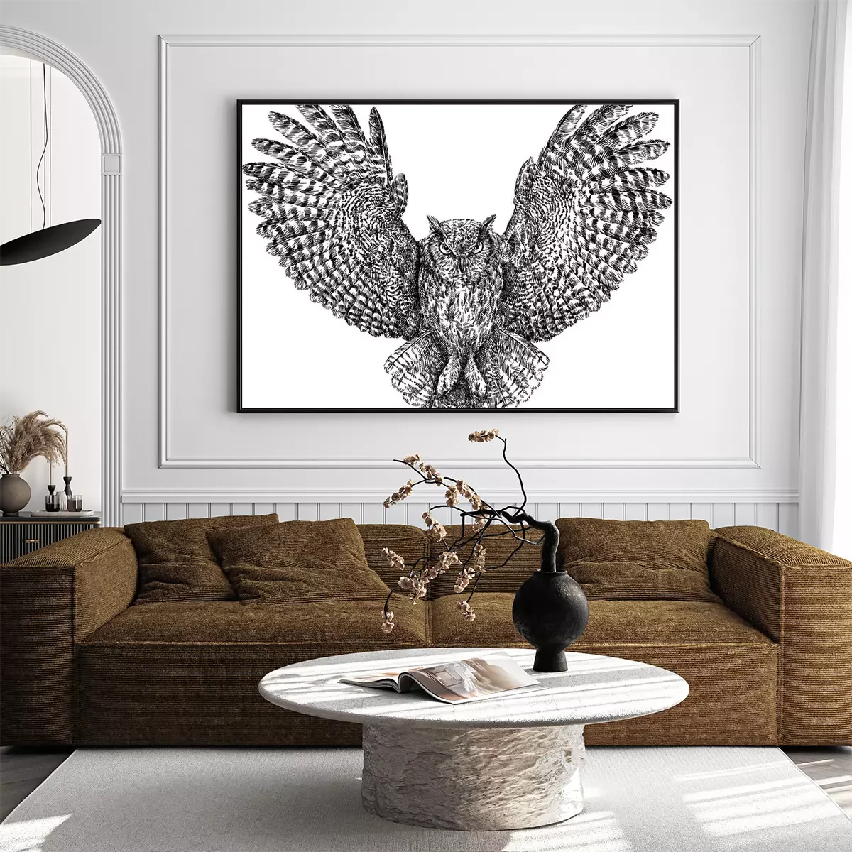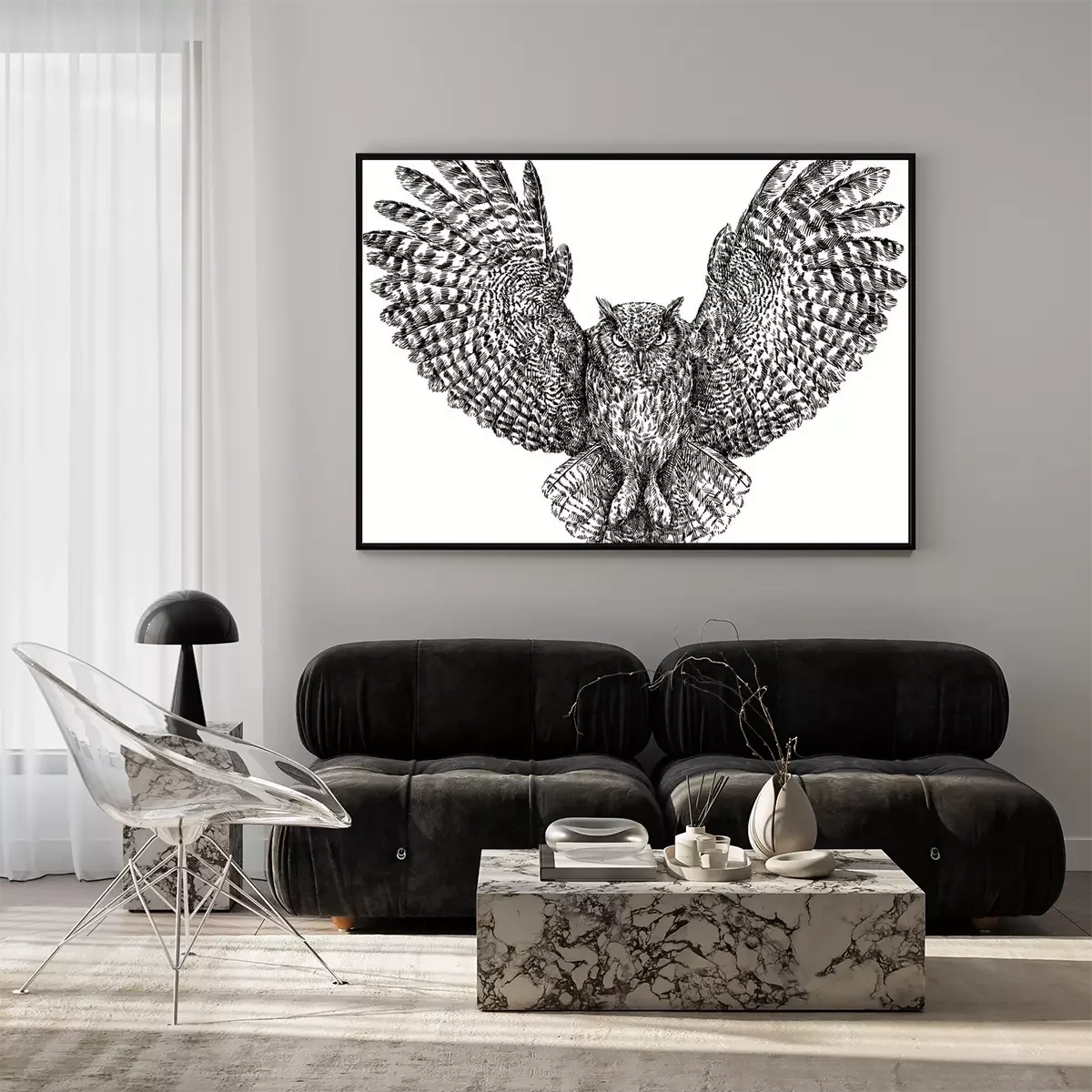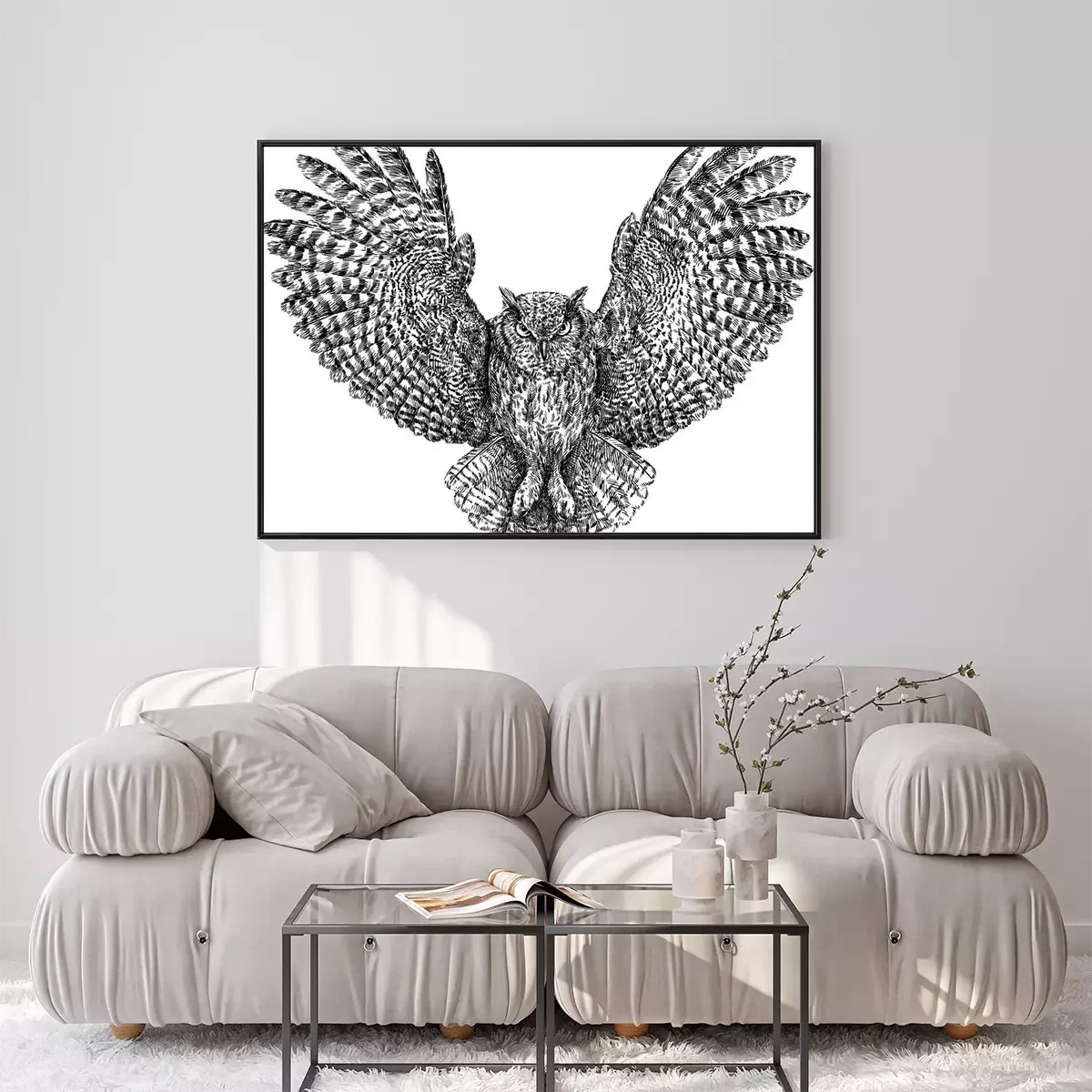 Poster: Monochroom uil tijdens de vlucht