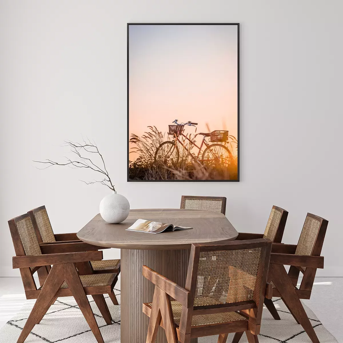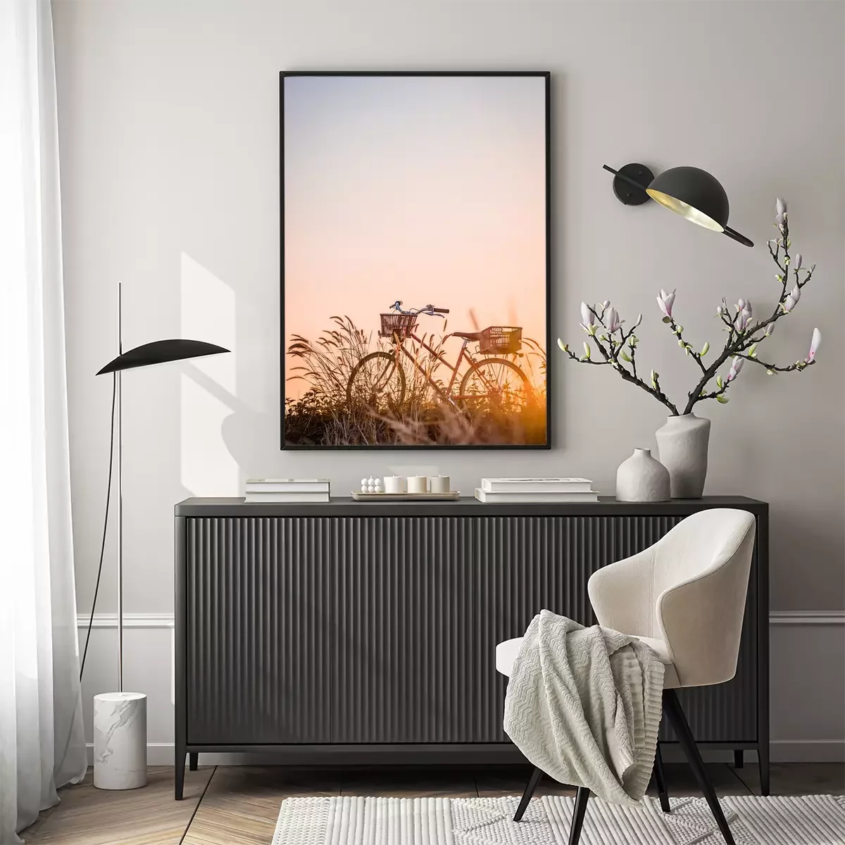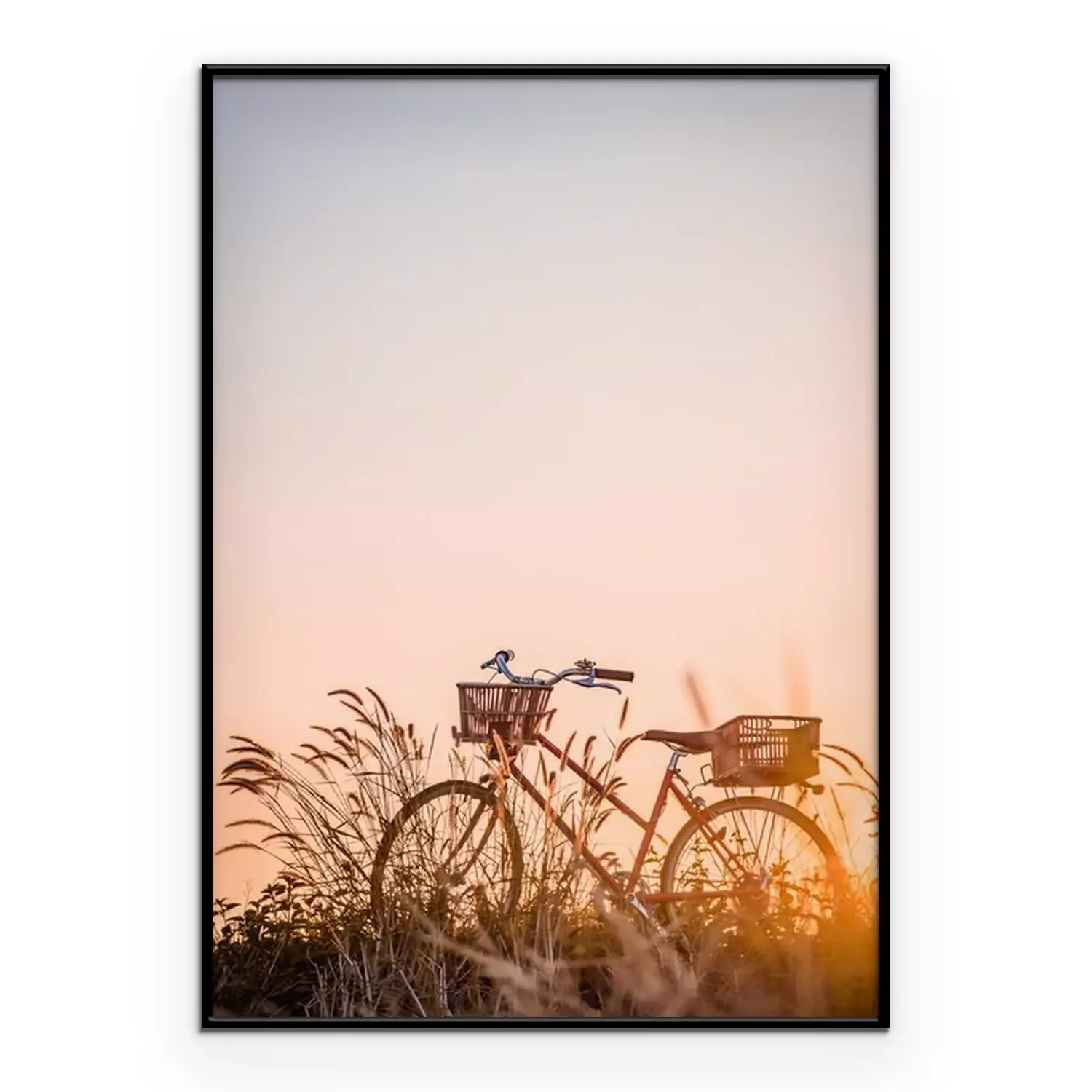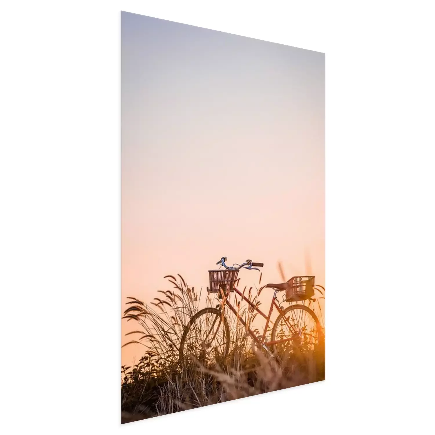 Poster: mooi landschapsbeeld met fiets bij zonsondergang