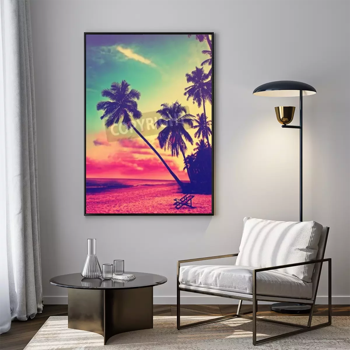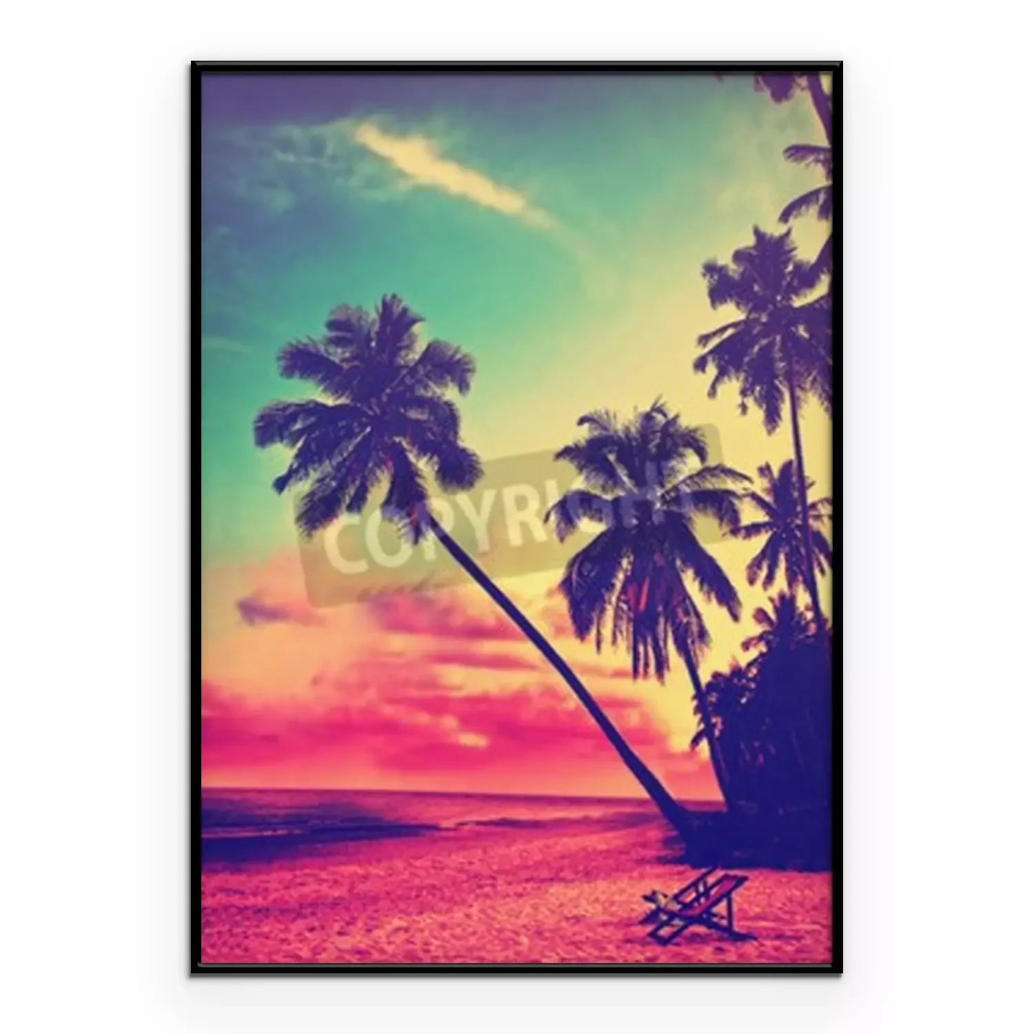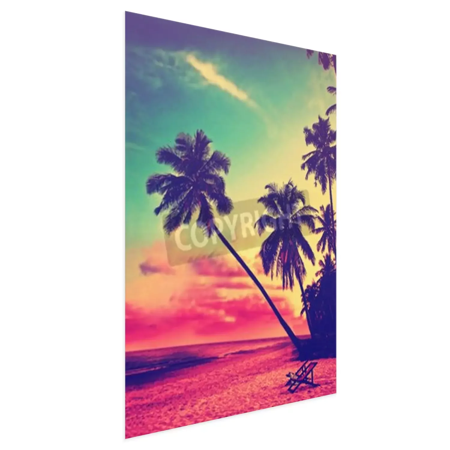 Poster: Mooi tropisch strand met silhouetten van palmbomen bij zonsondergang