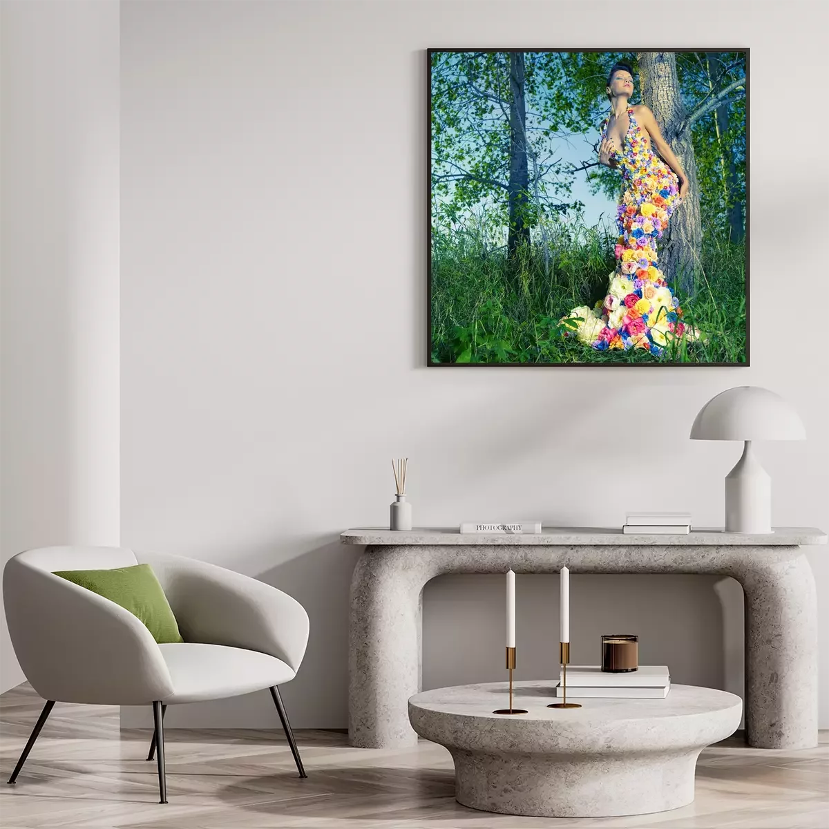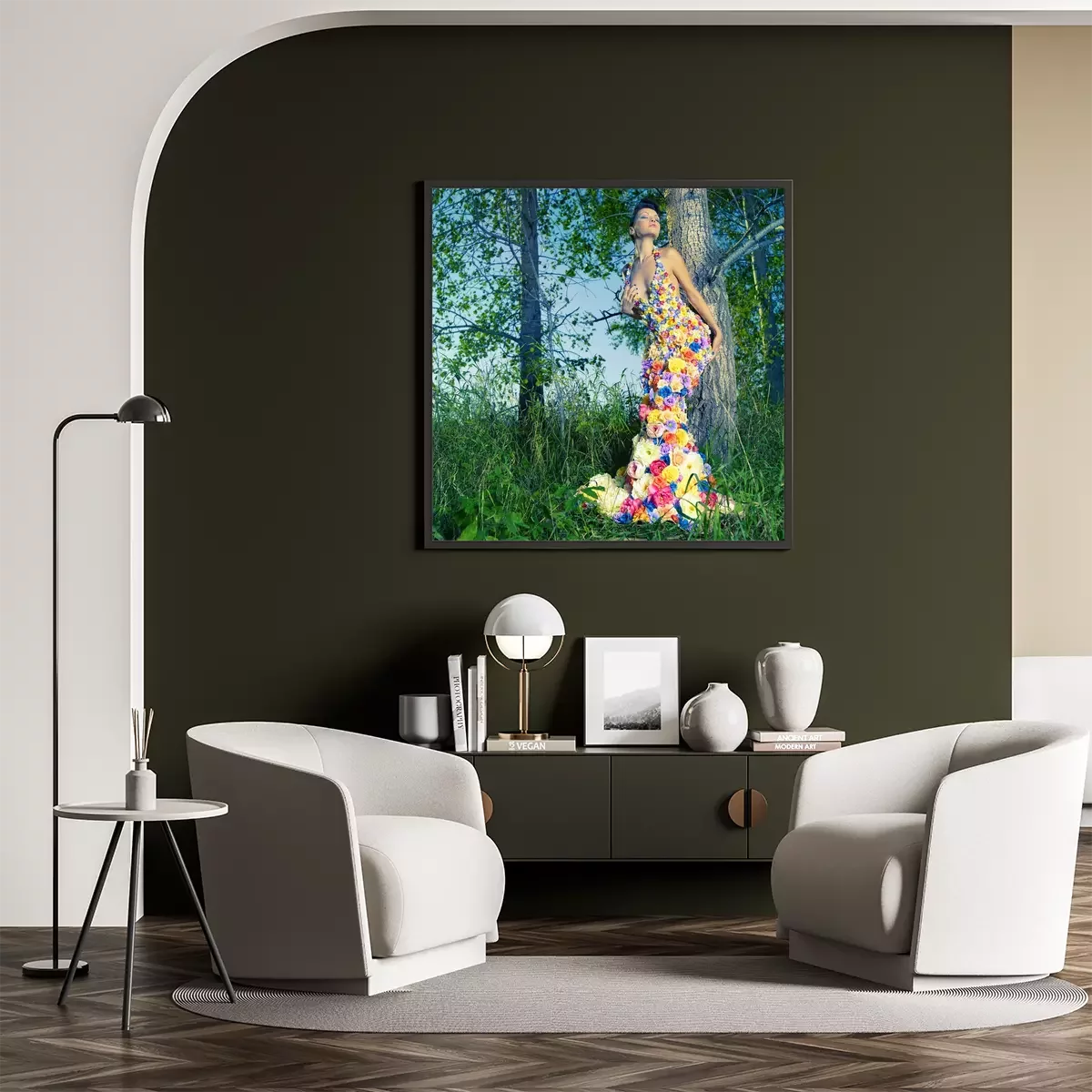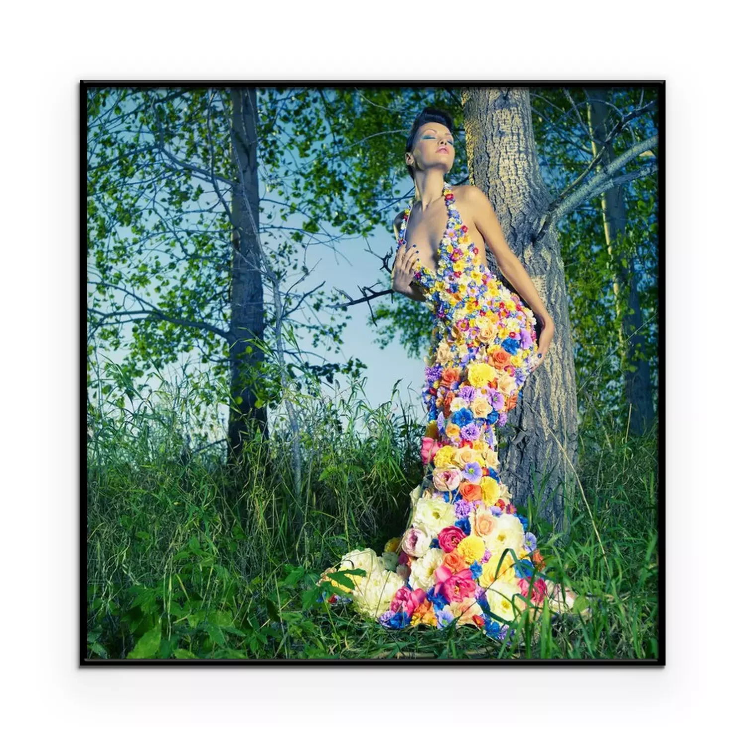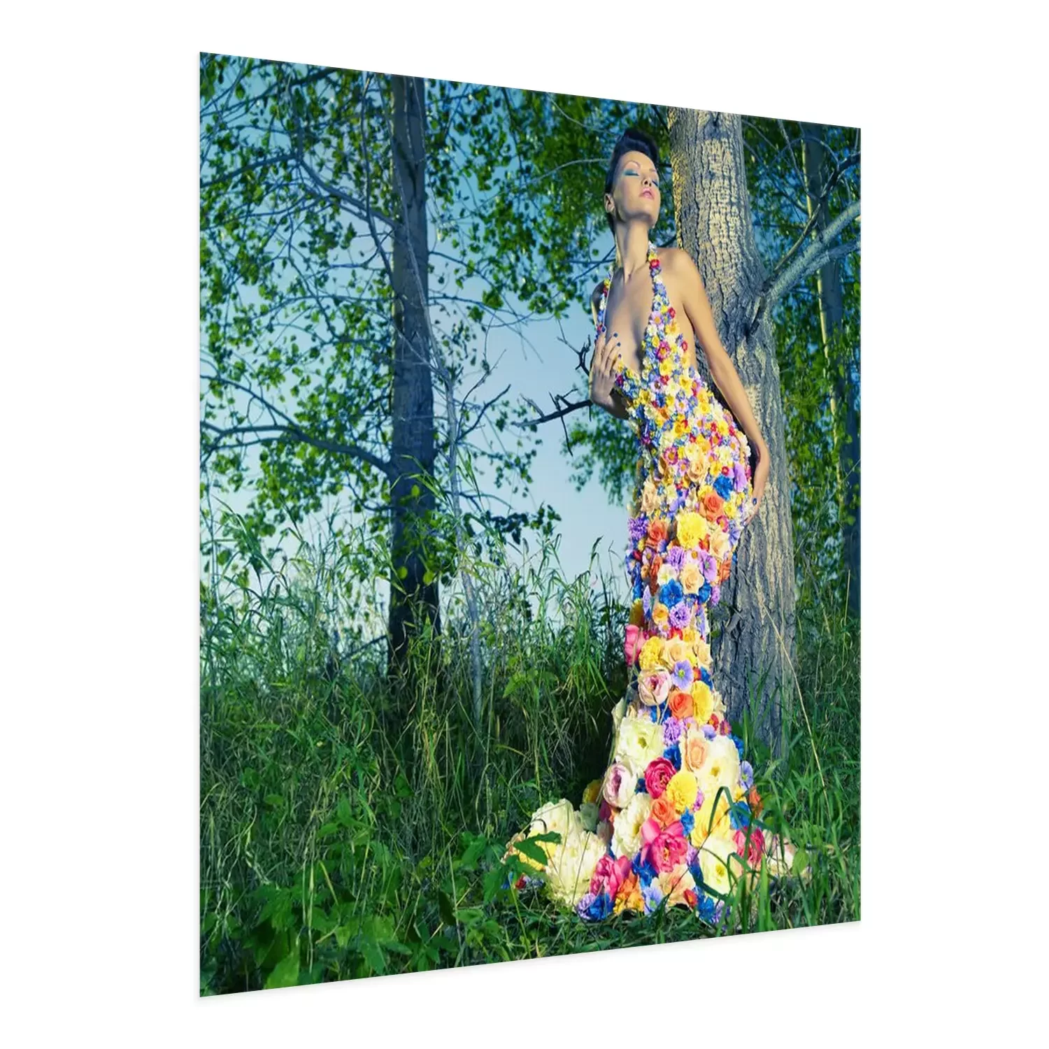 Poster: Mooie dame in jurk van bloemen
