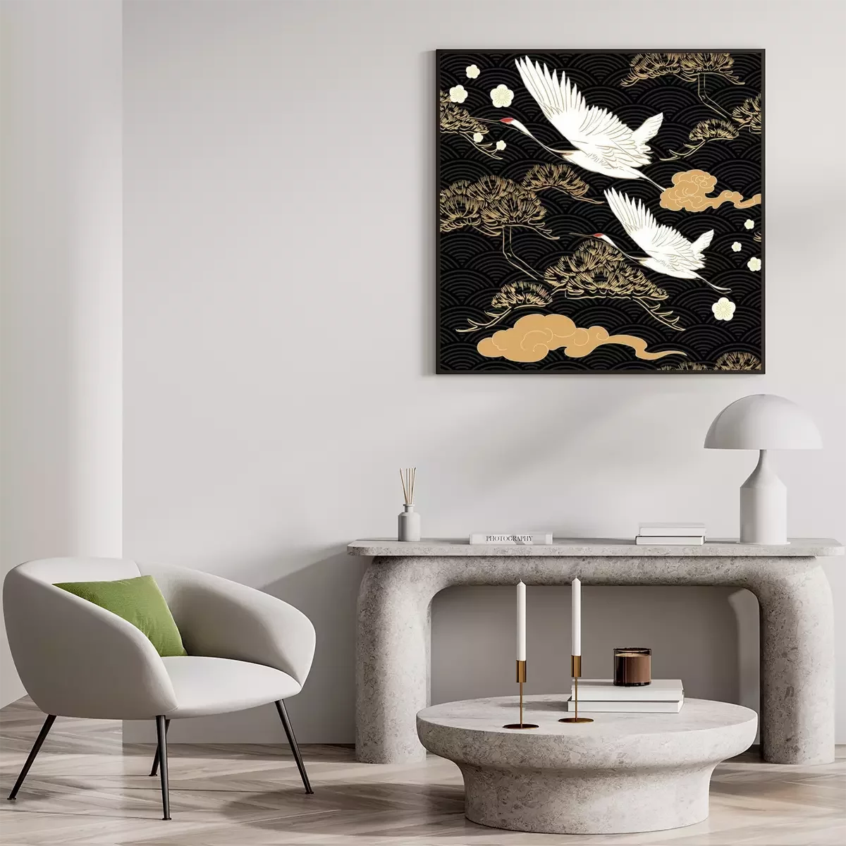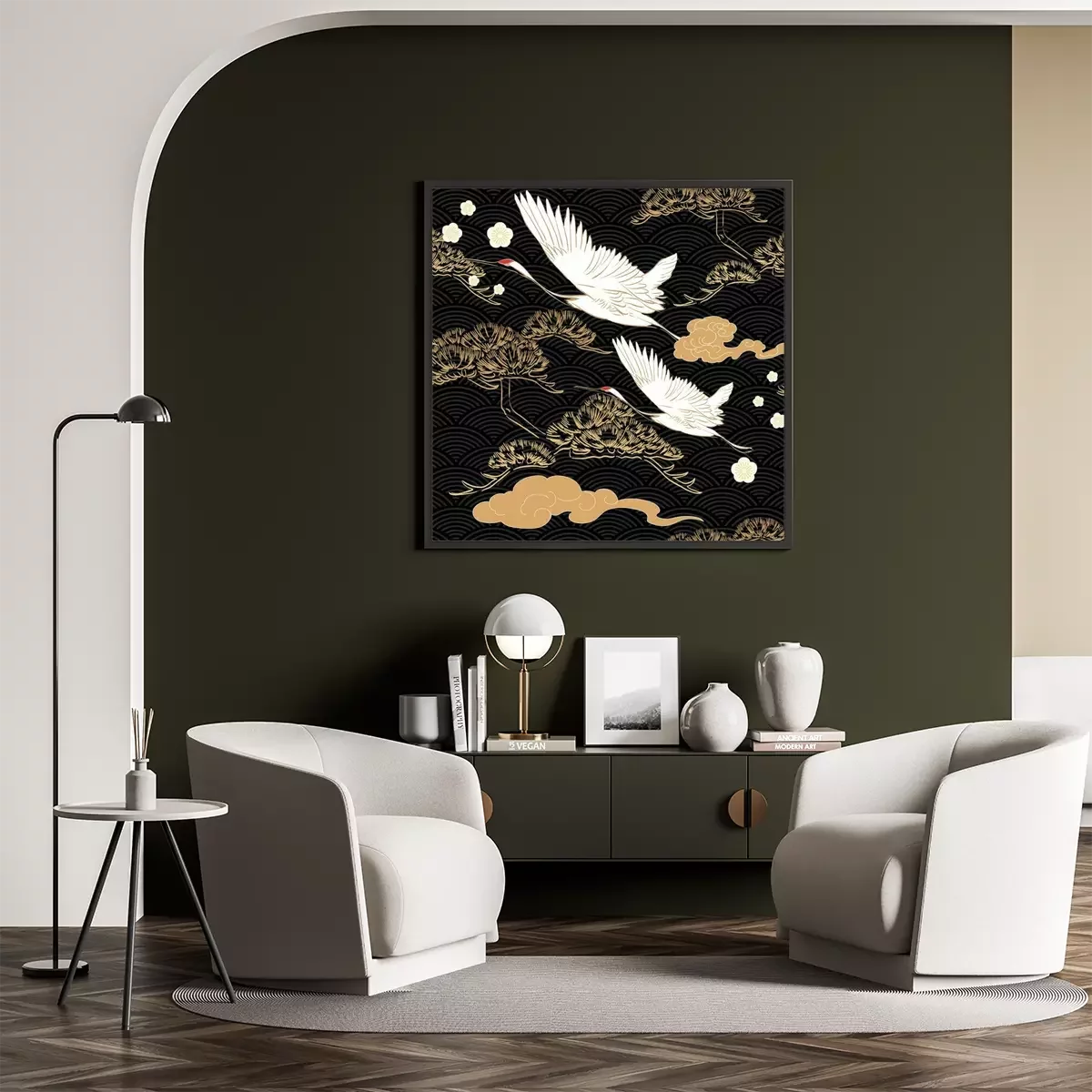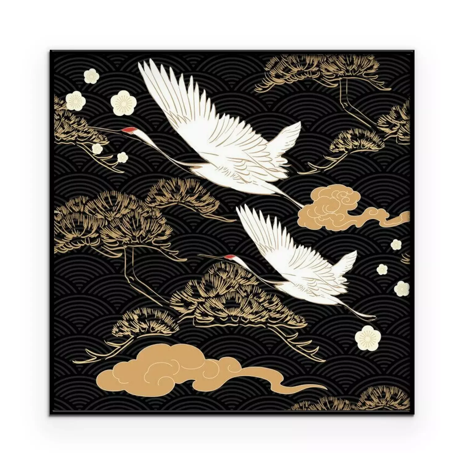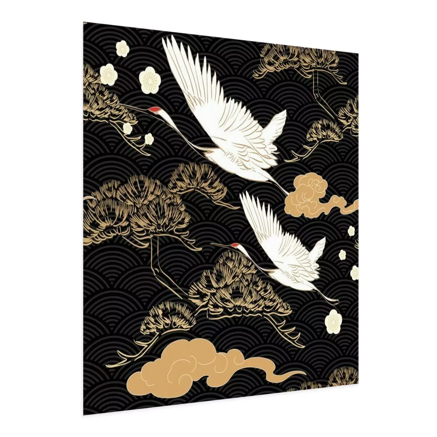 Poster: Mooie kraanvogels op een oosterse achtergrond