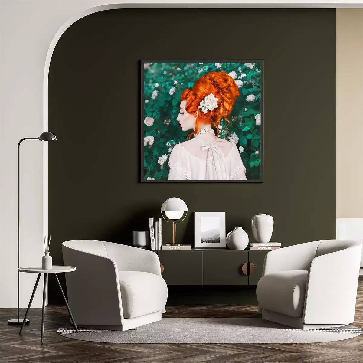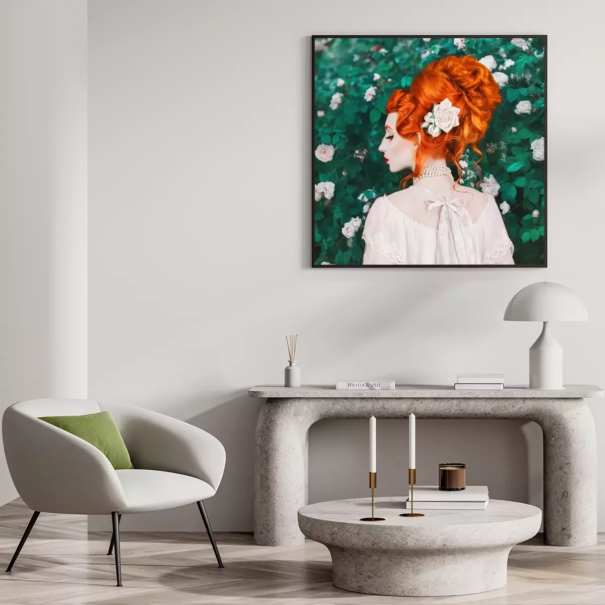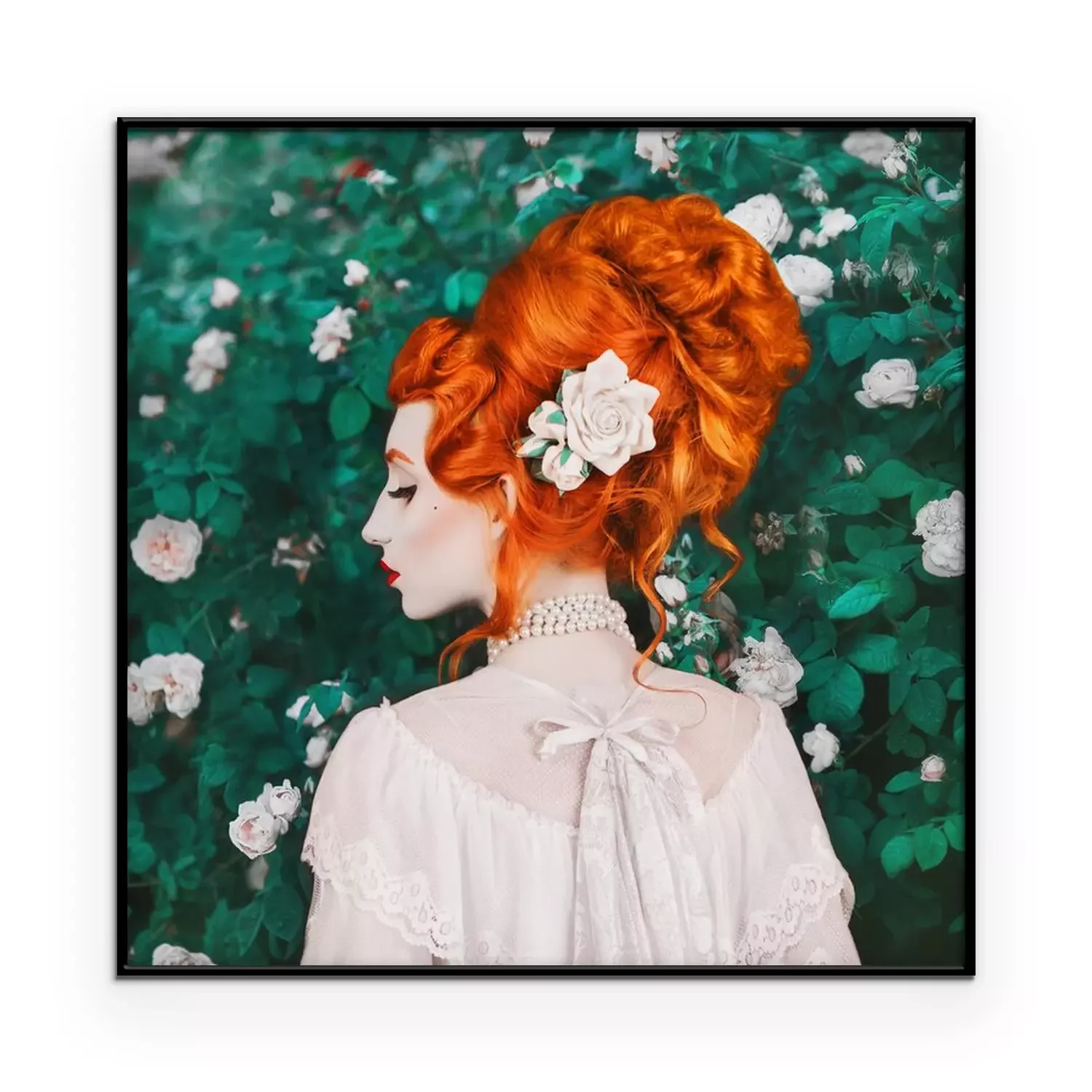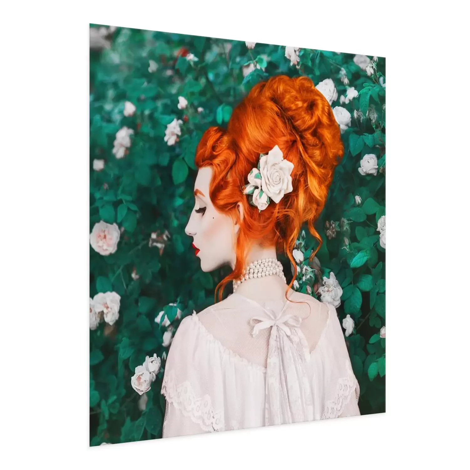 Poster: Mooie redhead vrouw met hoog kapsel in een witte kleding op roze achtergrond. Portret van jonge ongewone bleke meisje met rood haar. Mooi model met stijlvol kapsel met een roos in de tuin