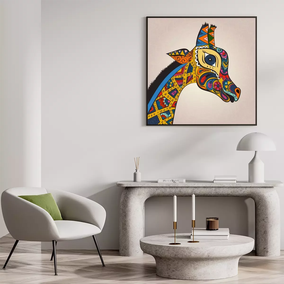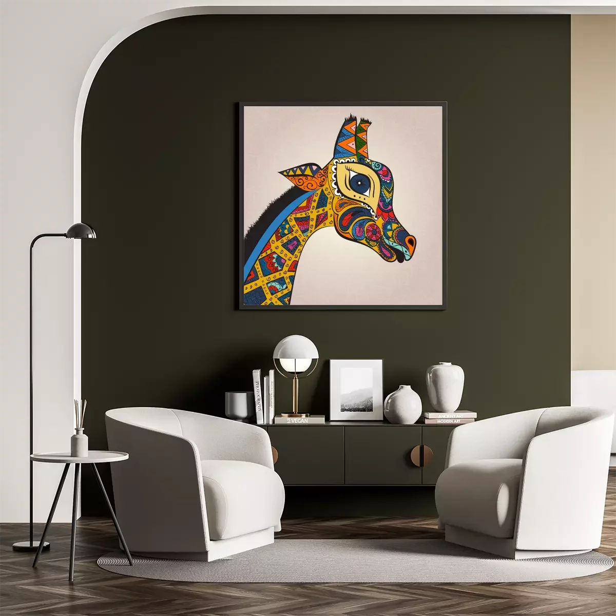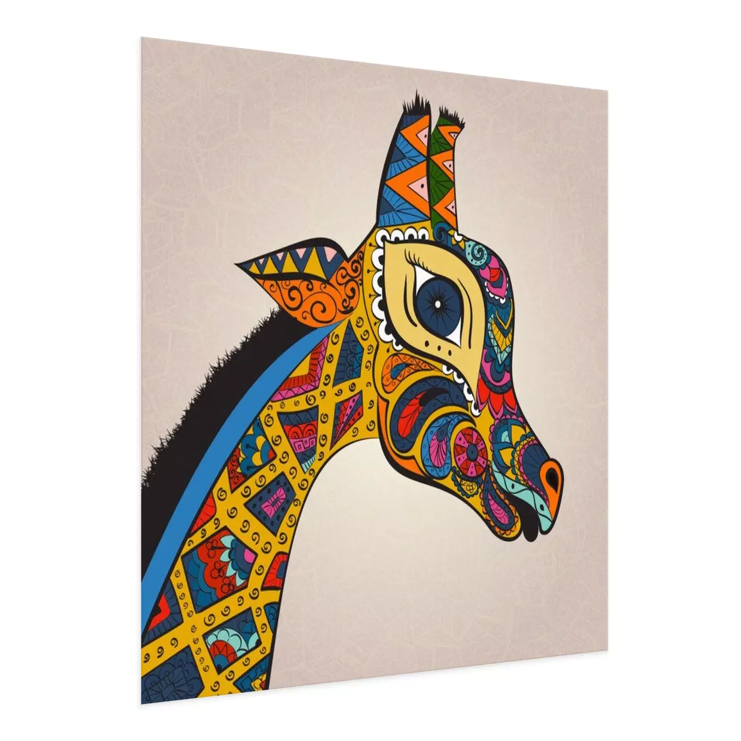 Poster: Mooie volwassen Giraffe. Hand getekende illustratie van sier giraffe. Gekleurde giraf op sierachtergrond