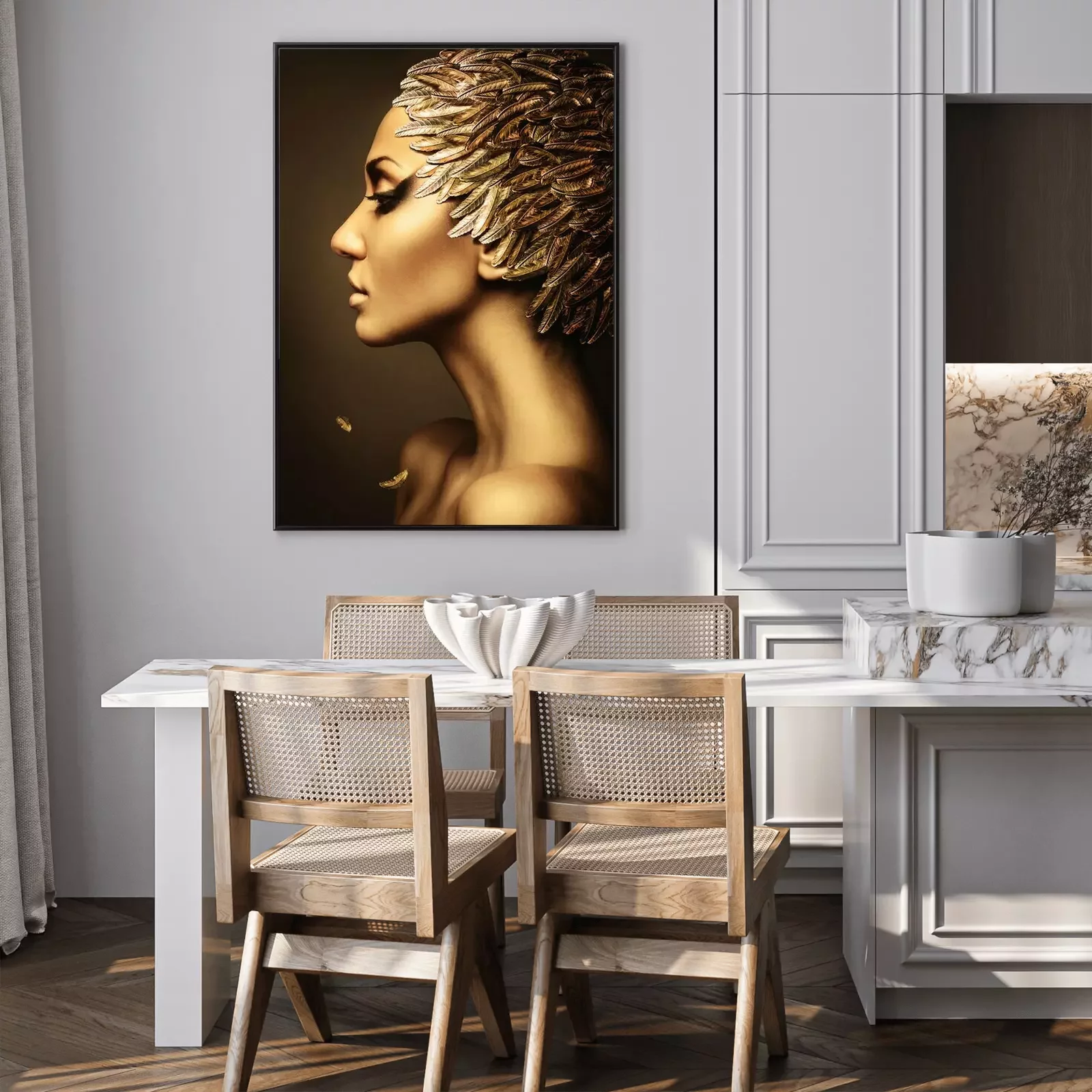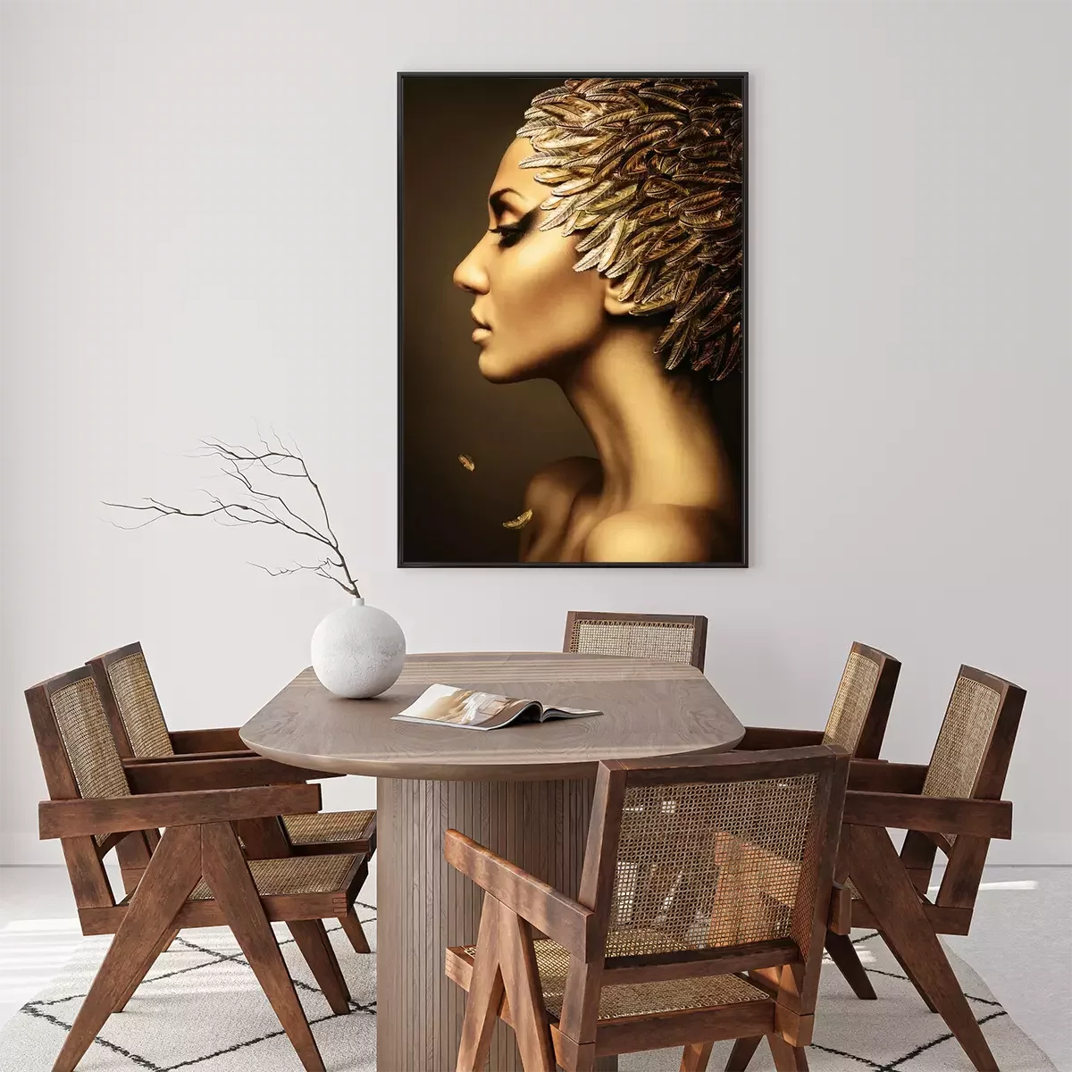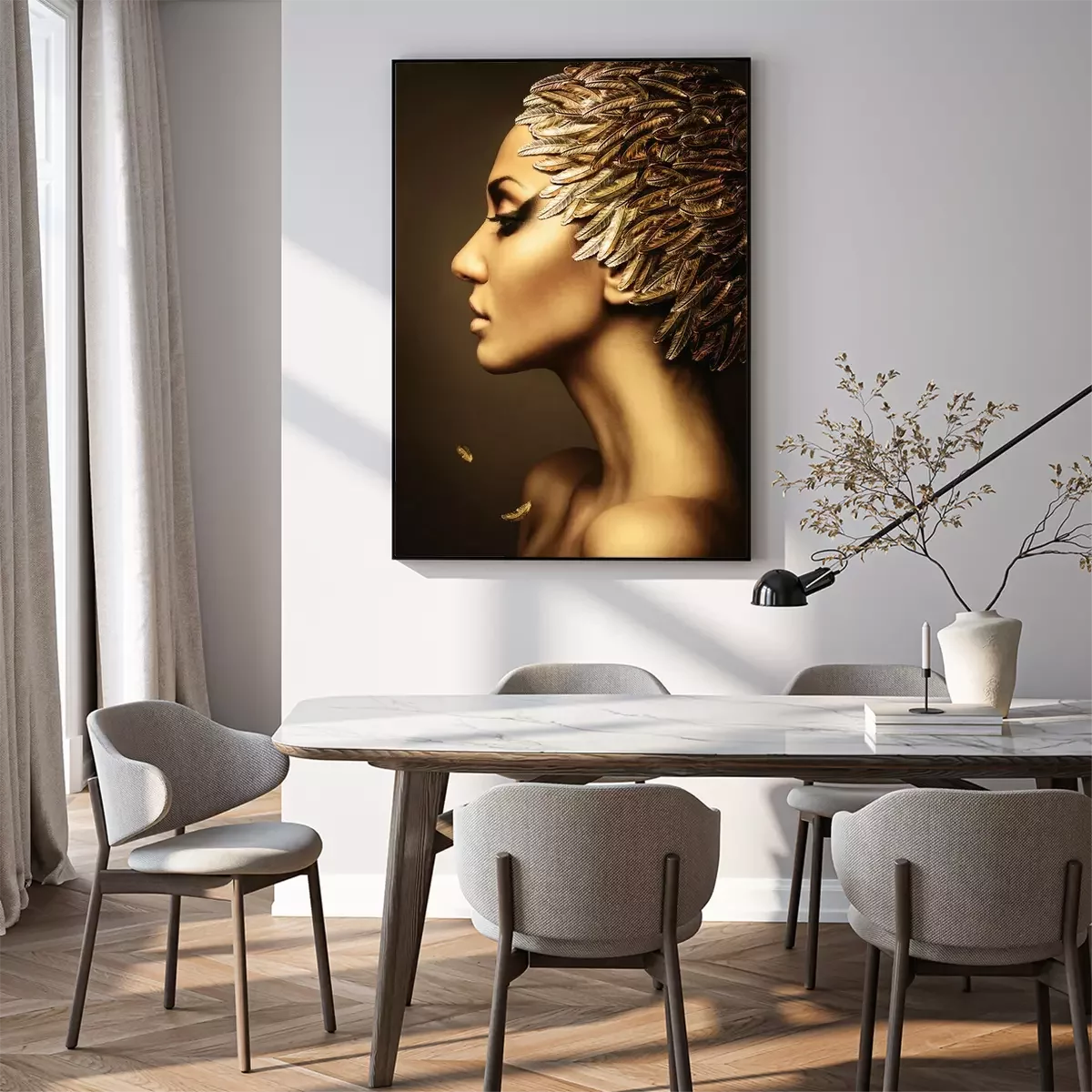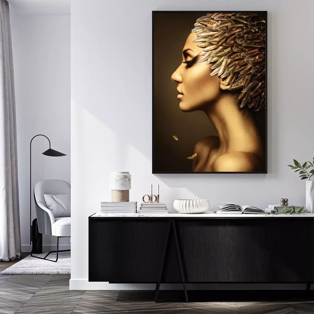 Poster mooie vrouw met gouden veren hoed