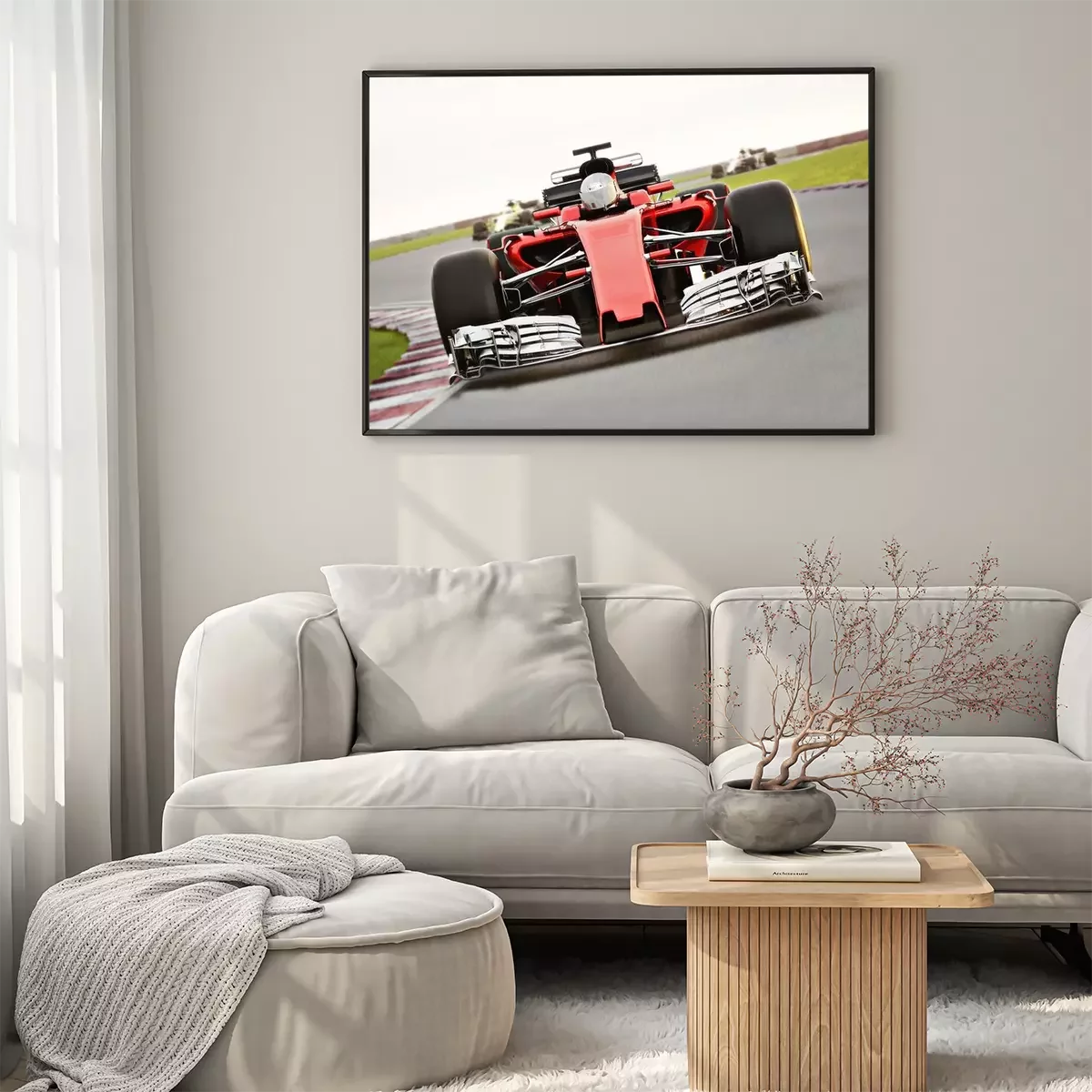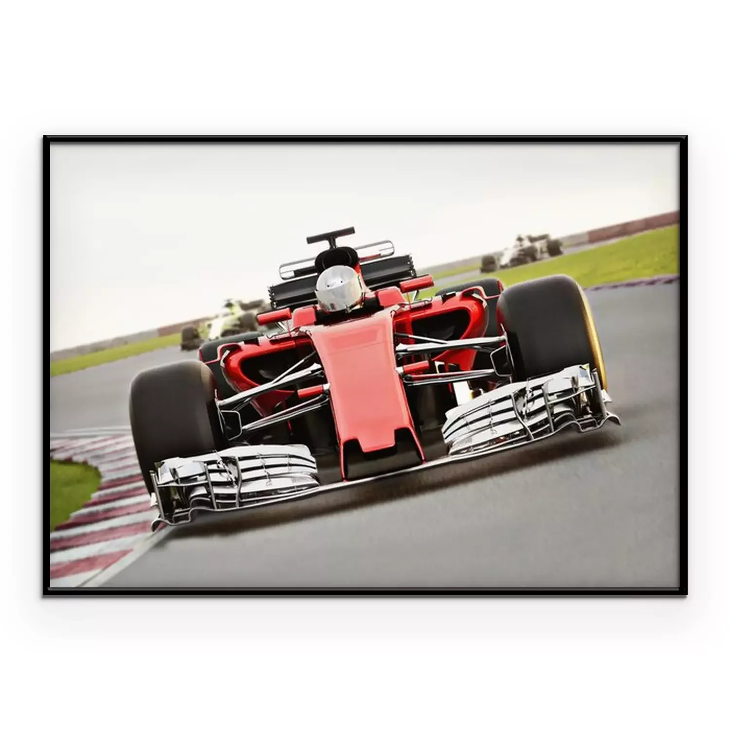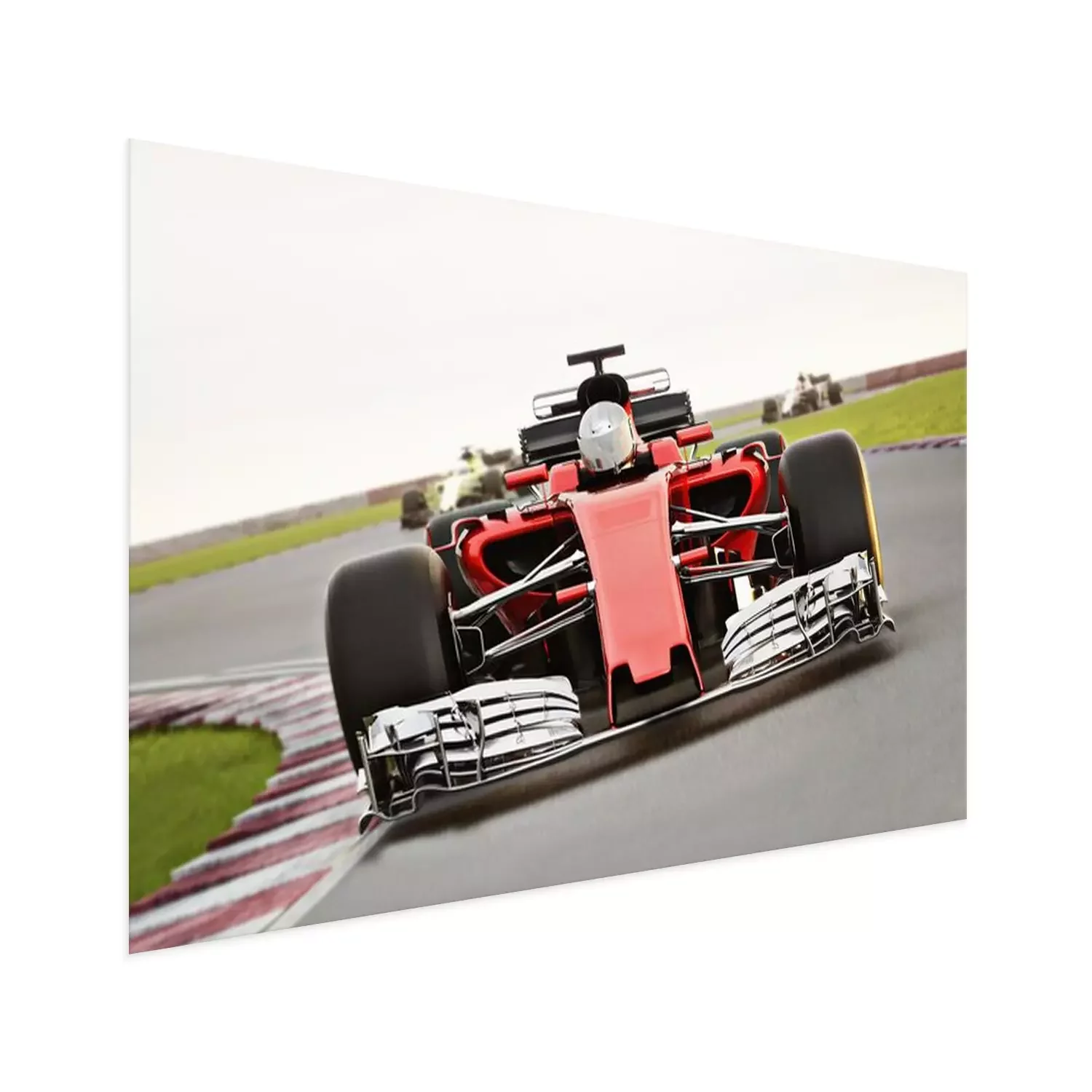 Poster Motor sports competitive team racing. Fast moving generic race car leading the pack racing down the track with motion blur. 3d rendering with room for text or copy space