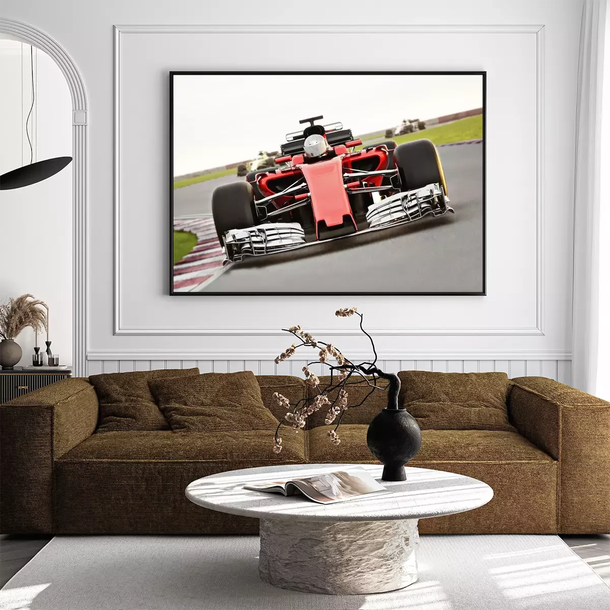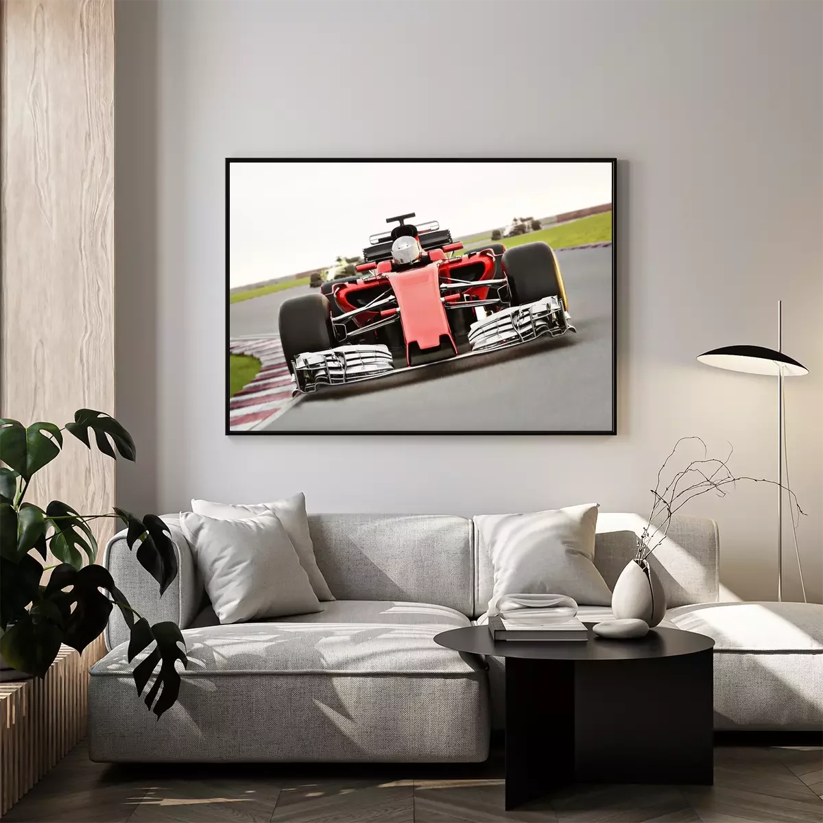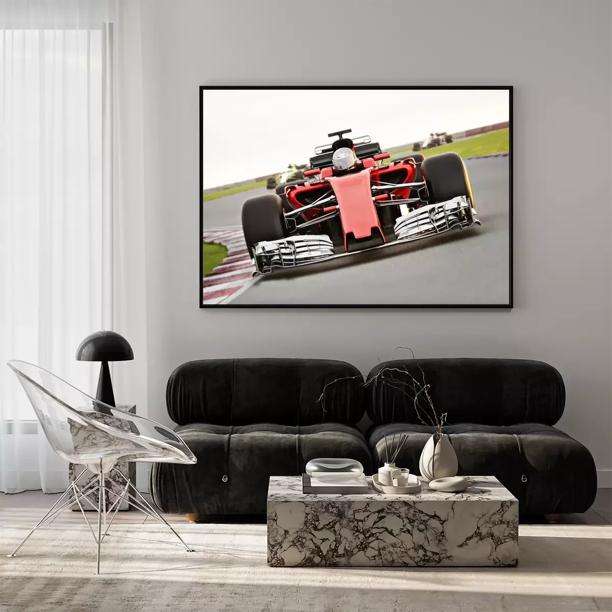 Poster Motor sports competitive team racing. Fast moving generic race car leading the pack racing down the track with motion blur. 3d rendering with room for text or copy space