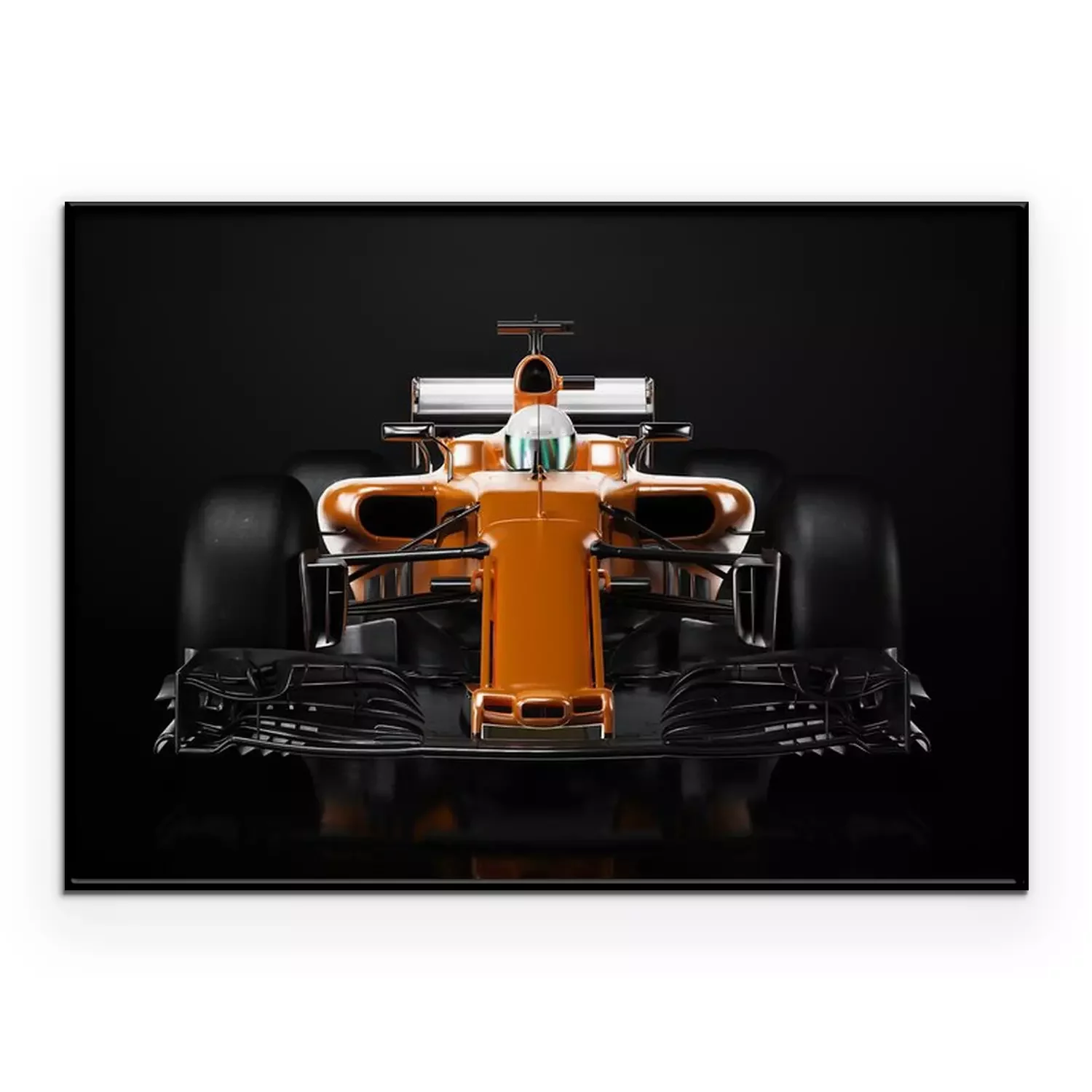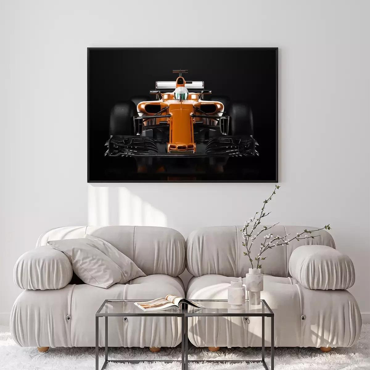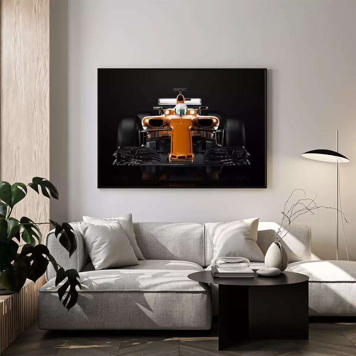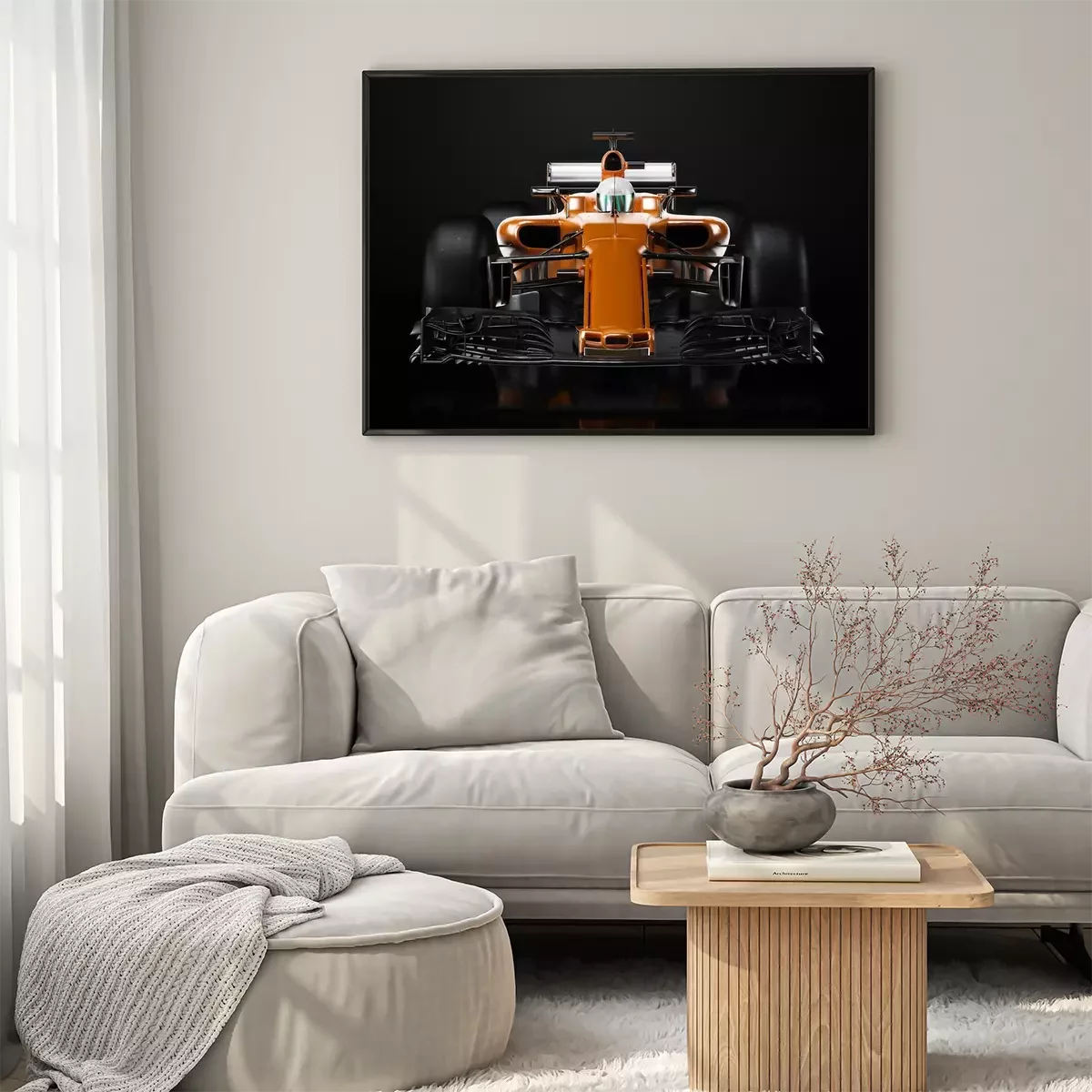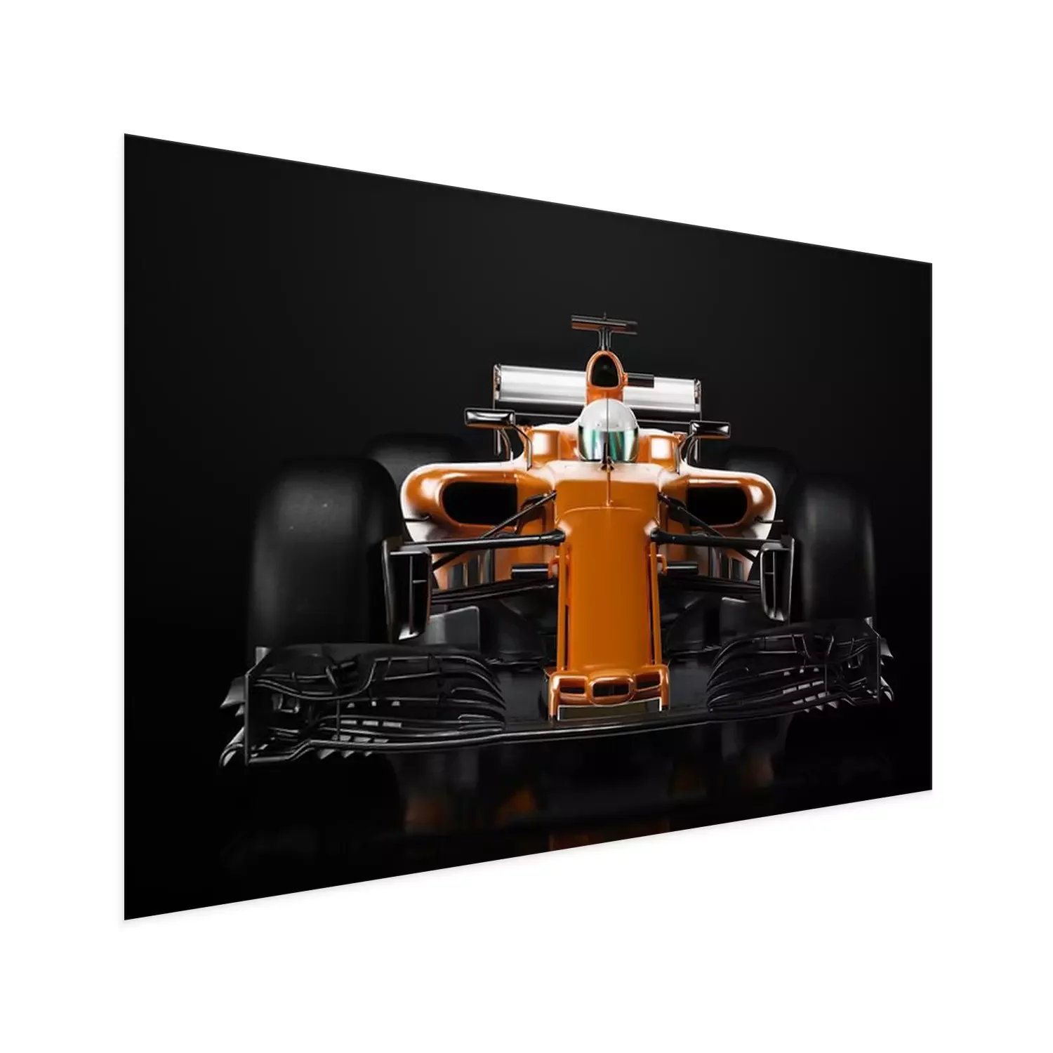 Poster Motor sports competitive team racing. Sleek generic orange race car and driver with front view perspective, studio lighting and reflective background. 3d rendering