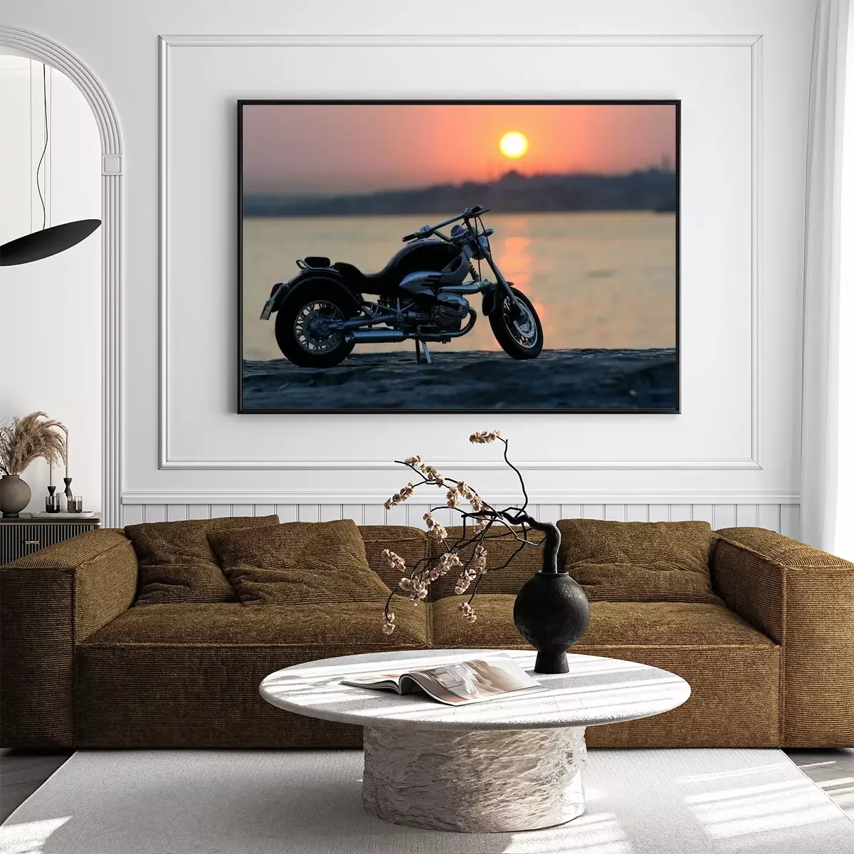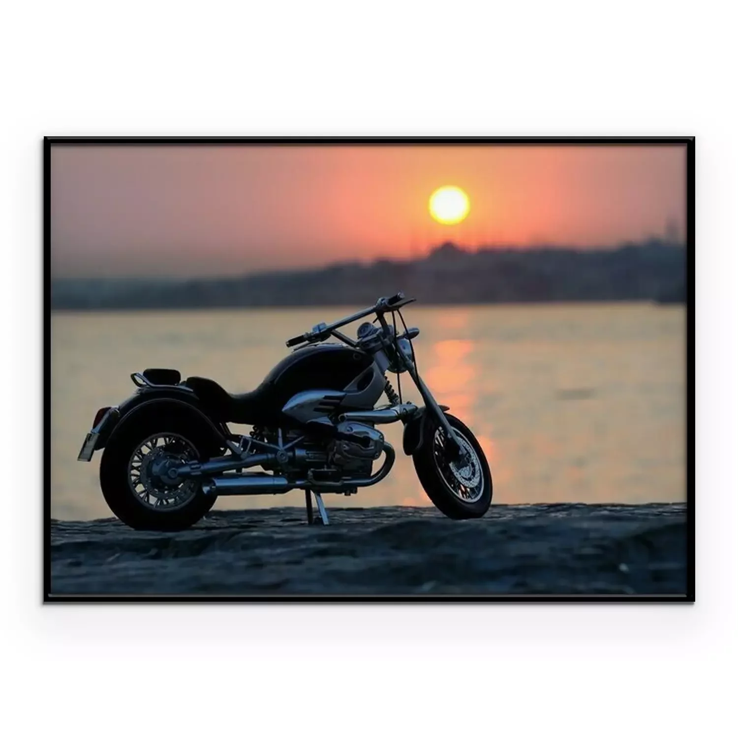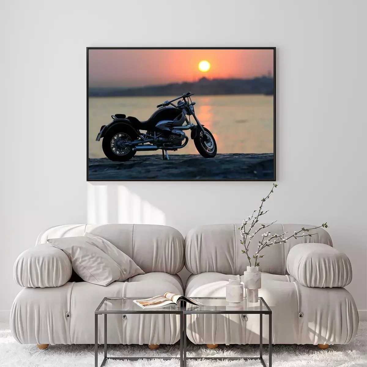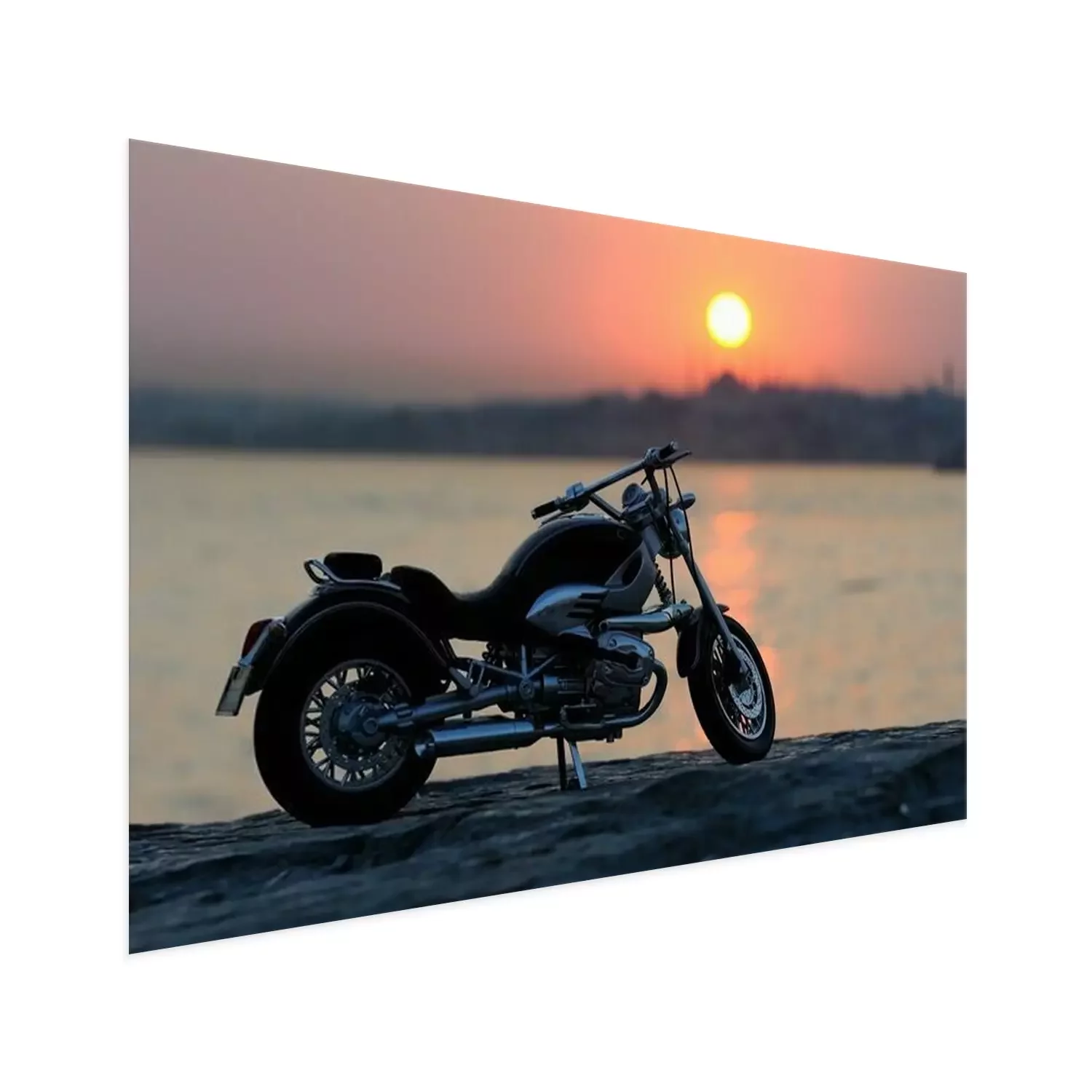 Poster: Motorfiets tegen de achtergrond van de zonsondergang