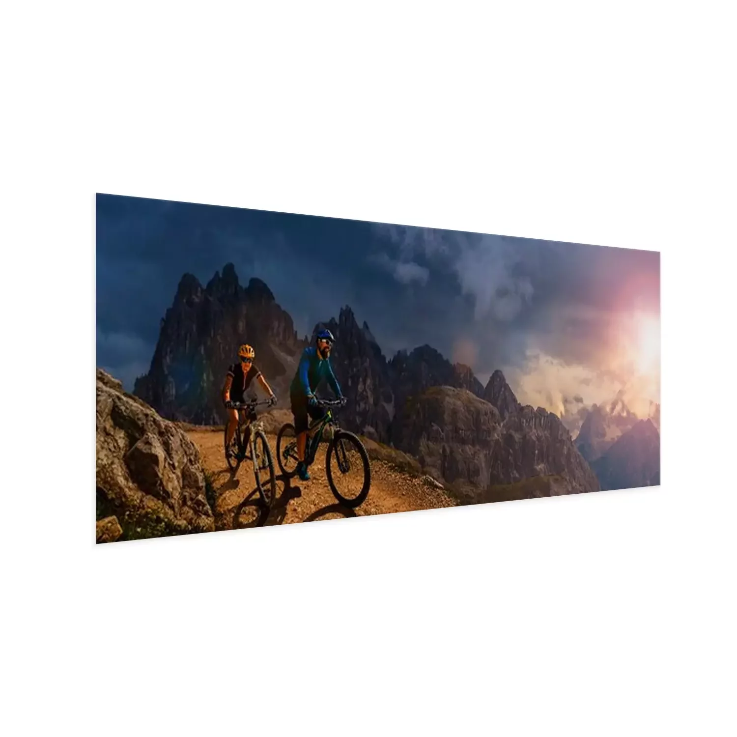 Cycling woman and man riding on bikes in Dolomites mountains landscape. Couple cycling MTB enduro trail track. Outdoor sport activity.