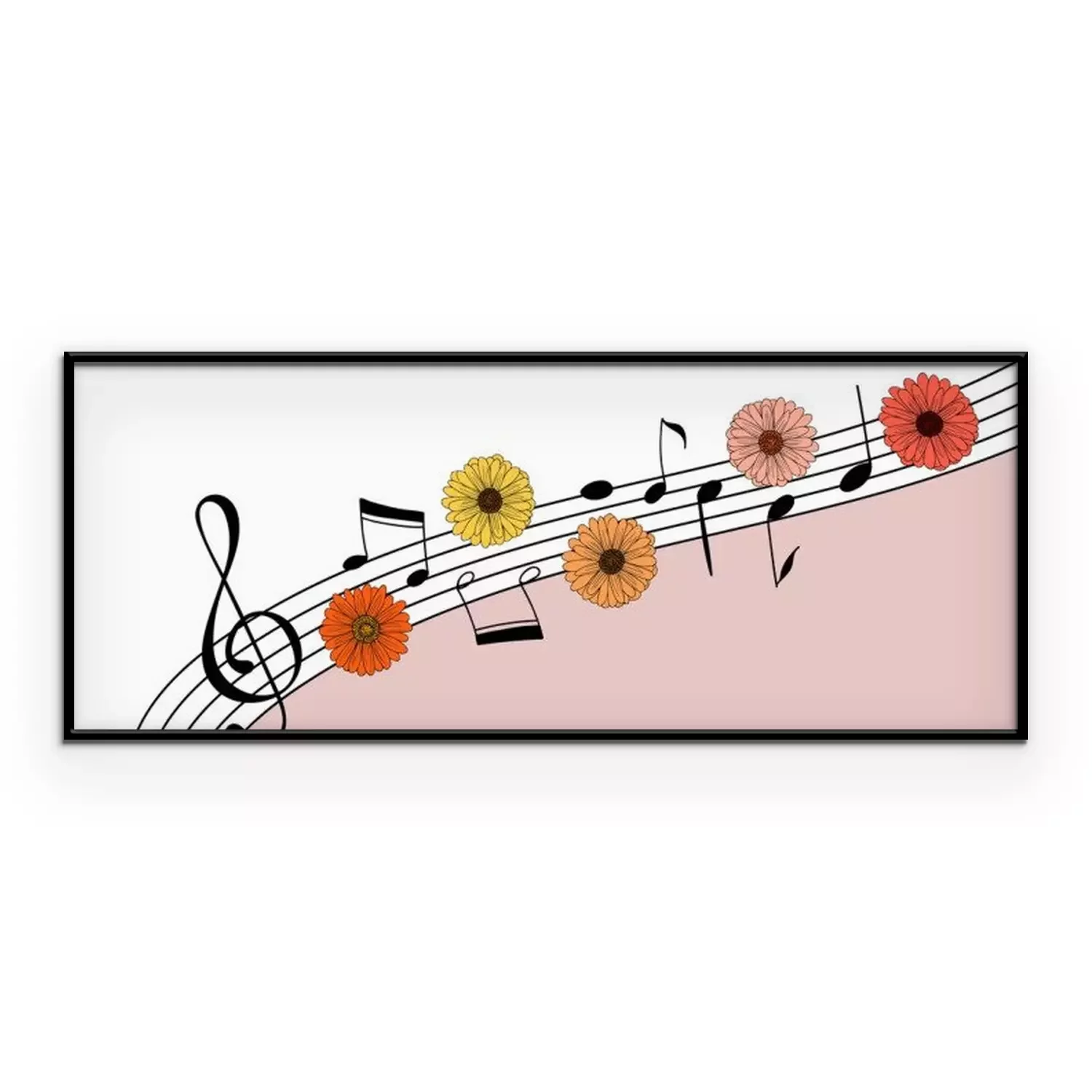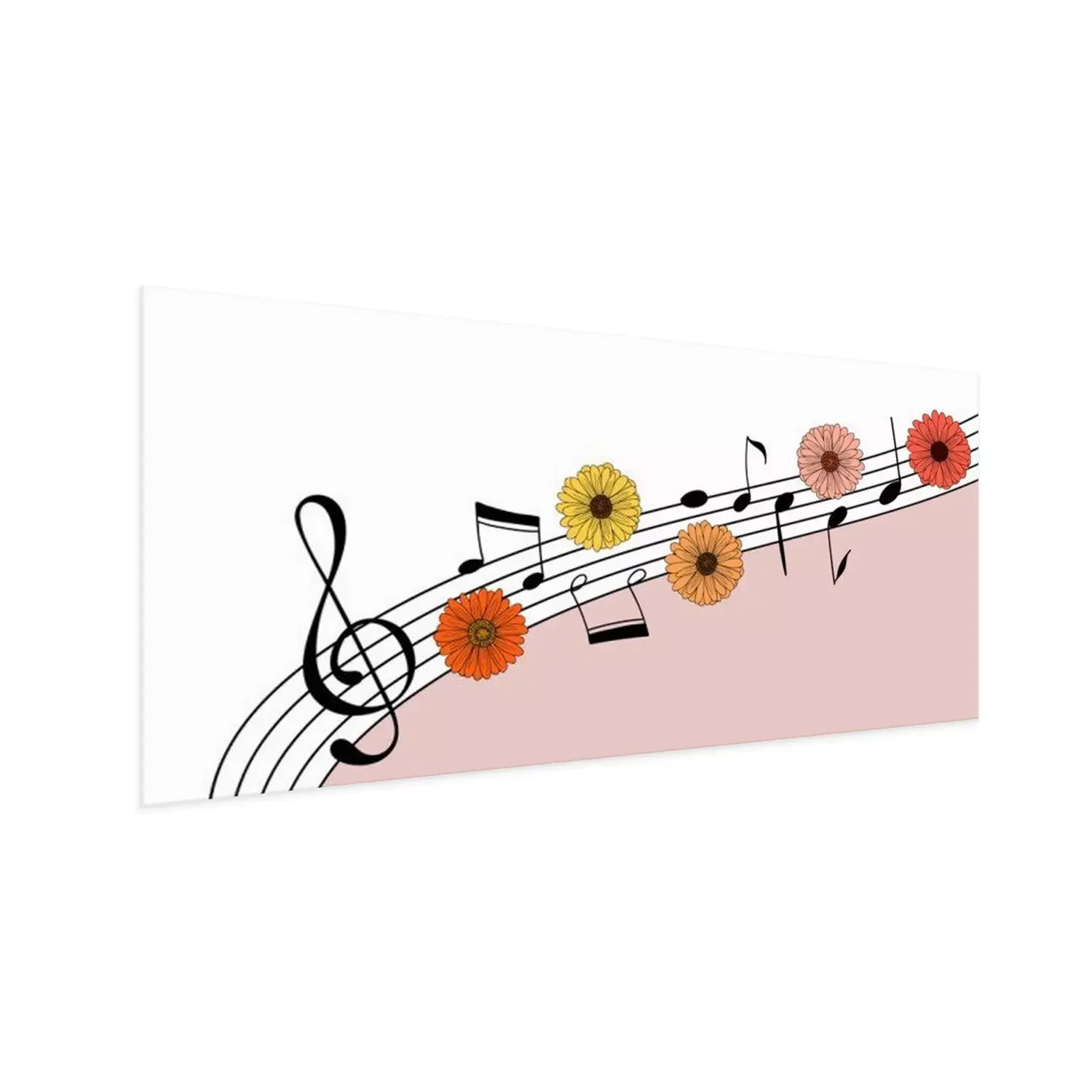 Poster Music and flowers invitation background. Creative template with a clef, hand drawn music notes and flowers. Great to place text for an open air concert in a garden or park. Vector