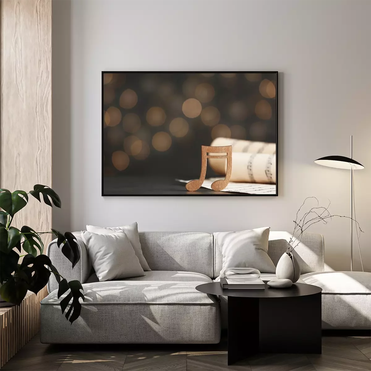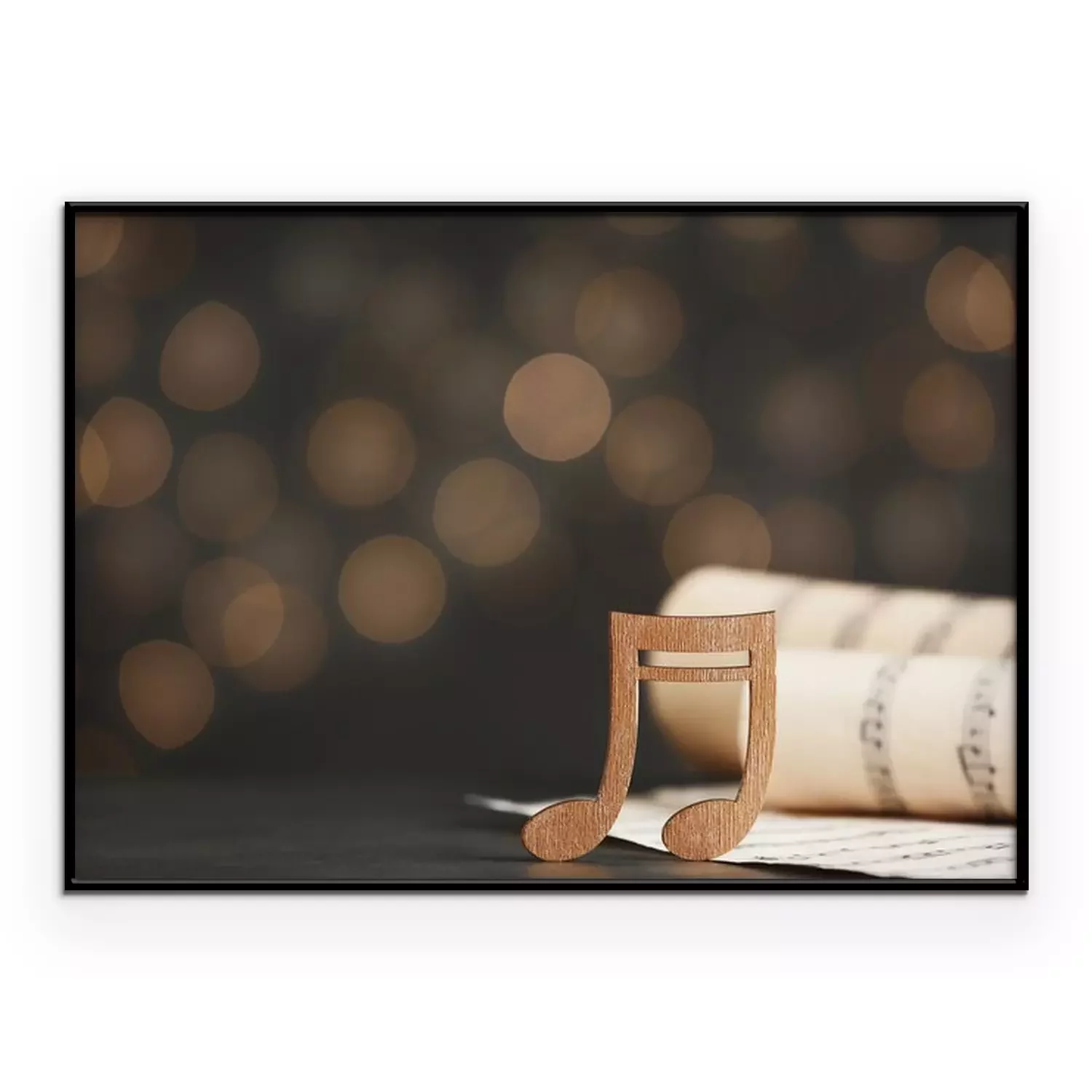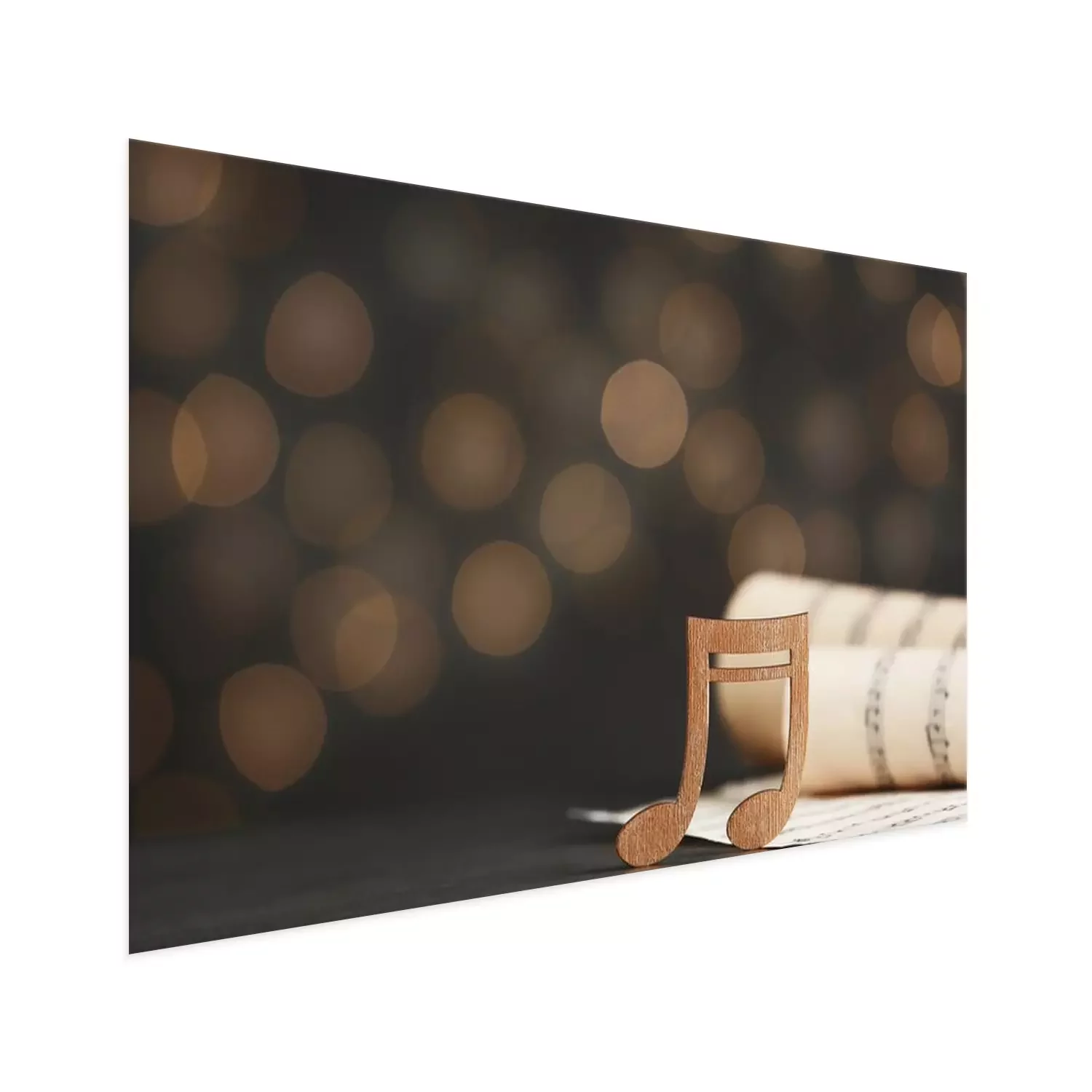Poster: Music note and sheets on table against blurred lights, space for text. Bokeh effect