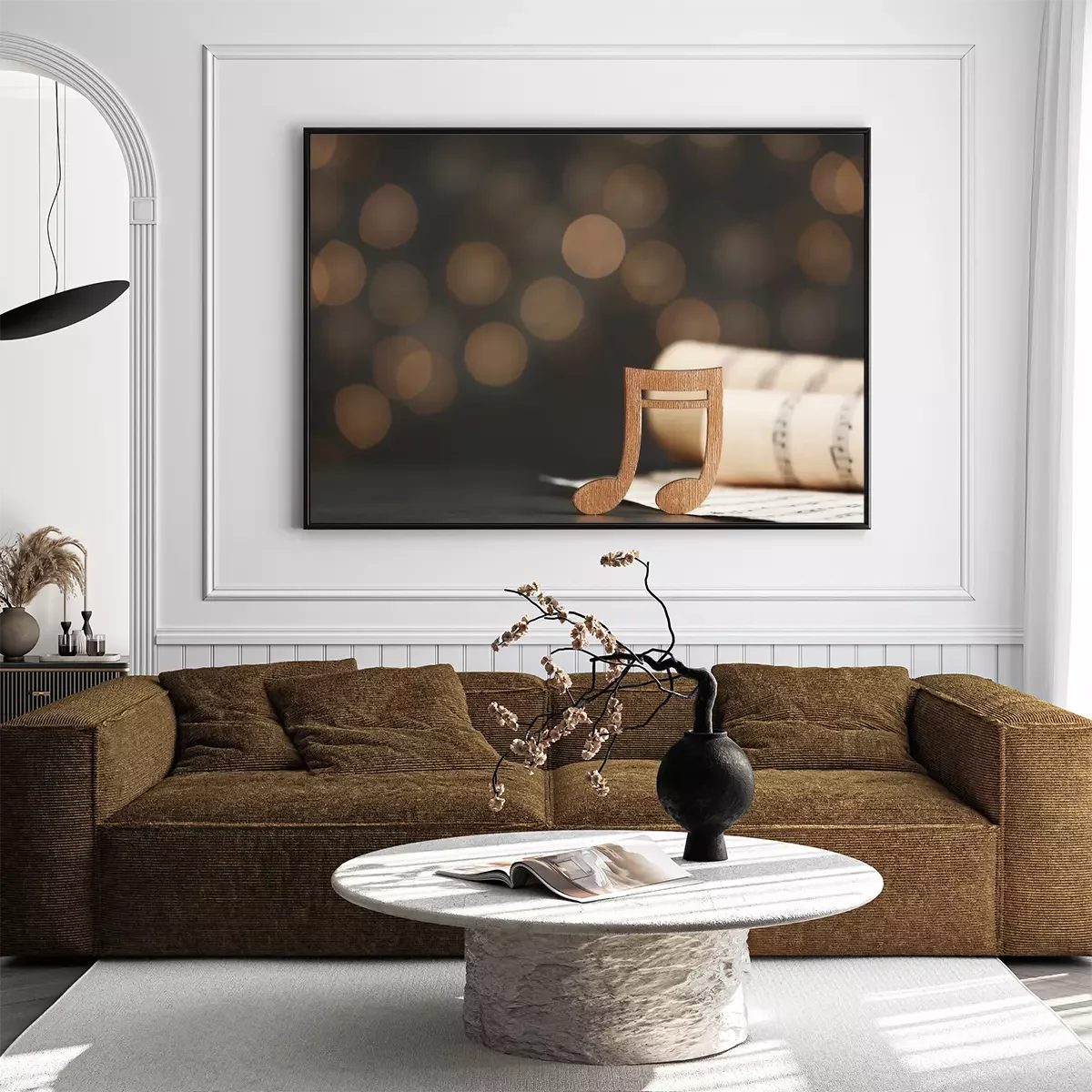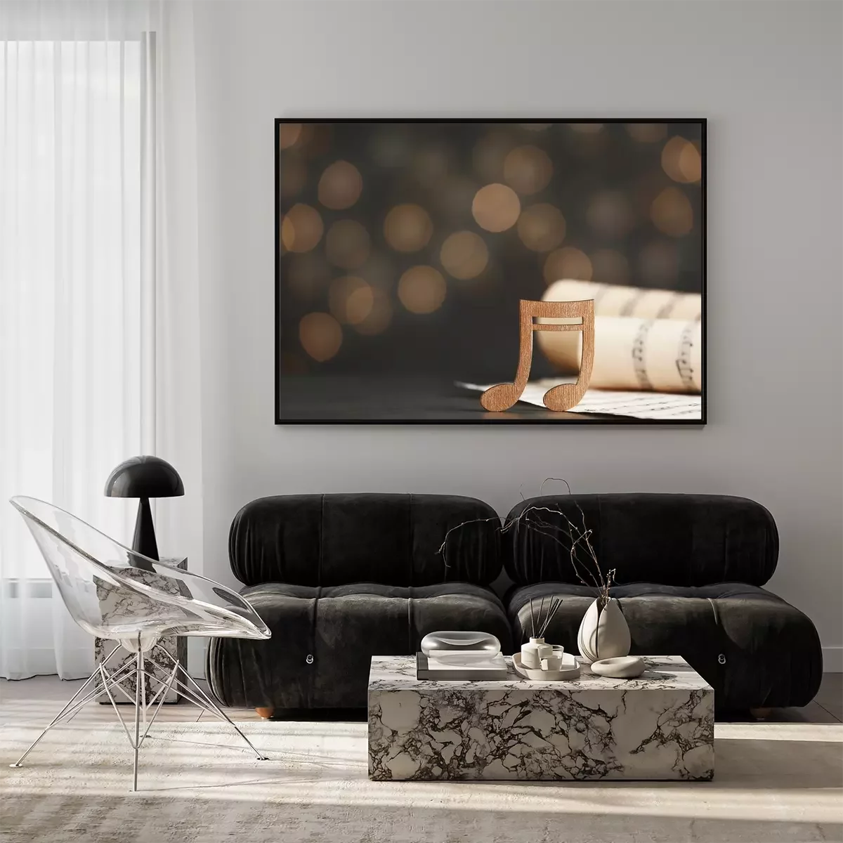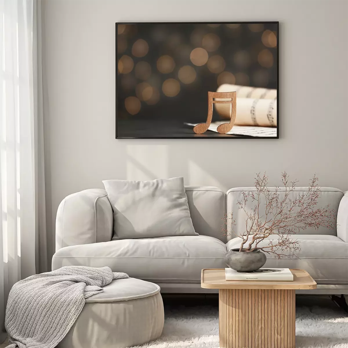 Poster: Music note and sheets on table against blurred lights, space for text. Bokeh effect