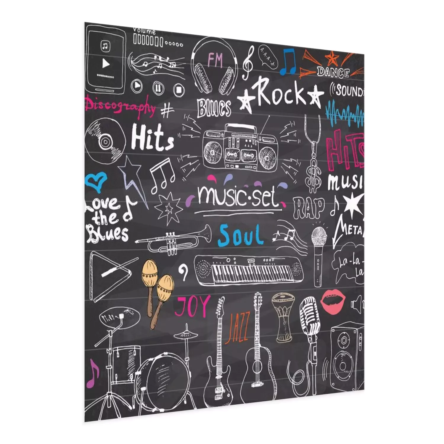 Poster Muziek Items doodle pictogrammen instellen. Hand getrokken schets met nota, instrument, microfoon, gitaar, hoofdtelefoon, drums, muziekspeler en muziekstijlen letterig tekenen, vector illustratie, bor