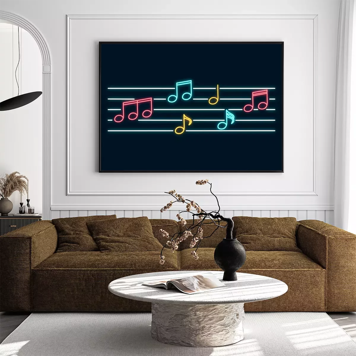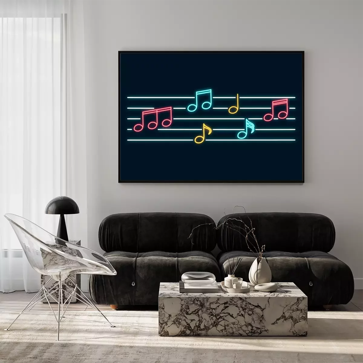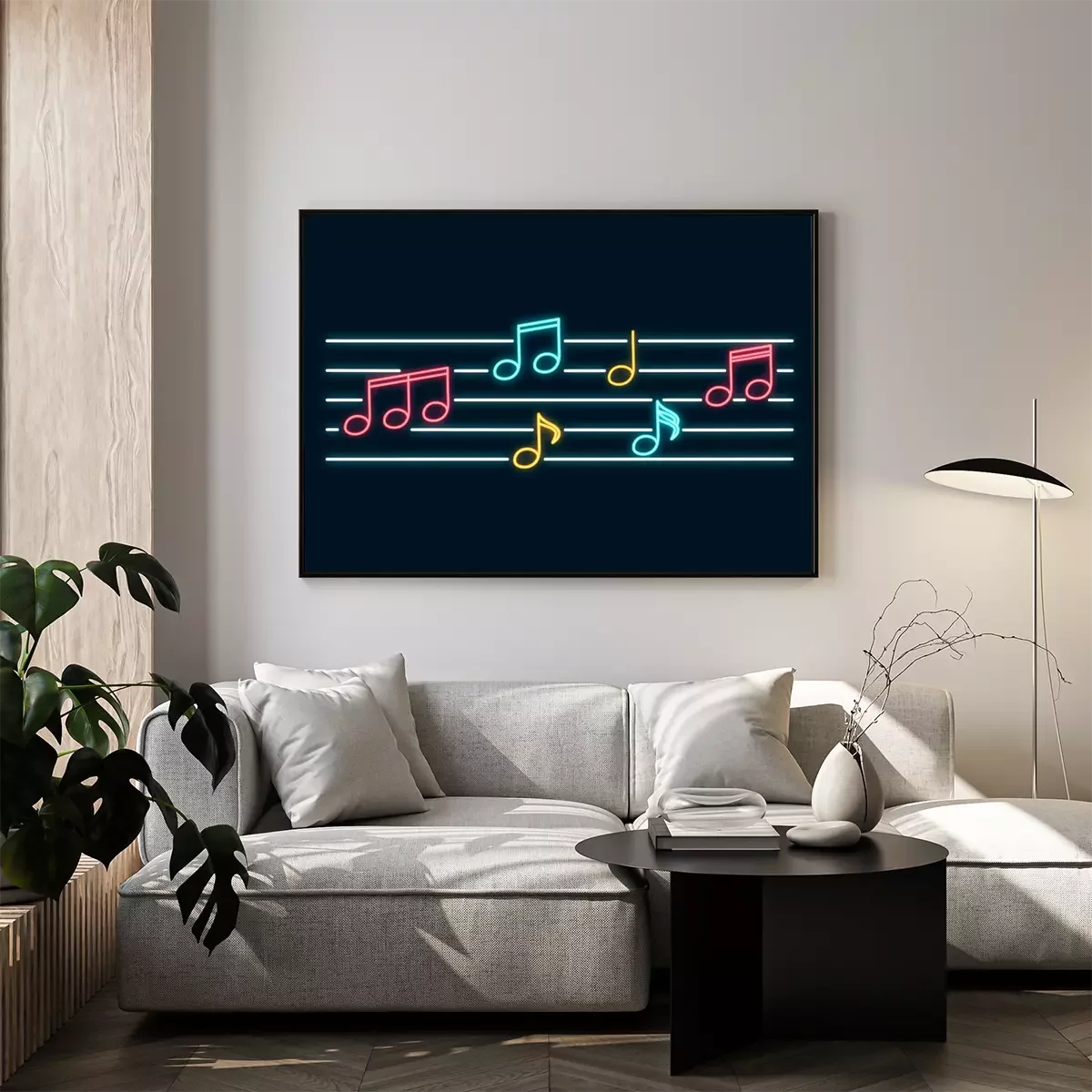 Poster: Muziek notities neon teken grens. Led Concept voor muziekwinkel met sleutel. Vector geïsoleerde illustratie.