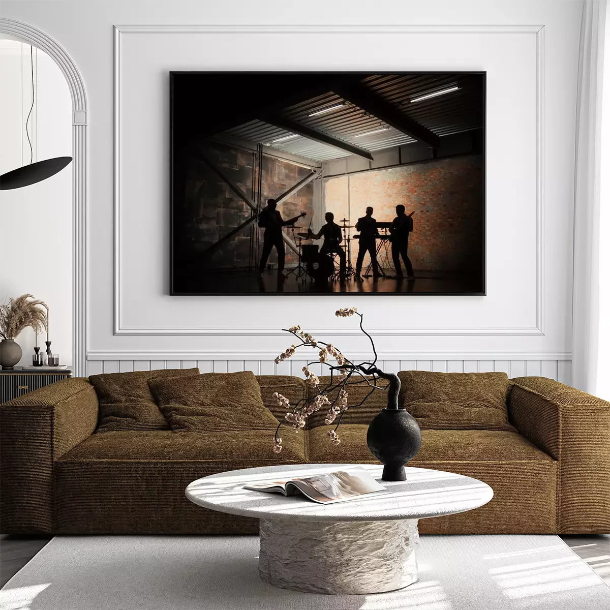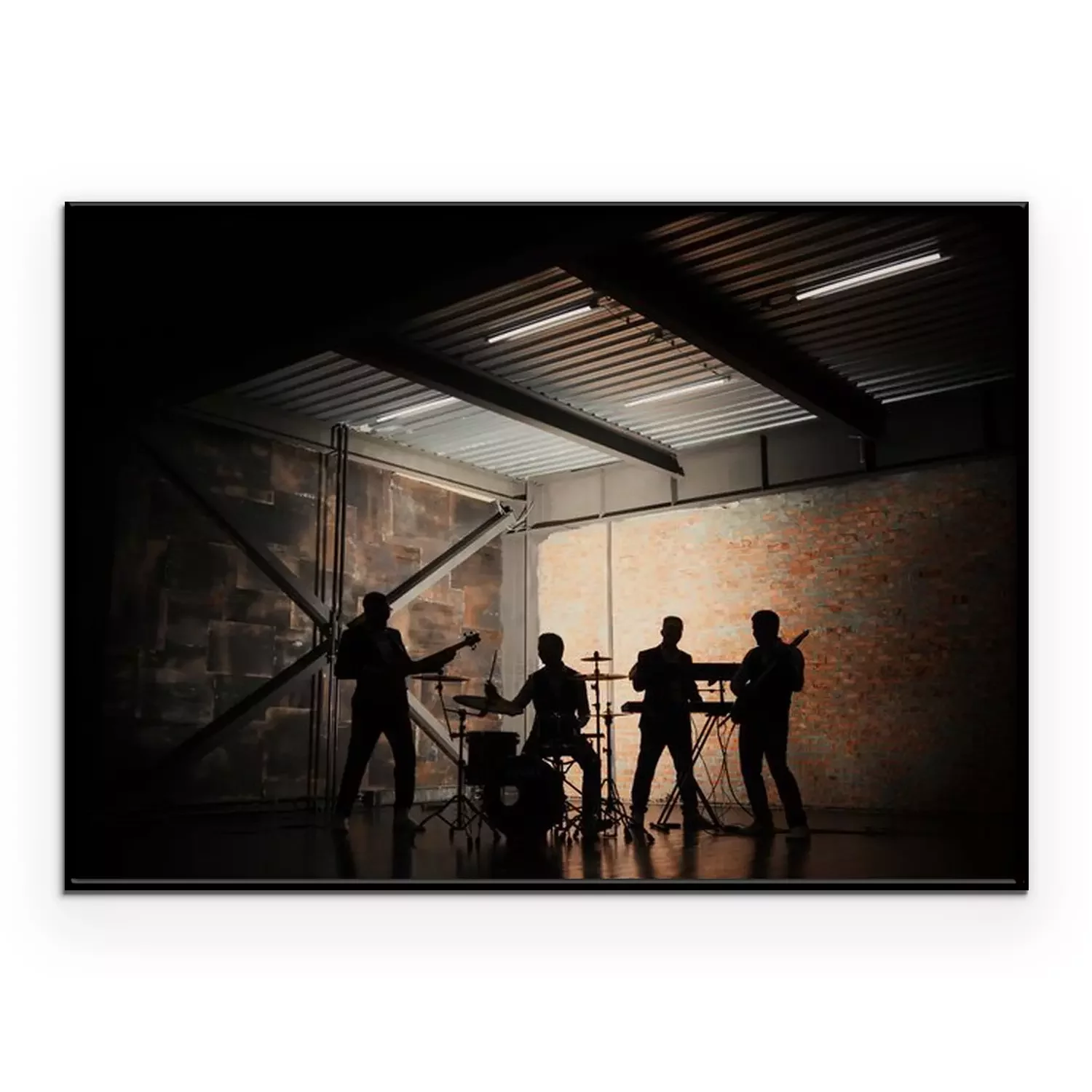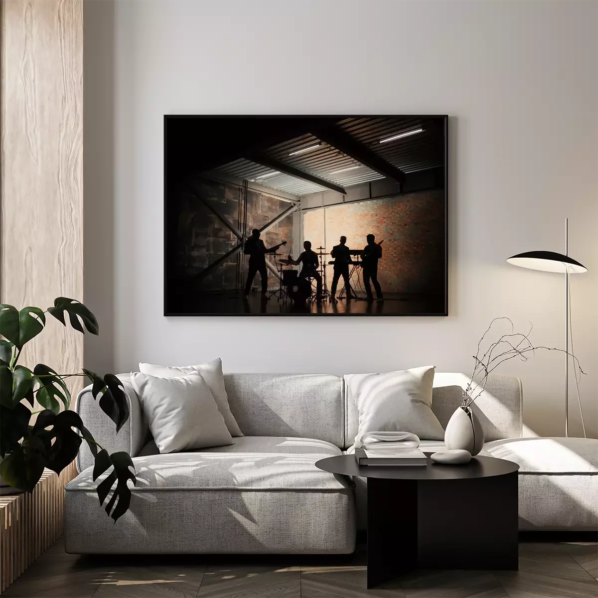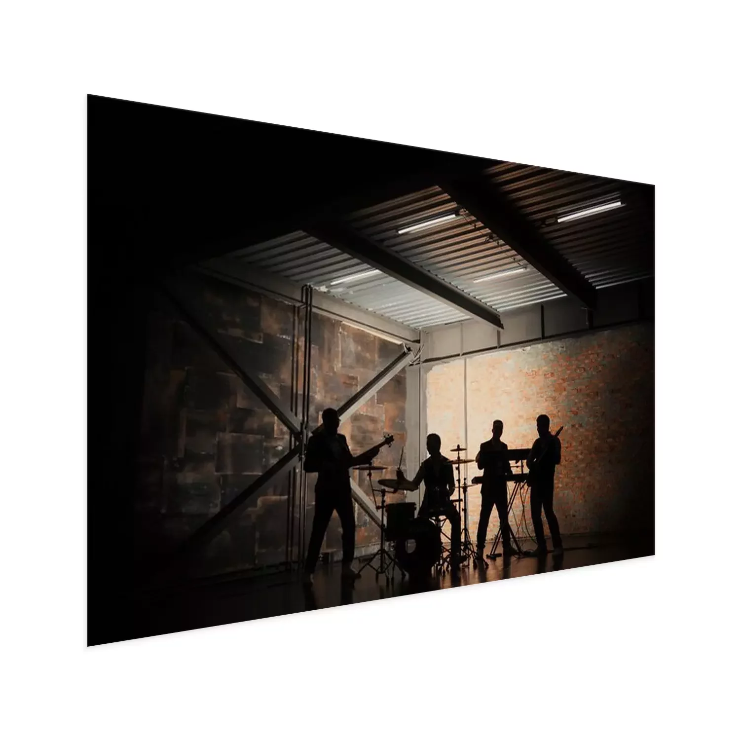Poster: Muziekband en mode. Knappe jonge mannen in kostuums rock spelen en lied zingen. Bandsilhouetten met op een concert.