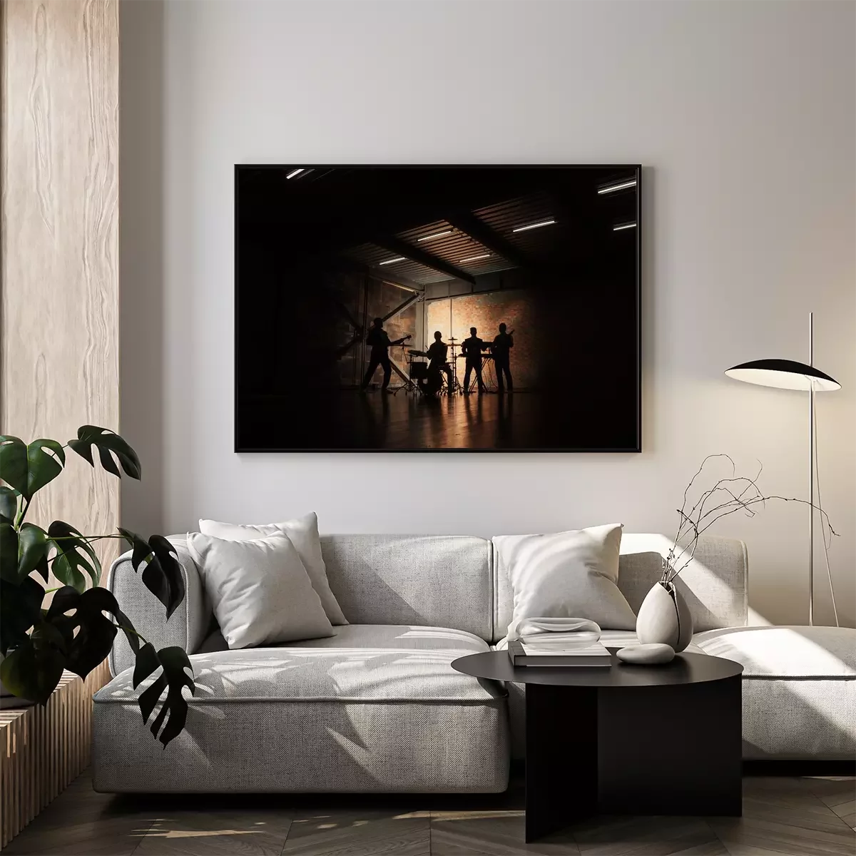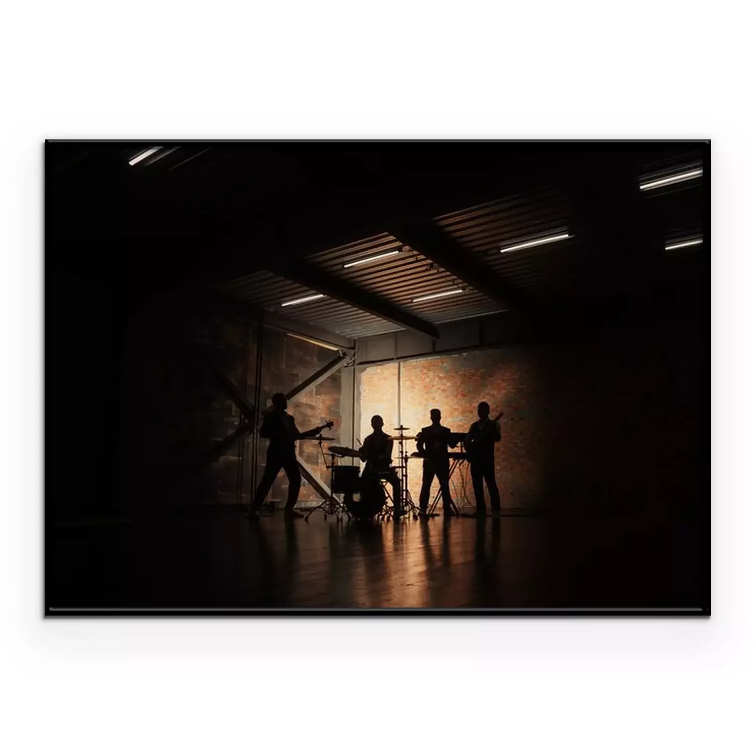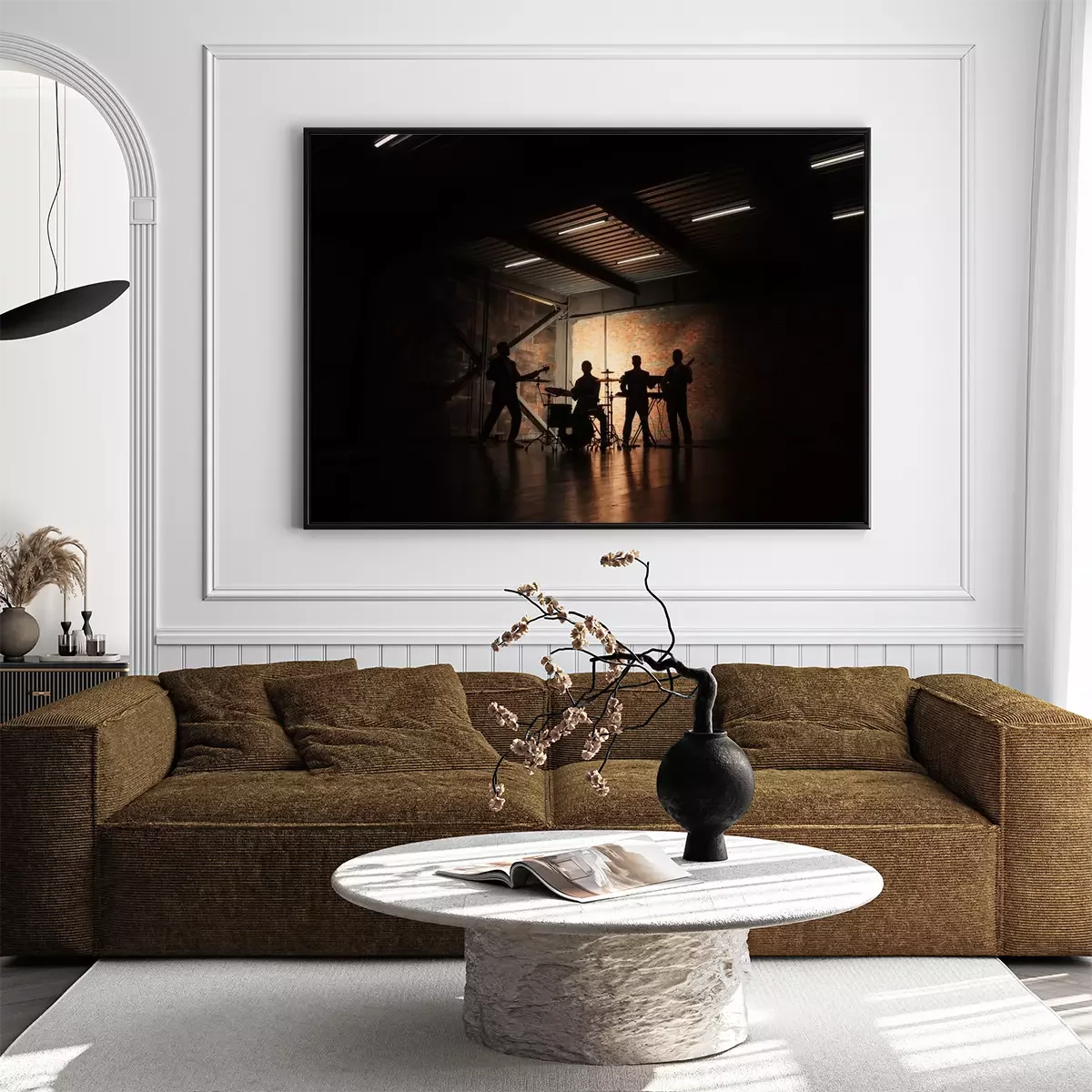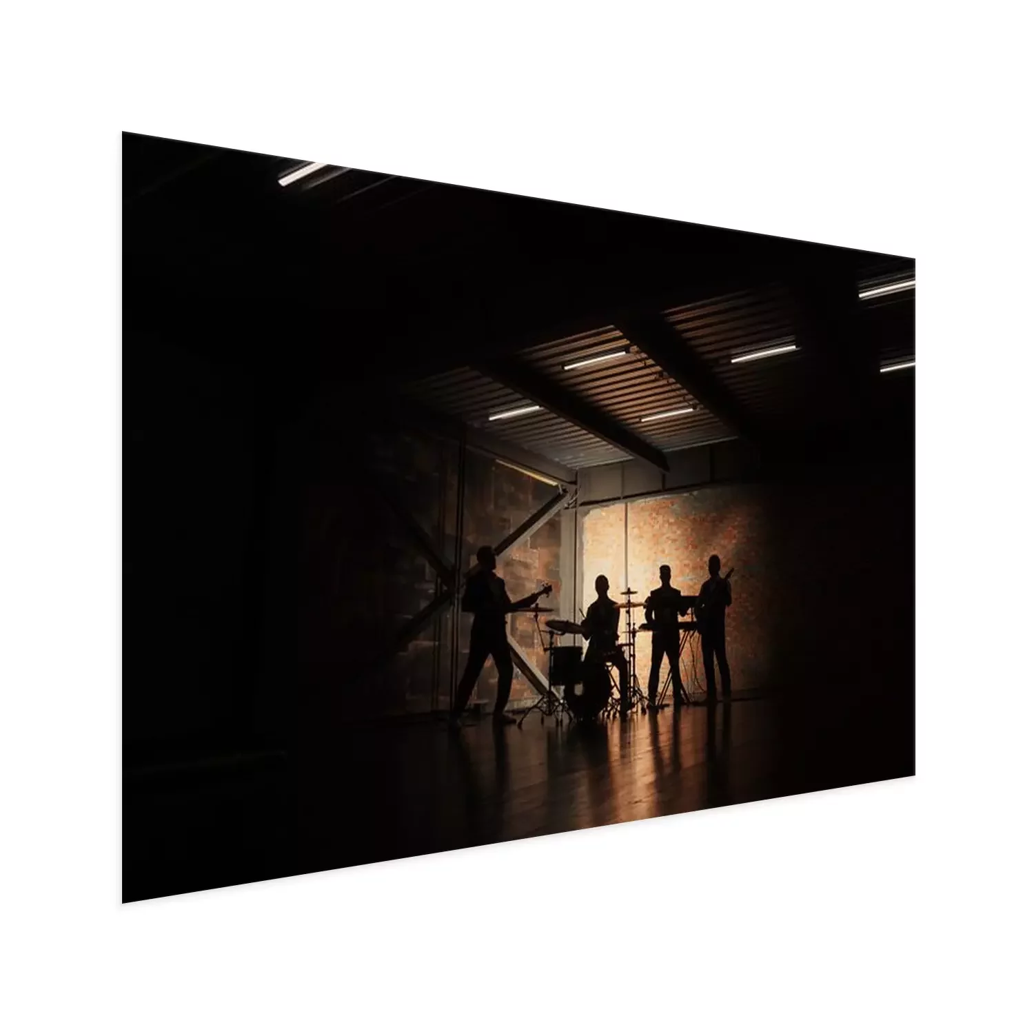 Poster: Muziekband en mode. Knappe jonge mannen in kostuums rock spelen en lied zingen. Bandsilhouetten met op een concert.