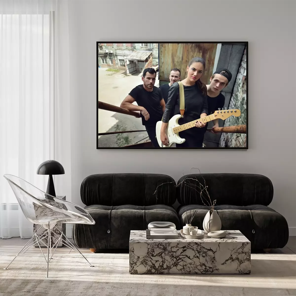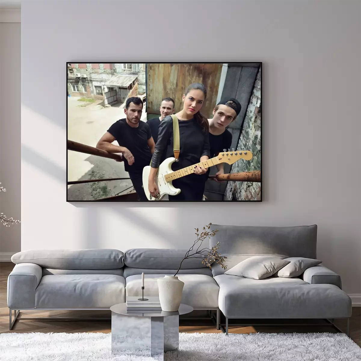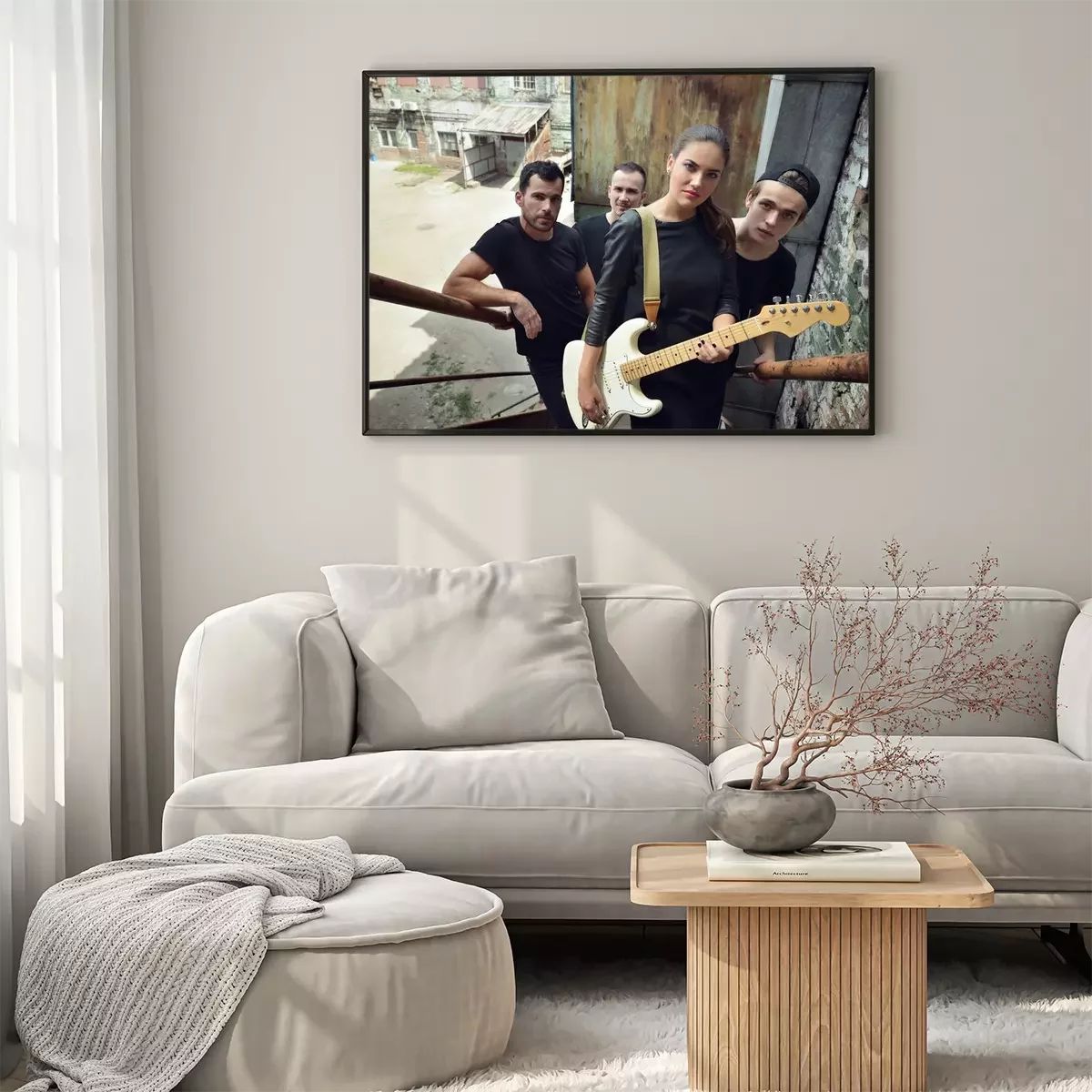 Poster: Muziekband outdoor portret. Muzikanten en vrouw solist poseren