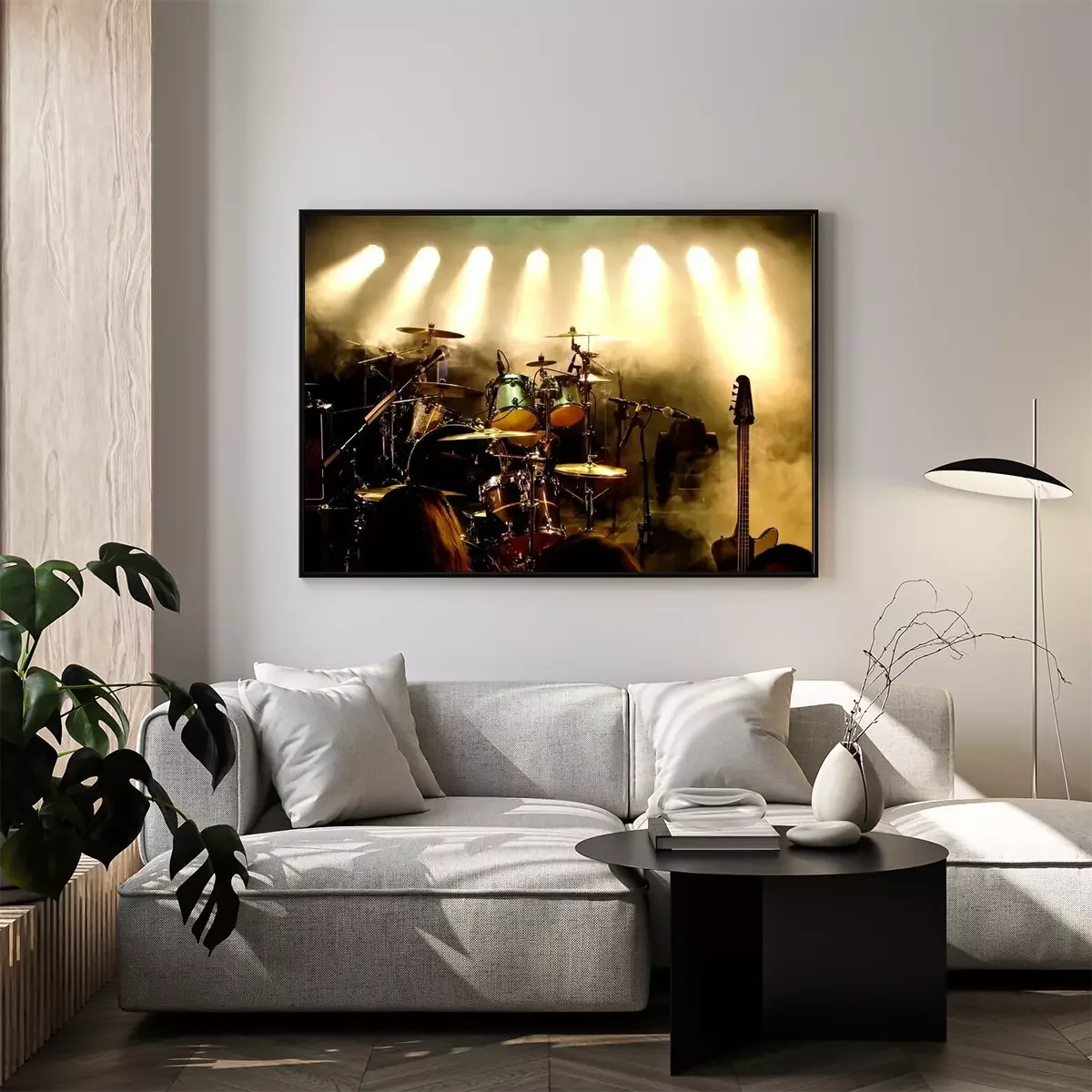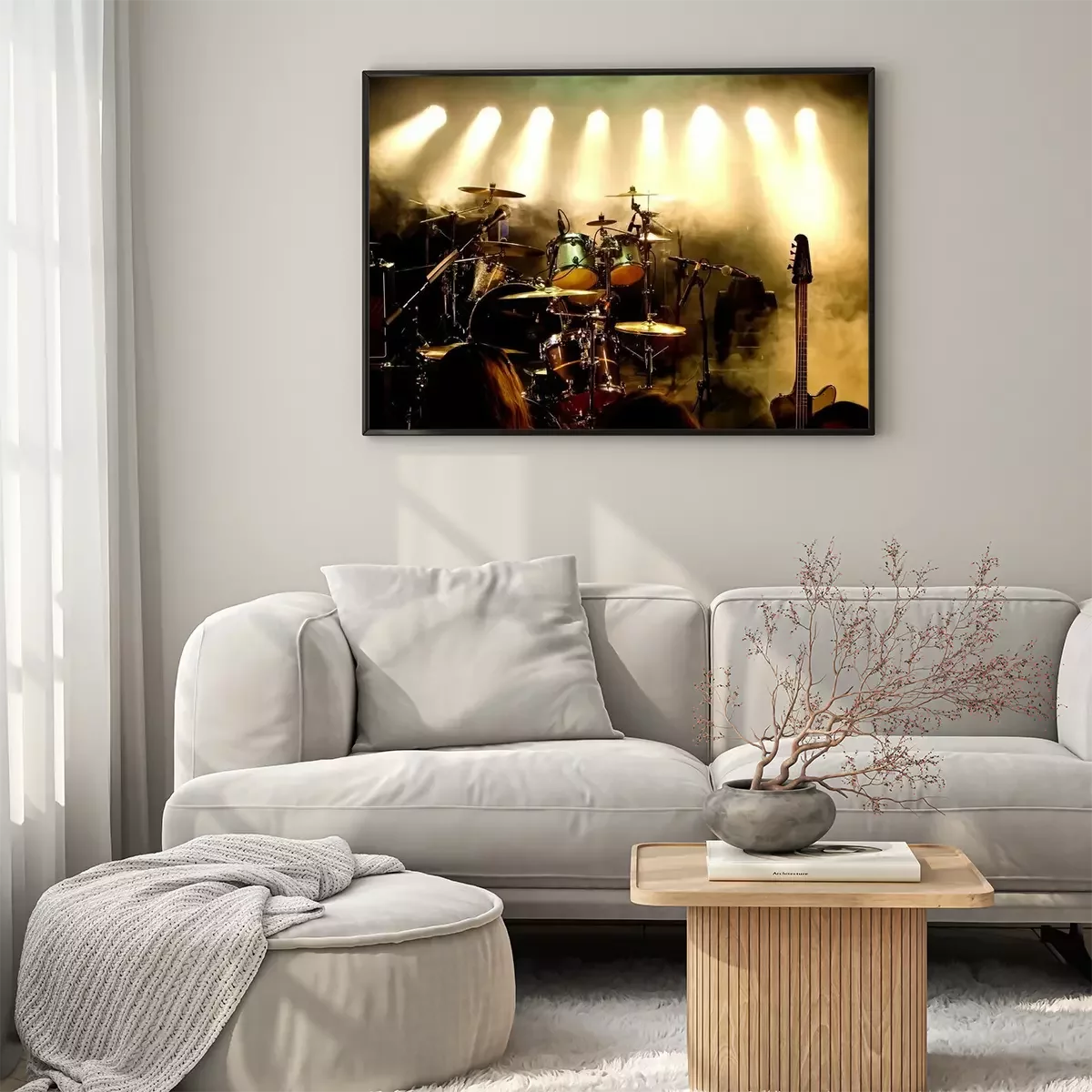 Poster Muziekinstrumenten, Drums / Gitaar op het podium