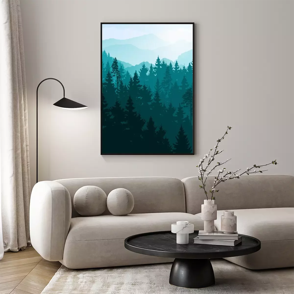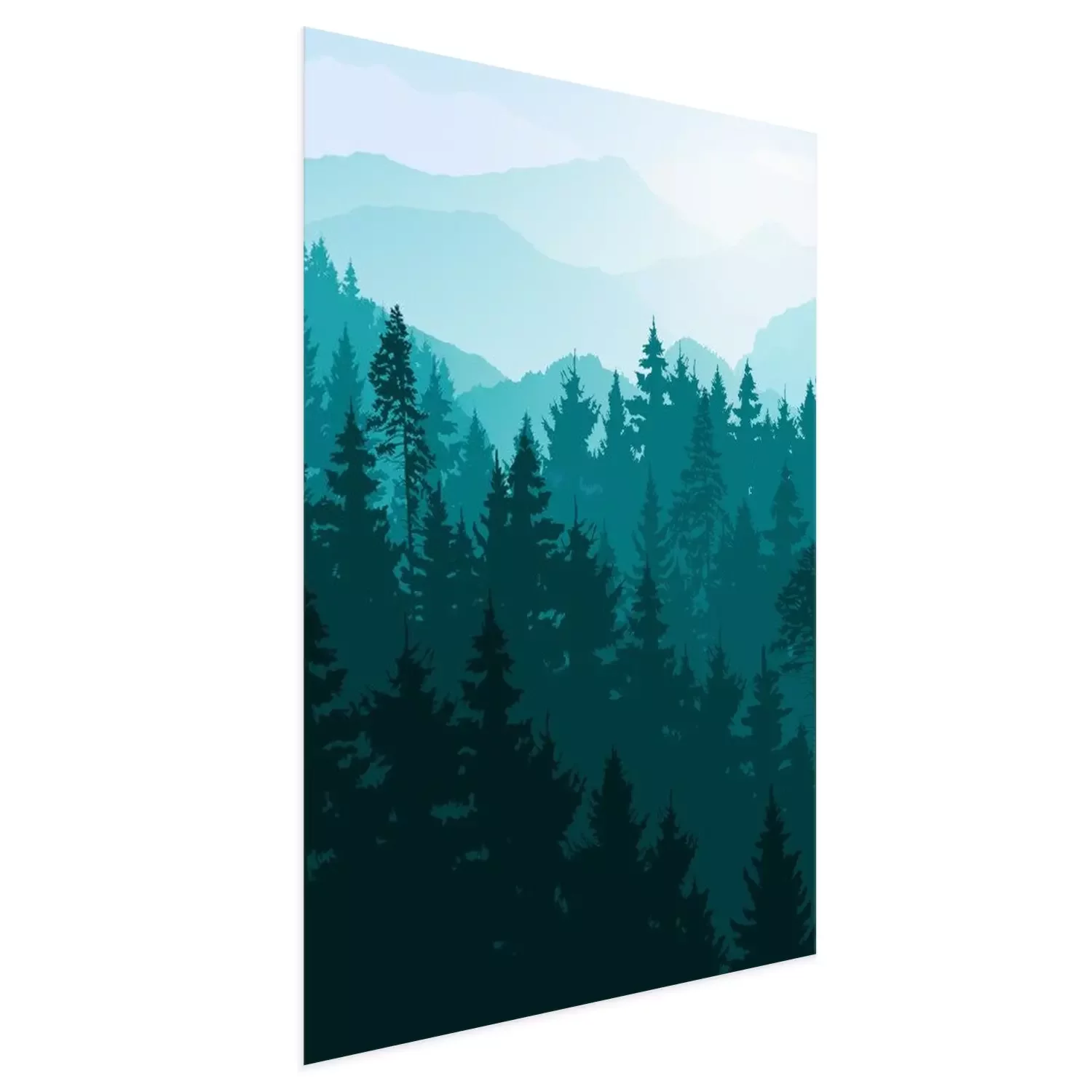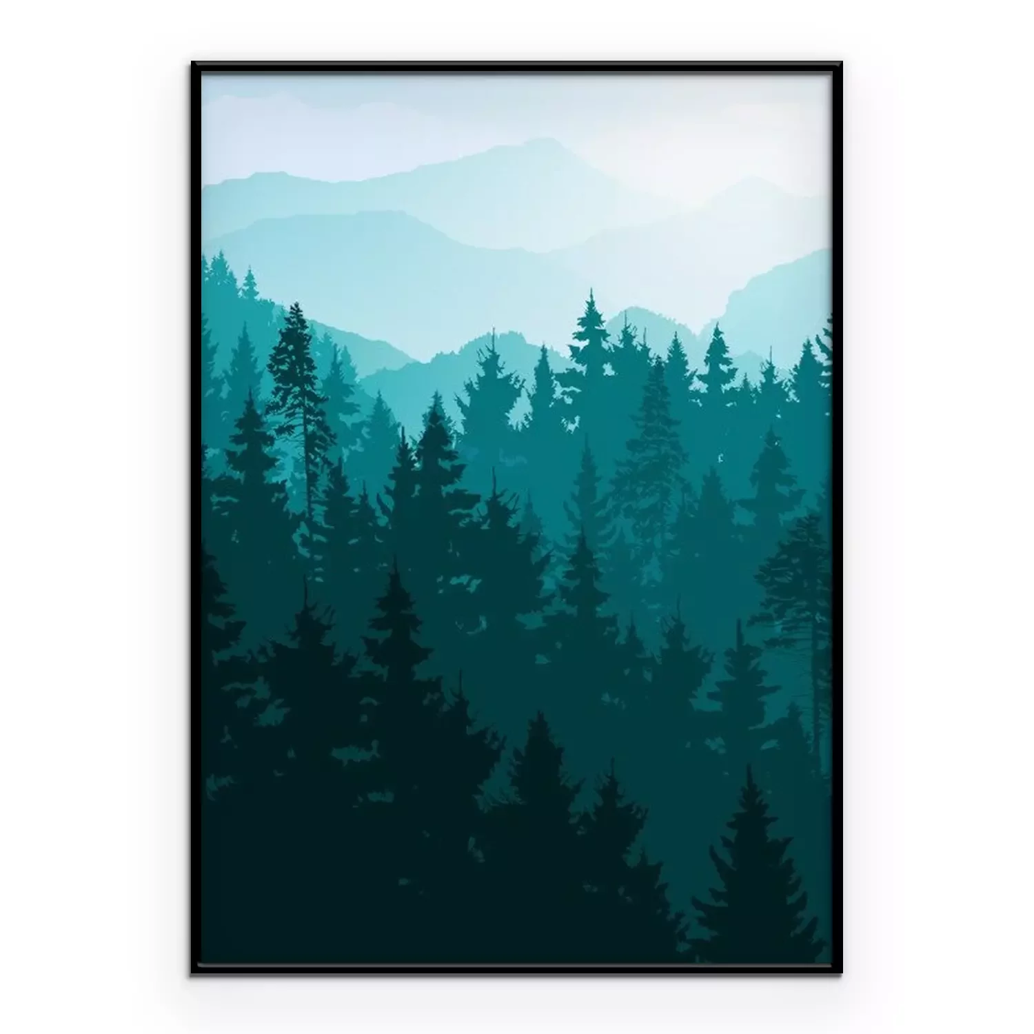Poster: Naaldbomenbos met bergen op de achtergrond