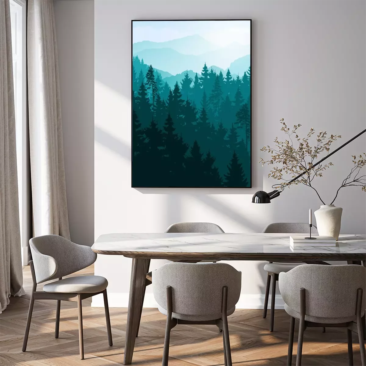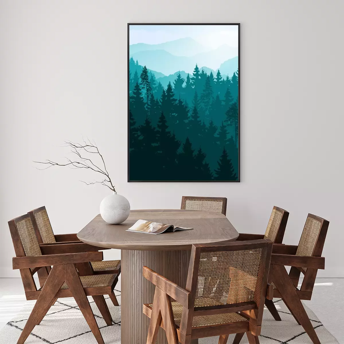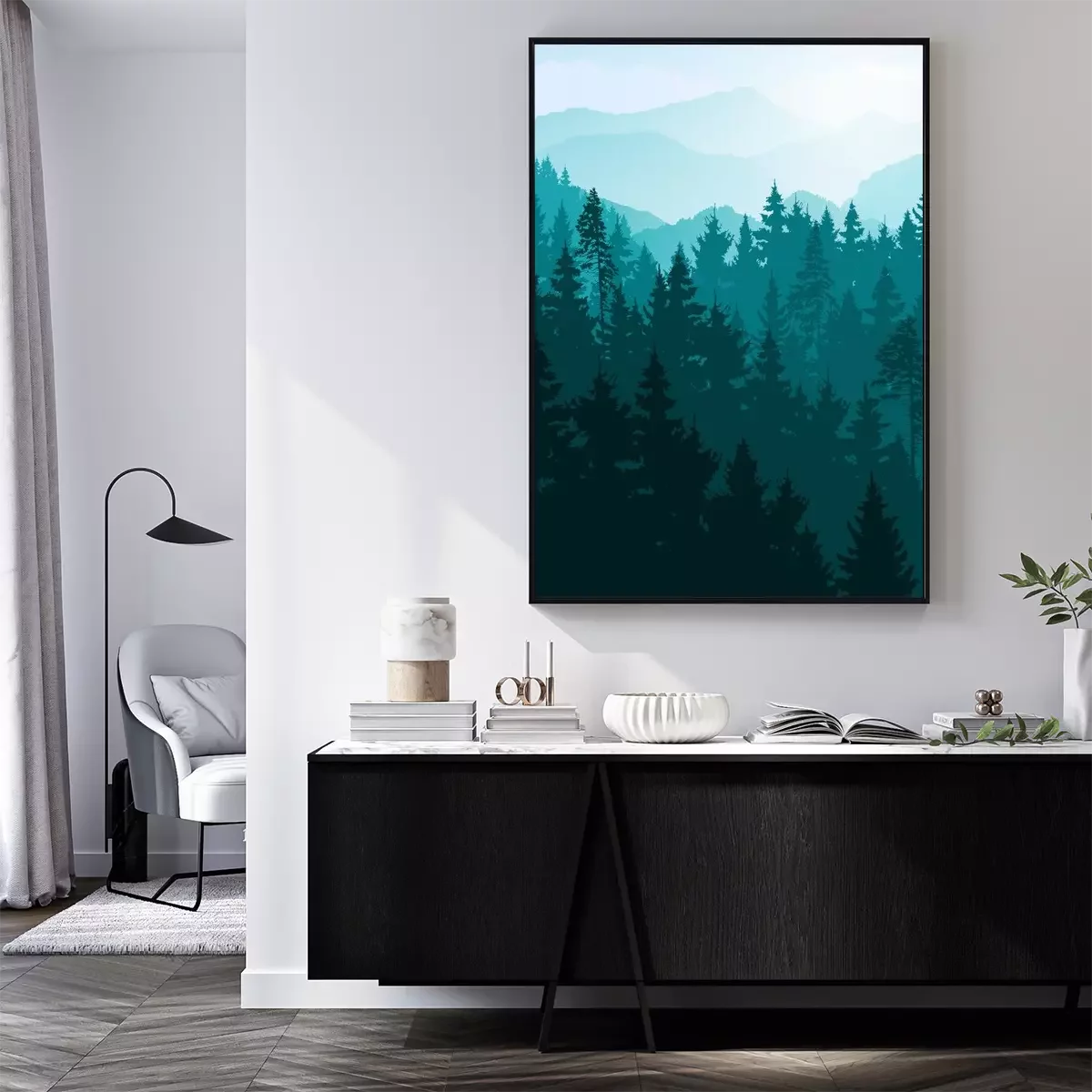 Poster: Naaldbomenbos met bergen op de achtergrond
