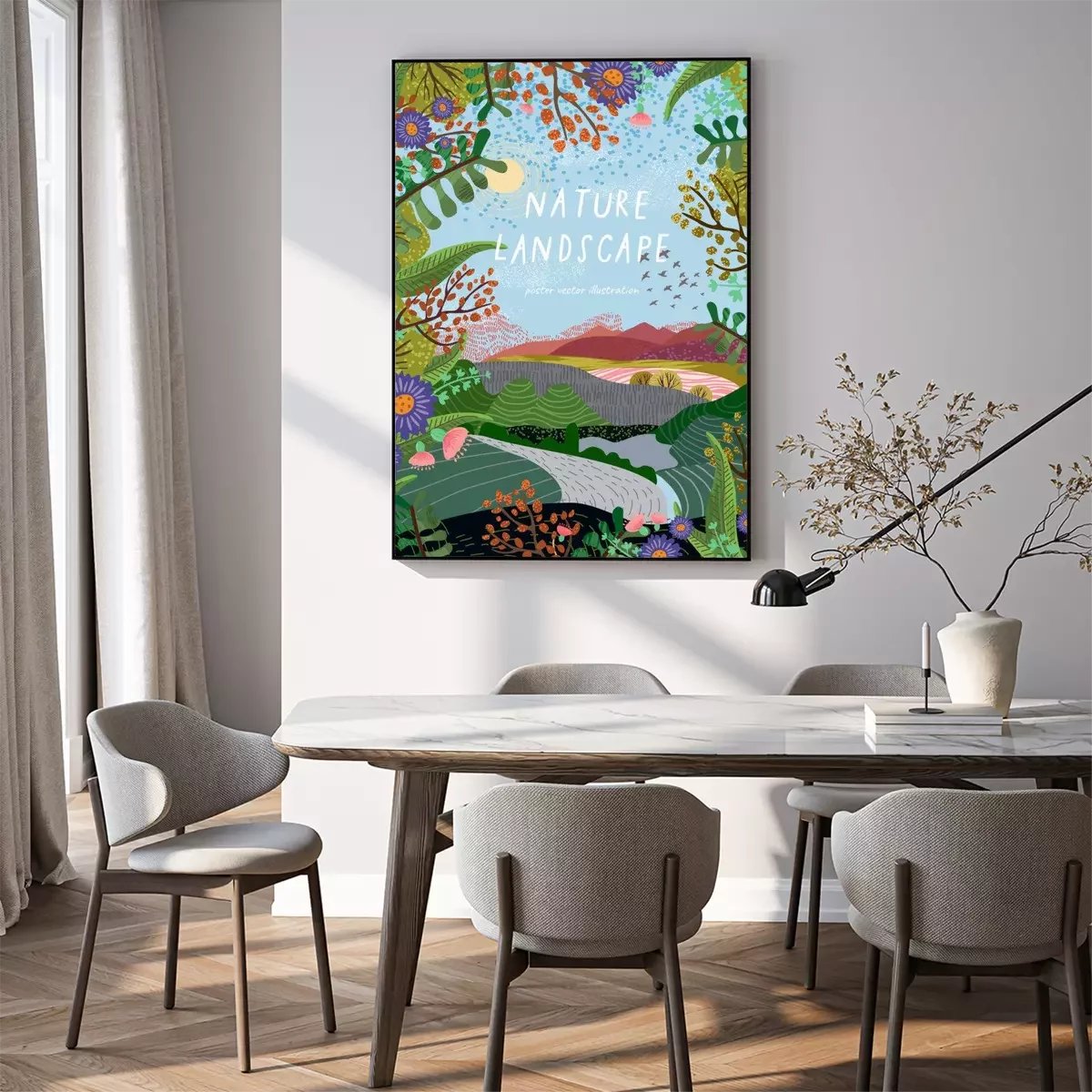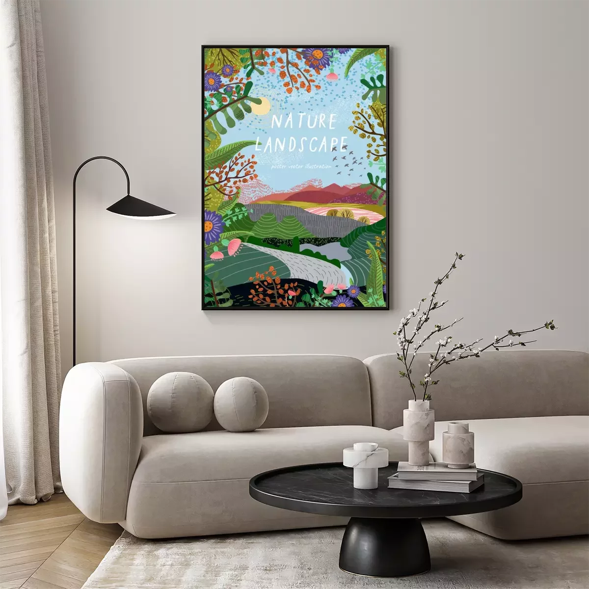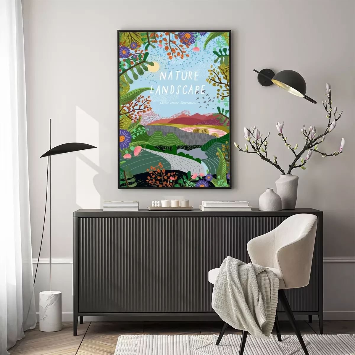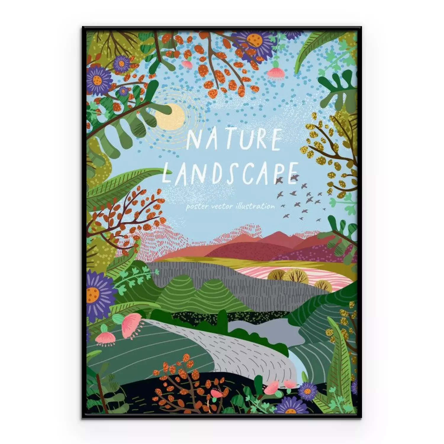 Poster: Nature landscape. Vector background illustration with hills, road, plants and flowers. Summer or spring day